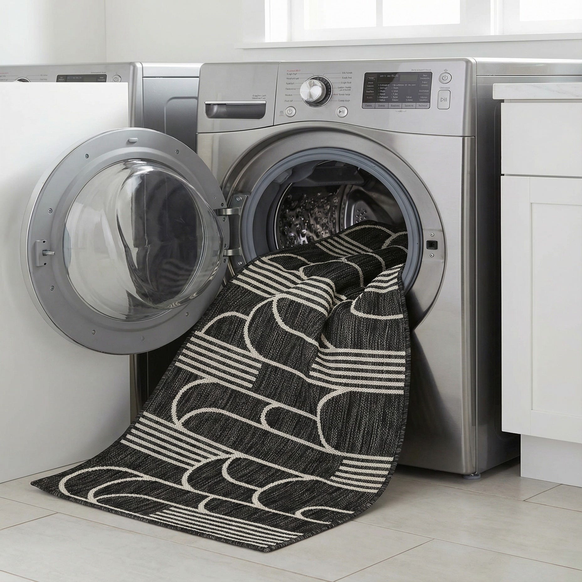 Part of the Outdoor Modern Collection, this 6 Ft Runner rug showcases a bold and dynamic geometric pattern. The black and white color scheme features crisp lines and curves that interplay to create a visually engaging design. The rug's pattern harnesses a minimalist aesthetic, offering versatility to complement a wide range of interior styles, from the stark simplicity of modern decor to the casual ease of coastal-inspired rooms.