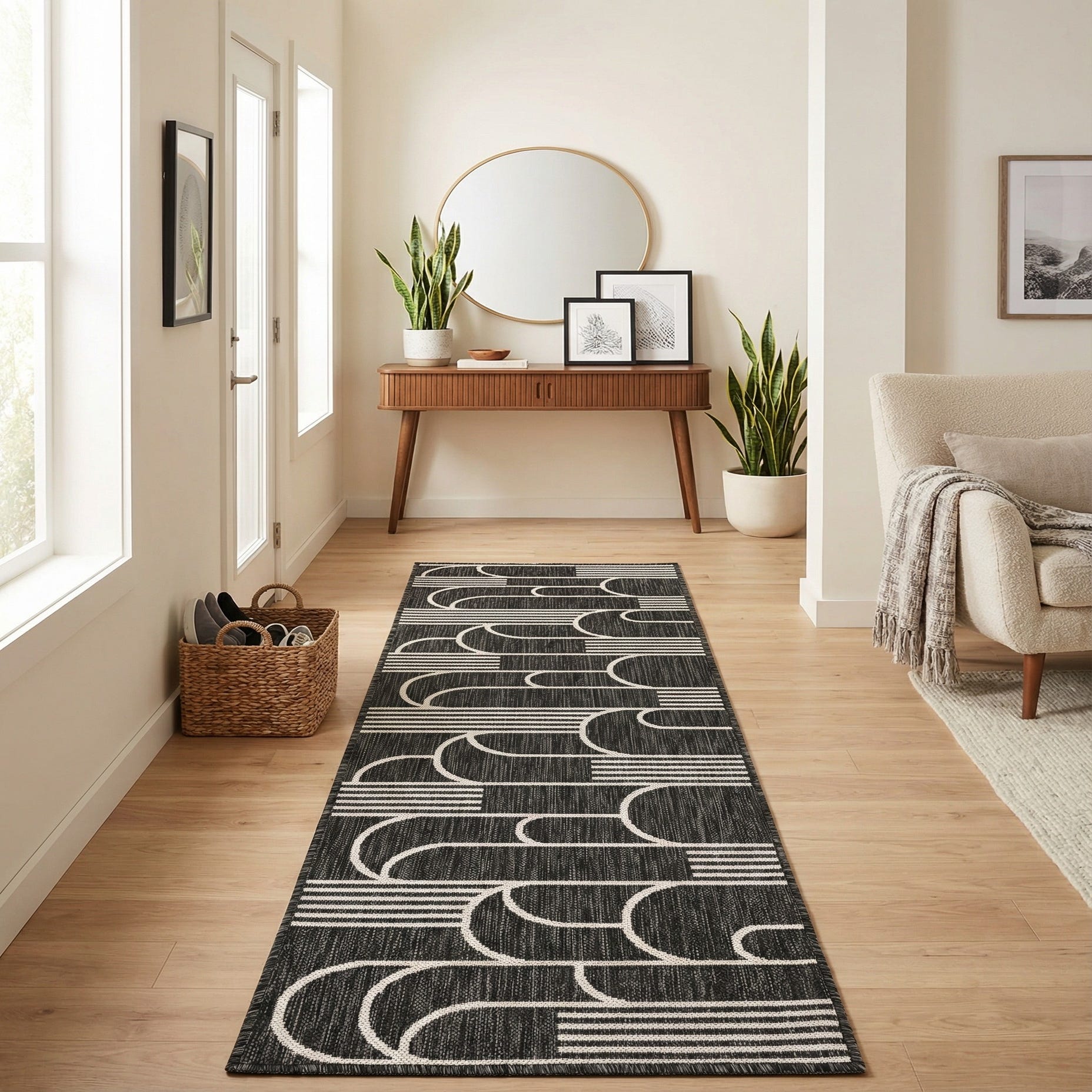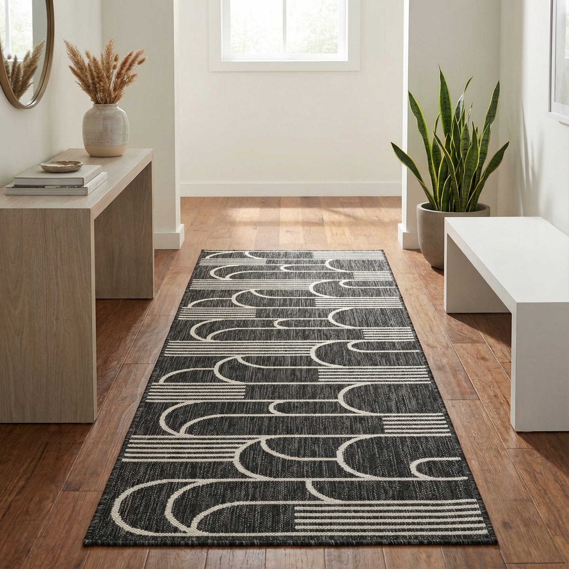 The runner's balanced proportion and impactful design make it a functional and stylish addition to contemporary spaces. Whether integrated into an outdoor living area or used to anchor a sleek indoor corridor, this resilient rug adds a touch of sophistication without overwhelming its surroundings.