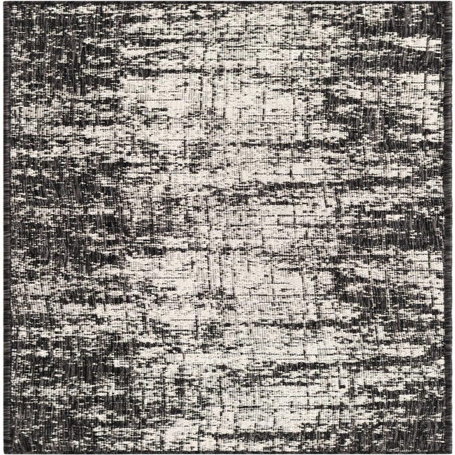 A 6 ft runner rug with a black and white abstract, distressed pattern, suitable for modern indoor or outdoor spaces.