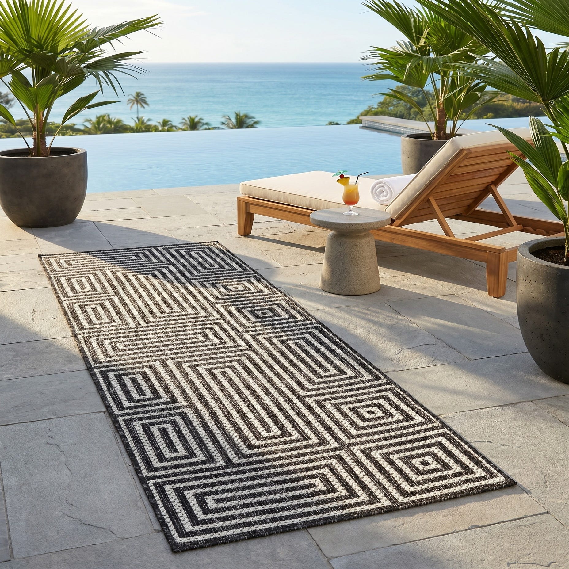 Love the contemporary look of this rug! We are so happy we chose this to accent the blue of our pool with our living area on our lanai. We still are going to add a few more pillows but love the rug to add color.