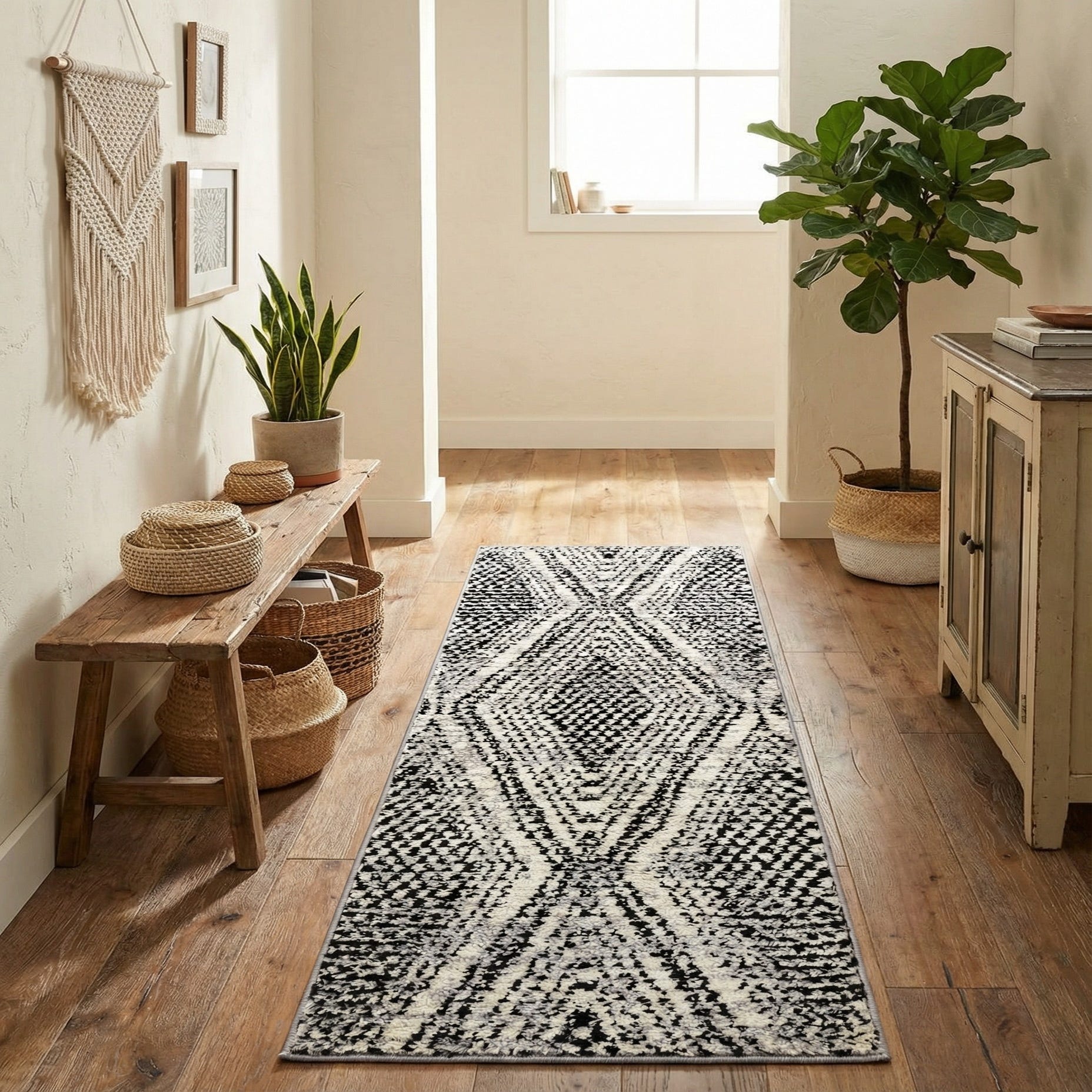 A 6 ft runner rug with a modern Southwestern black and white striped diamond pattern, featuring a textured pile.
