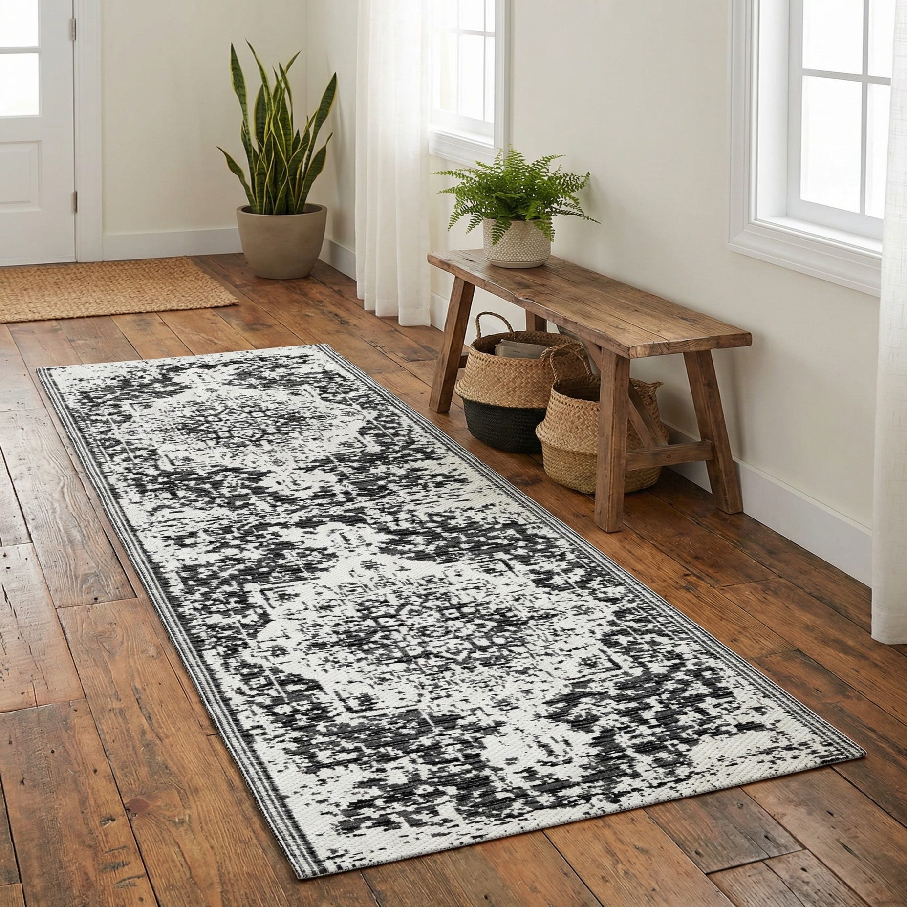 A 6 ft runner rug featuring a distressed black and white traditional medallion pattern with a textured flatweave, suitable for hallways or patios.