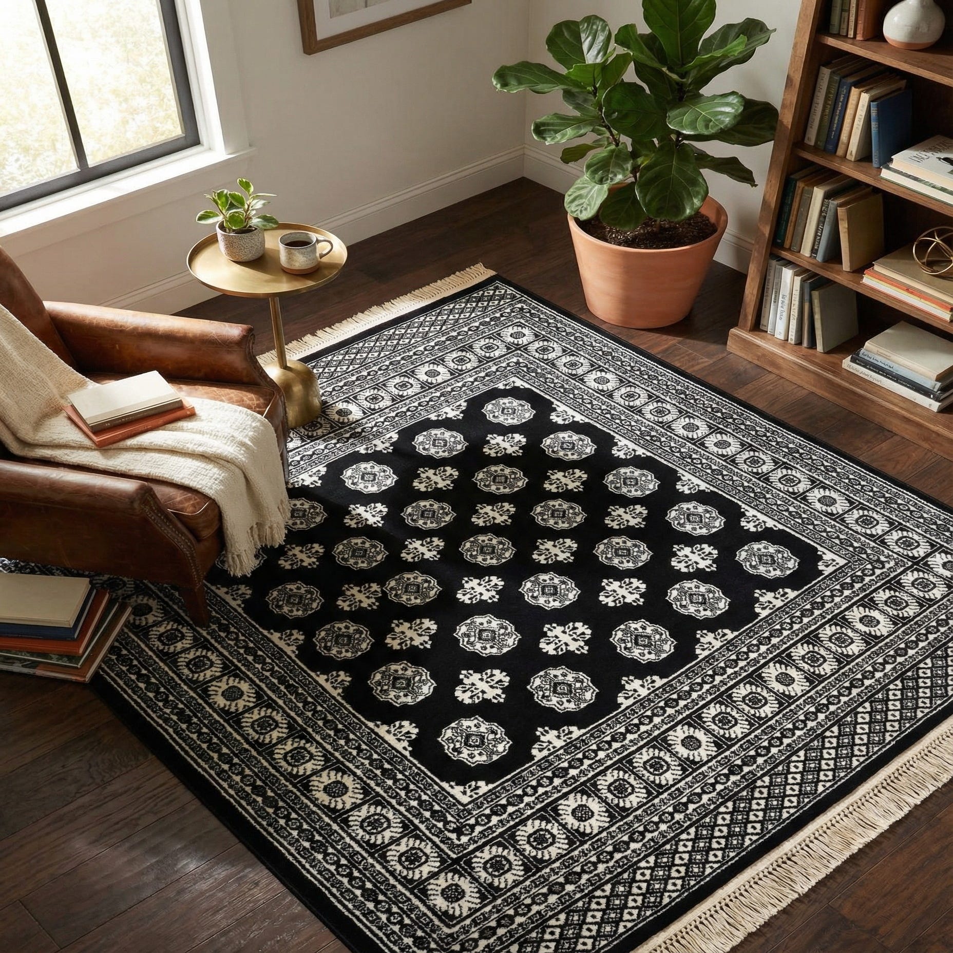 Primary color is Black and White. Colors in this rug include: Black and White, Ivory.