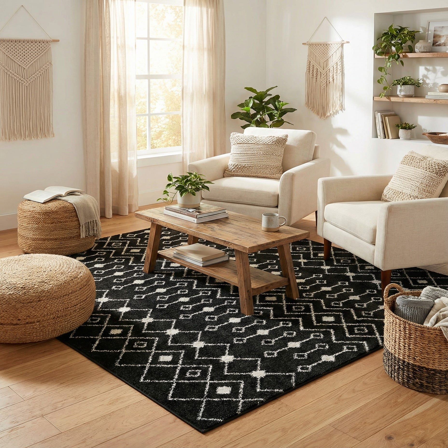 The square format works well as the centerpiece of a compact seating area, beneath a coffee table, or centered in a bedroom to anchor the bed and nightstands. Its clean geometry complements mid-century modern and minimalist interiors, and it also provides a strong graphic base for bohemian or industrial schemes — layer with warm wood, leather, or neutral linens to balance the monochrome look.