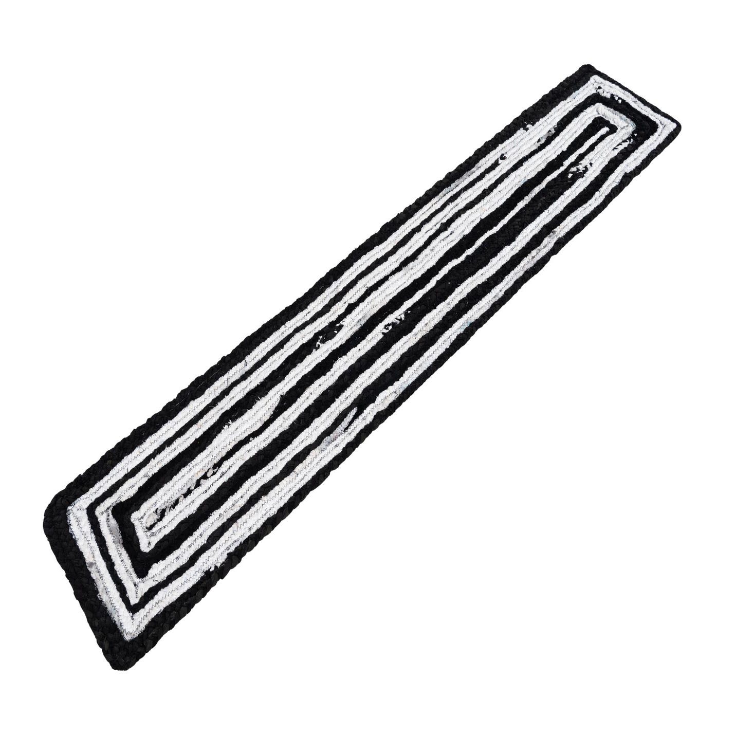 Hand-braided from 100% cotton, this runner pairs a bold black-and-white palette with a linear, concentric stripe pattern that follows the length of the piece. The braided bands create a low-profile, textured surface you can feel beneath your hands—each row shows tight stitching and the subtle irregularities of woven cotton for a handcrafted appearance. Alternating black and white strips form a graphic, modern rhythm that reads clean and structured on a table or narrow surface.