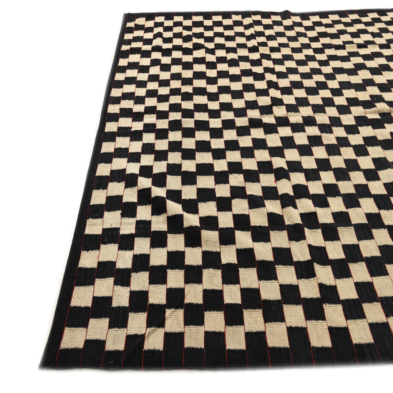 A 6x9 rectangular flatweave rug featuring a bold black and ivory checkerboard pattern, suitable for a modern living room.