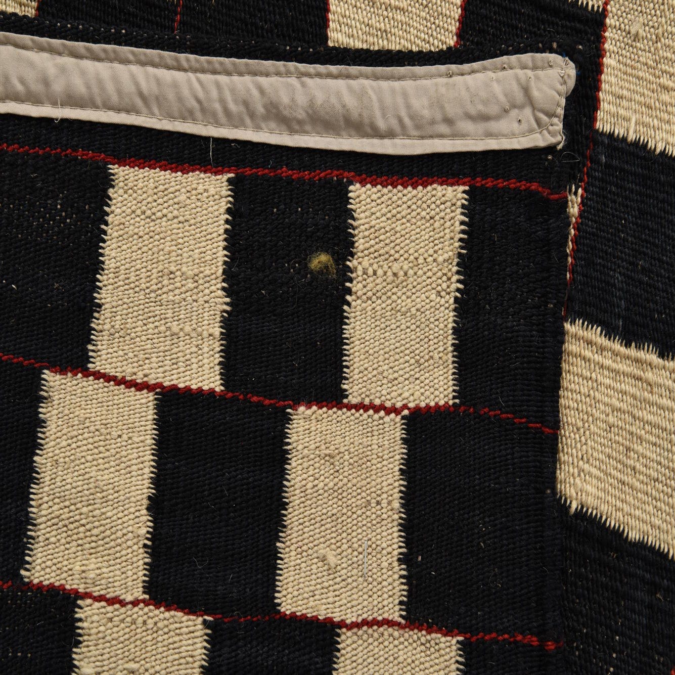 Primary color is Black and White. Colors in this rug include: Black and White, Red.