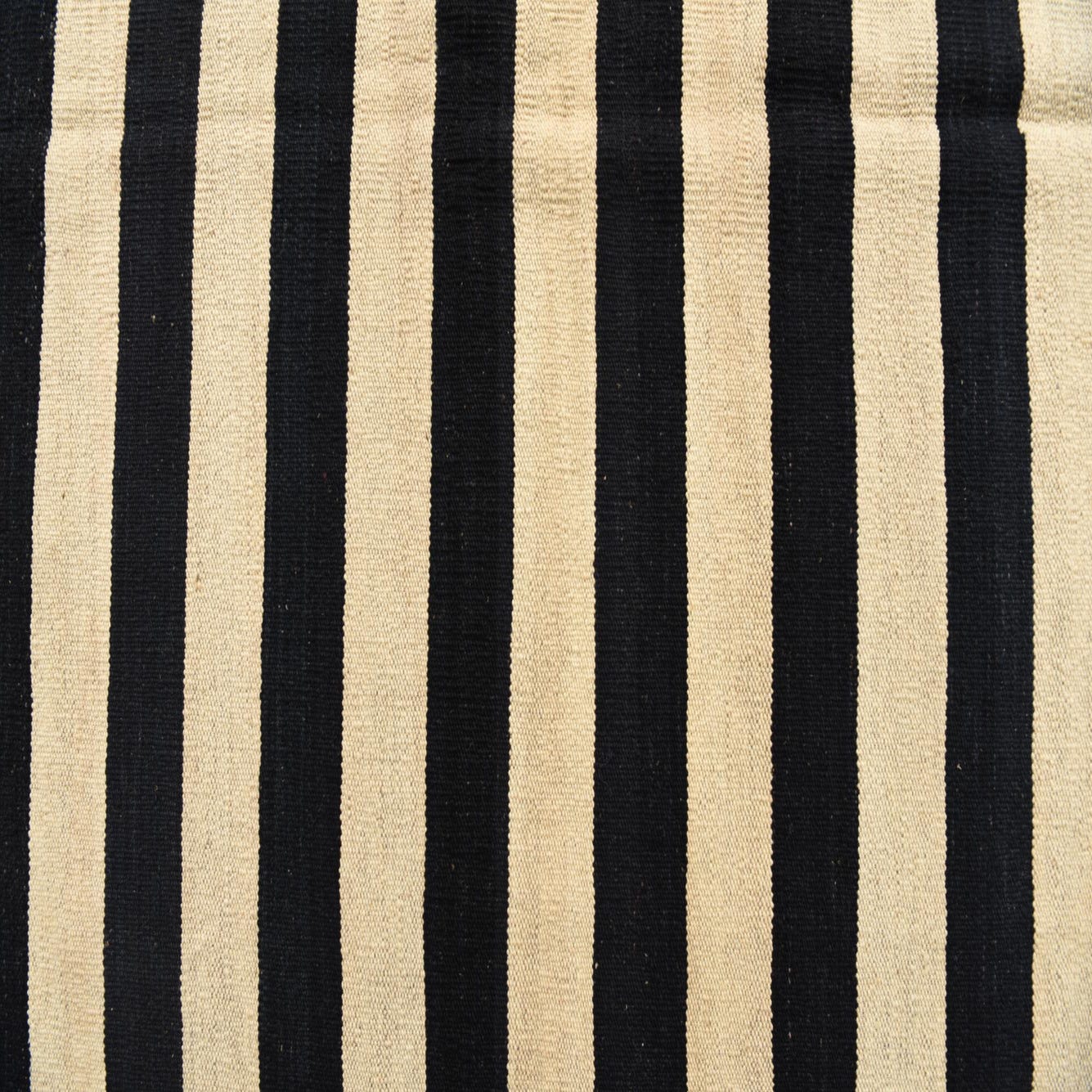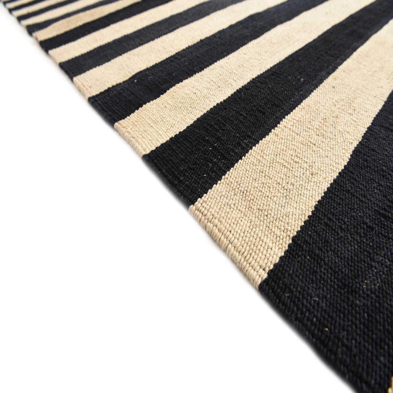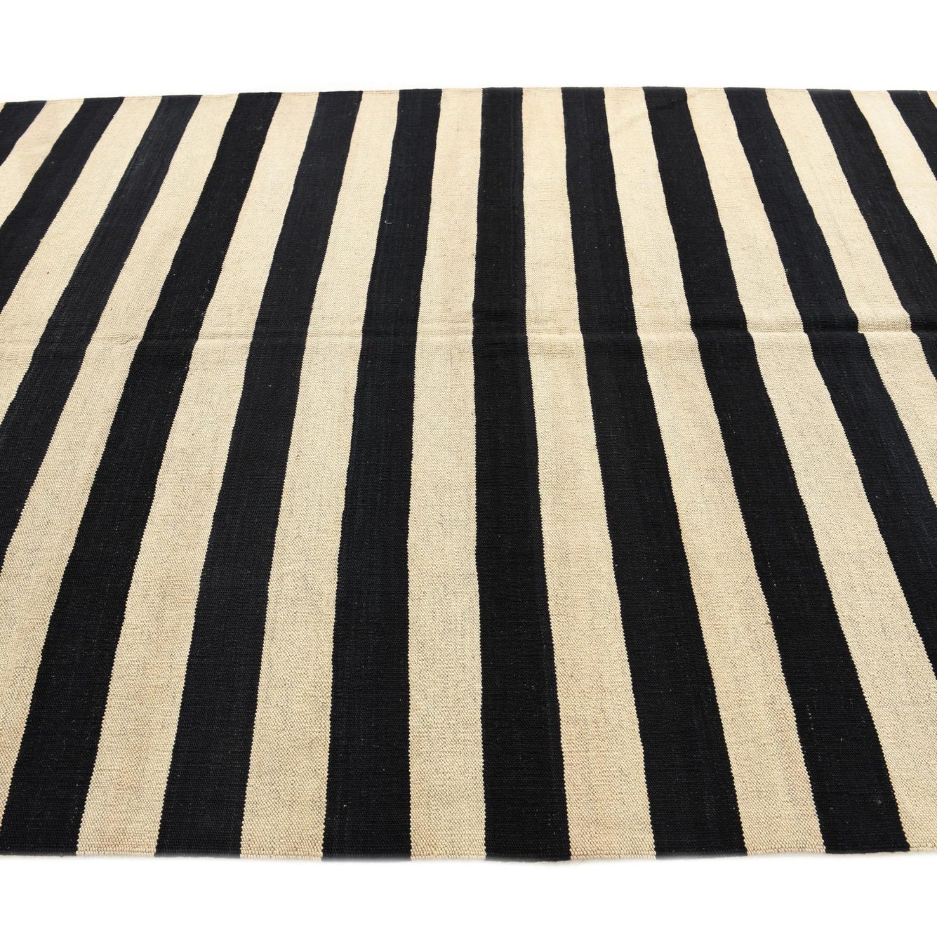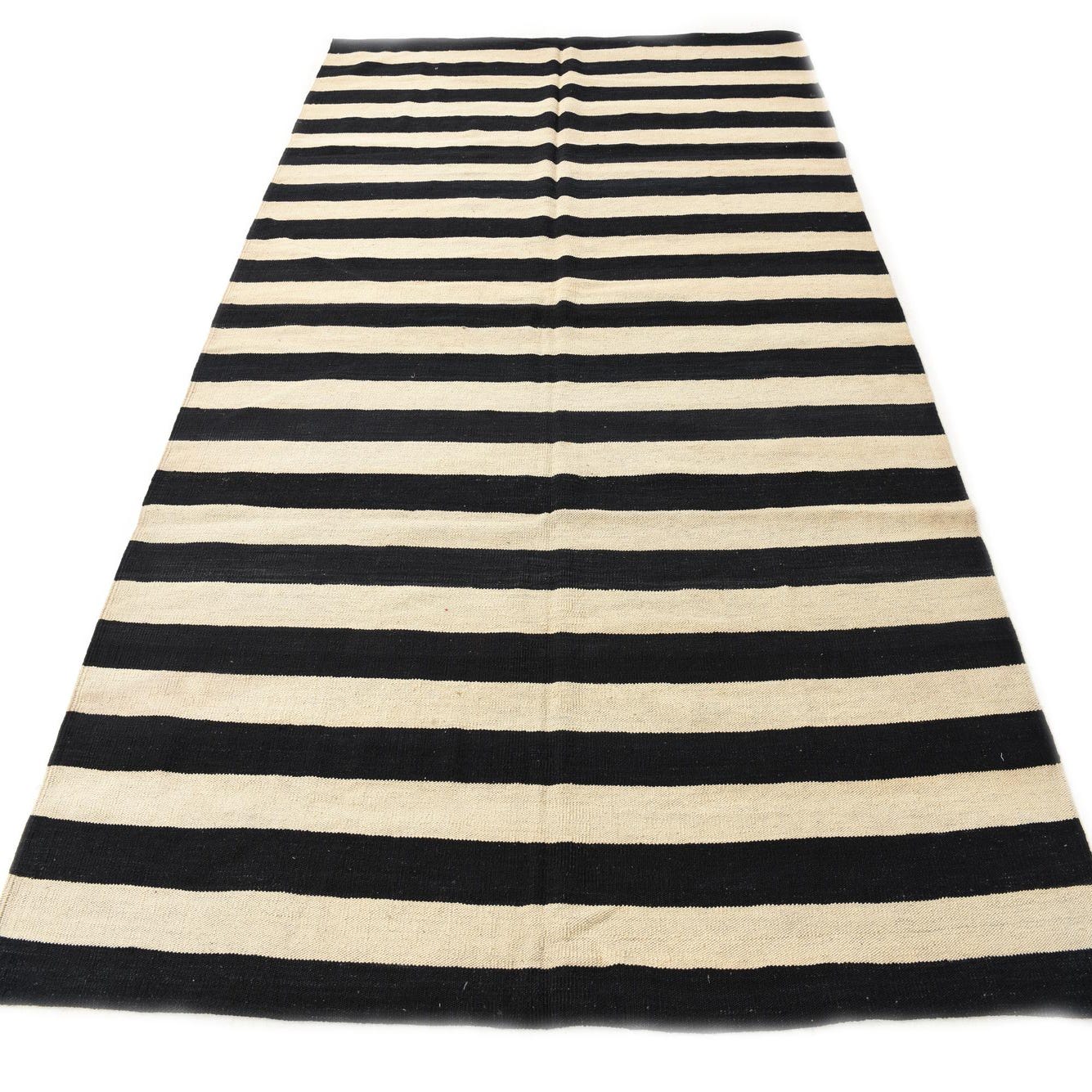 Bold, clean stripes run across this hand-woven wool kilim in a classic black and white palette. The alternating bands are slightly irregular, a natural result of flatweave construction that gives the pattern a handmade character and subtle visual rhythm. The surface is low-profile and tightly woven, so it feels firm underfoot with the soft, slightly textured hand typical of 100% wool.