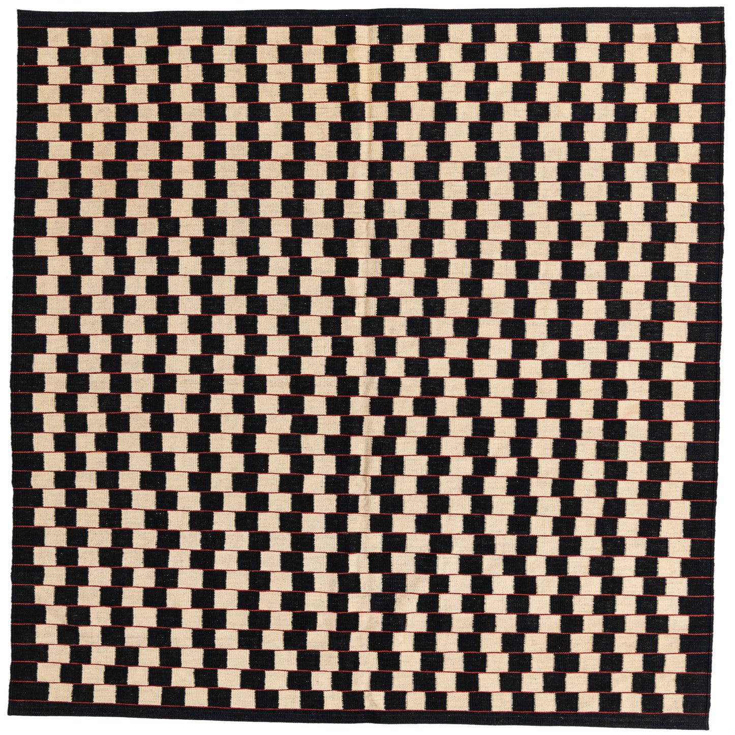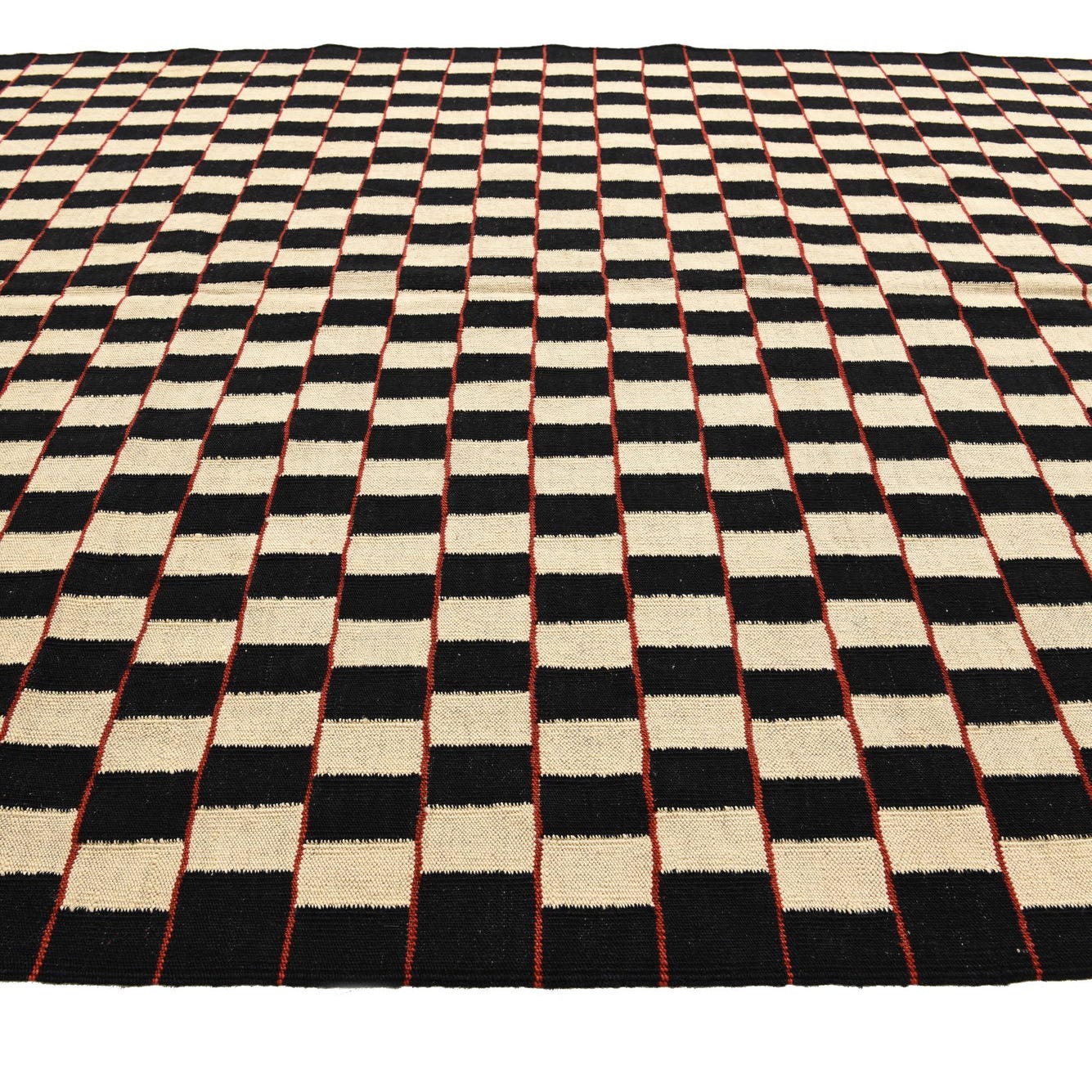 A 6x9 rectangular flatweave rug with a bold black and ivory checkerboard pattern, accented by thin red lines.