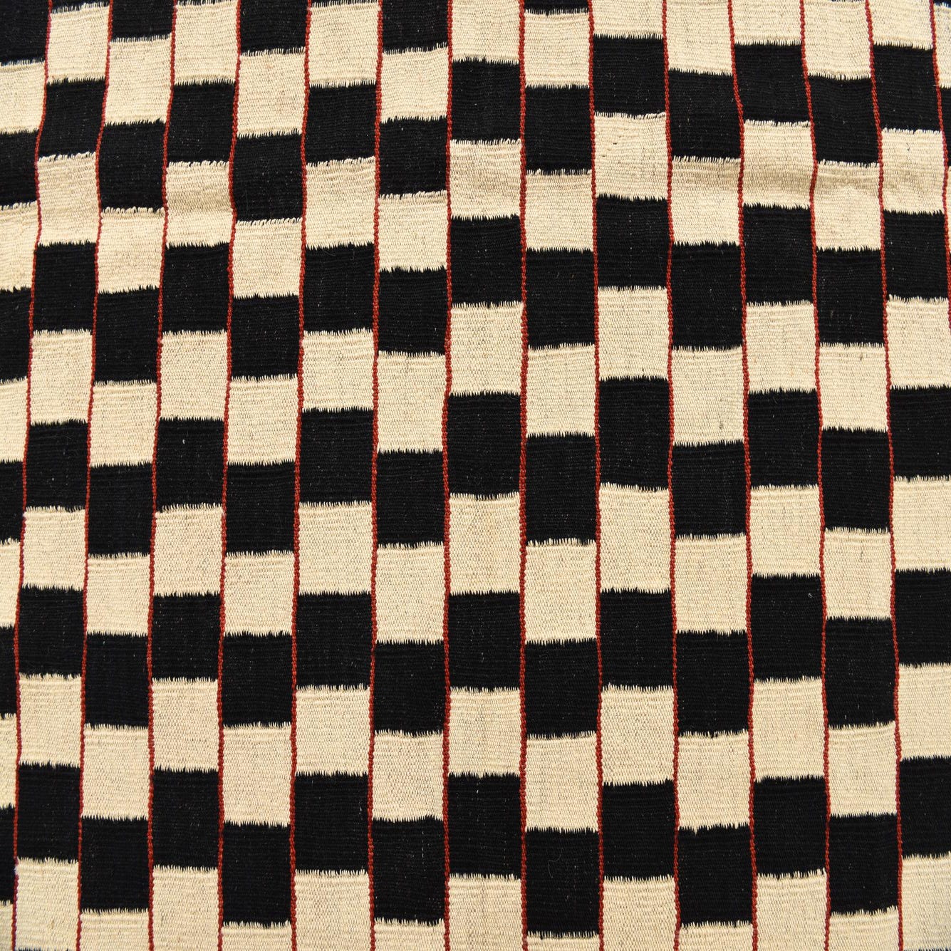 The Kilim Modern 6x9 rug is a compelling addition to any contemporary or minimalist space, weaving together traditional craftsmanship with a bold, graphic design. Its hand-woven construction of 100% wool ensures durability and a soft textured feel underfoot. The pattern boasts a dynamic array of black and white blocks punctuated by strategic pops of red that deliver an eye-catching contrast and a modern aesthetic.