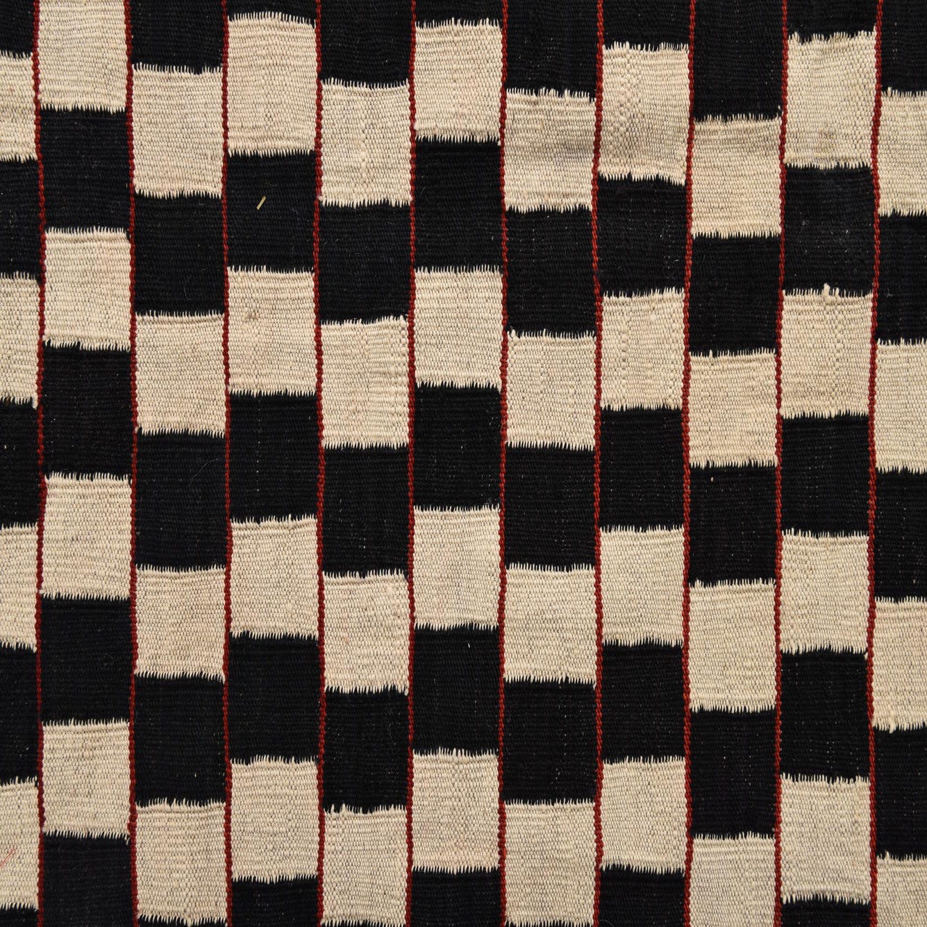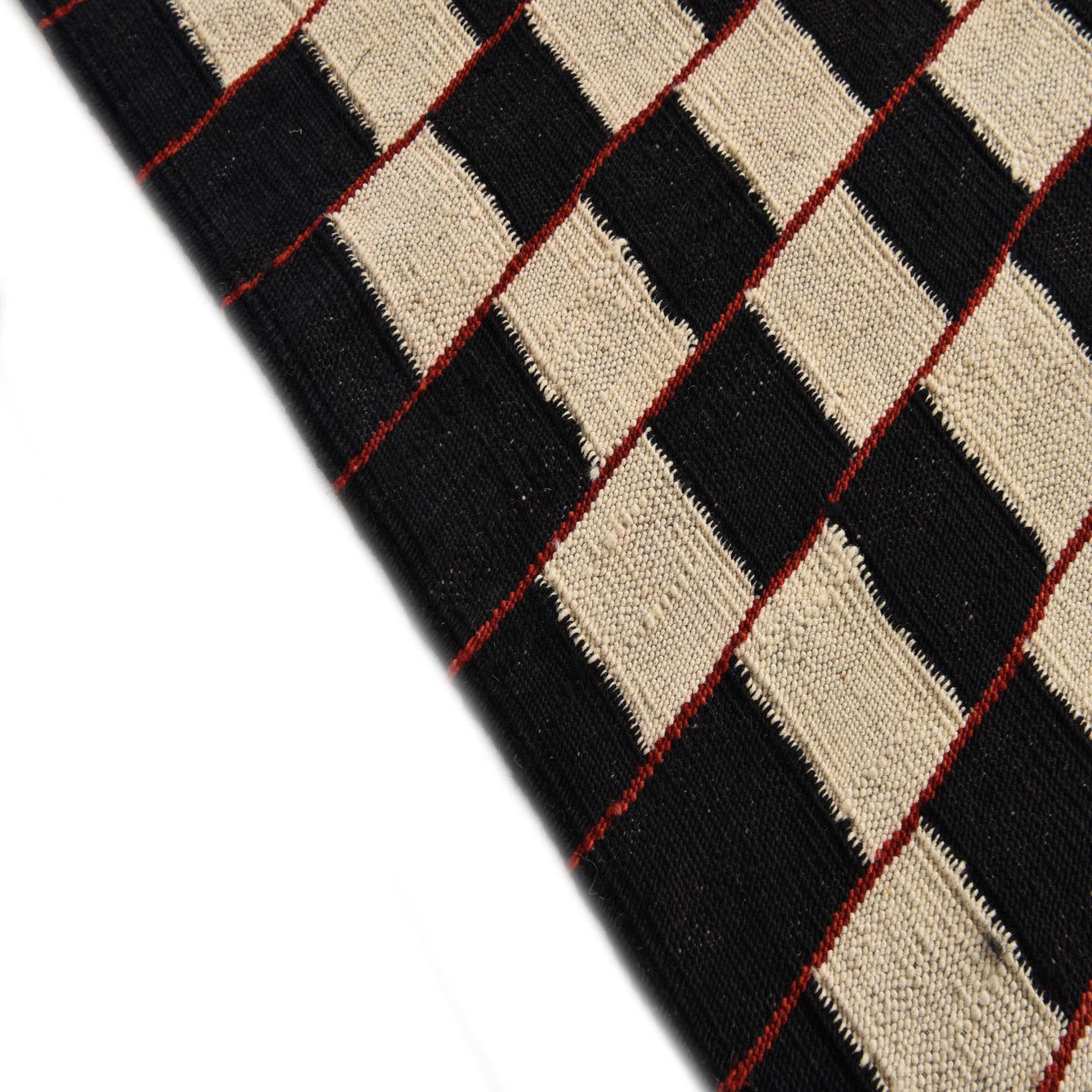 Part of the Kilim Modern collection, this hand-woven 6x9 rug is crafted from 100% wool, offering both durability and a soft, tactile surface underfoot. The rug showcases a bold, geometric pattern featuring a black and white background with dynamic red accents that draw the eye. The striking contrast of the design brings a contemporary edge to this traditional flatweave construction.