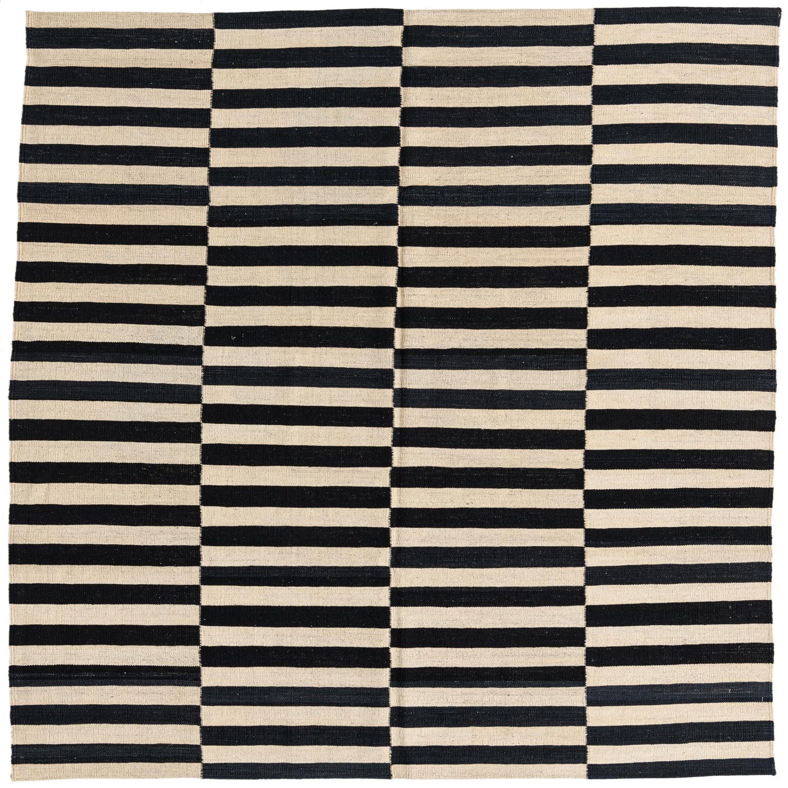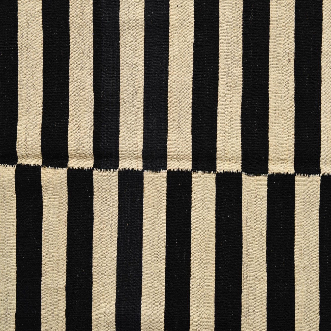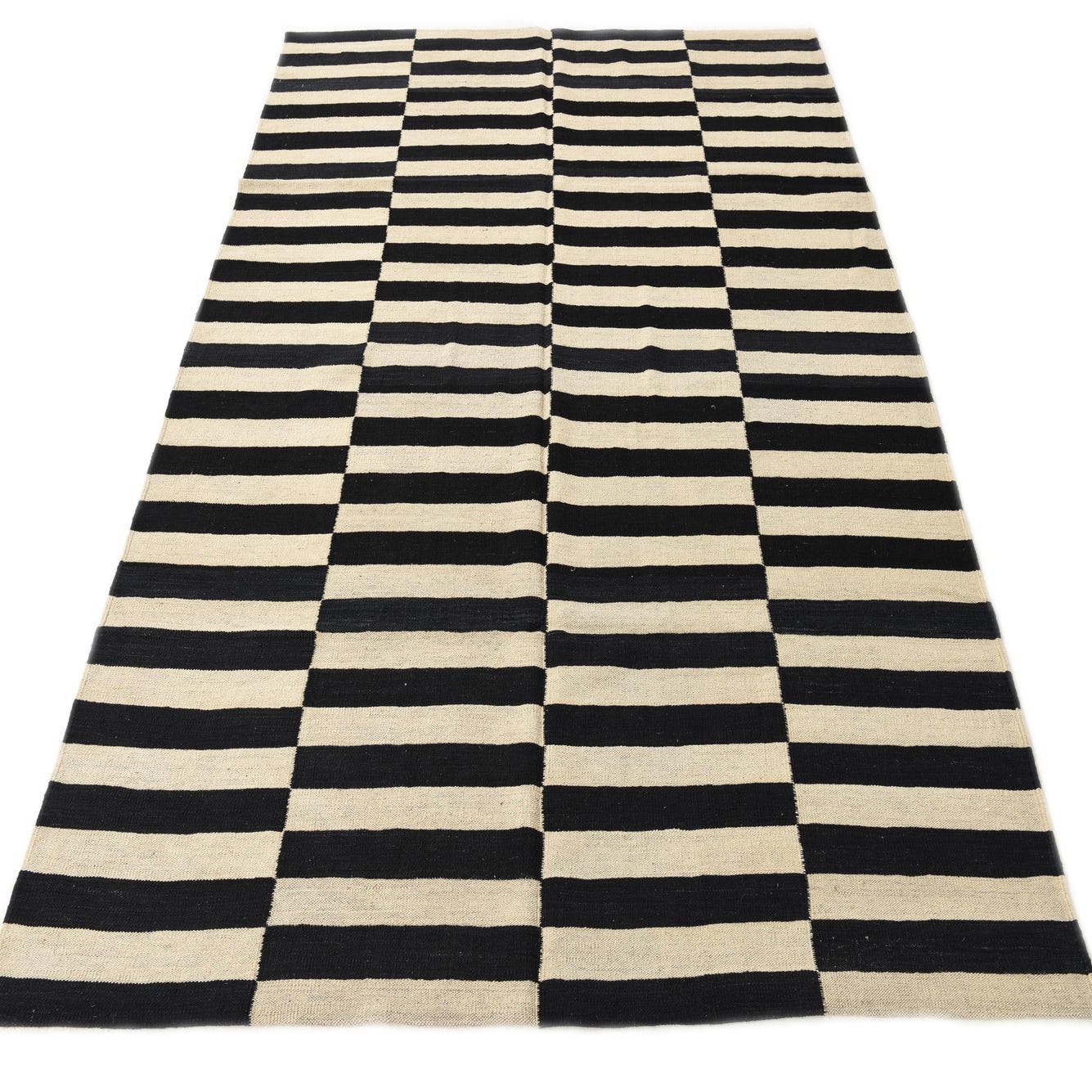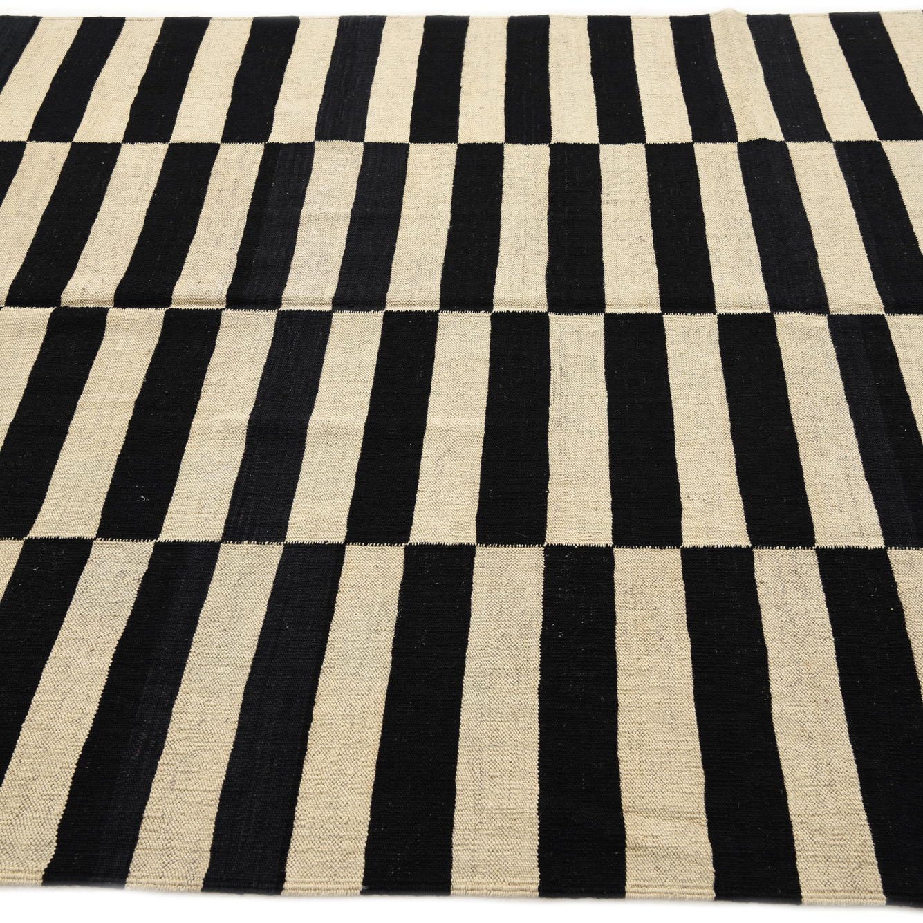 The Kilim Modern collection presents a 6x9 hand-woven rug made of 100% wool, offering a durable and tactile experience underfoot. This contemporary piece features a striking black and white striped pattern, embracing the timeless contrast that commands attention in any space. The crisp, linear design lends a sense of order and sophistication to the rug, making it a versatile choice for a variety of decorating styles.