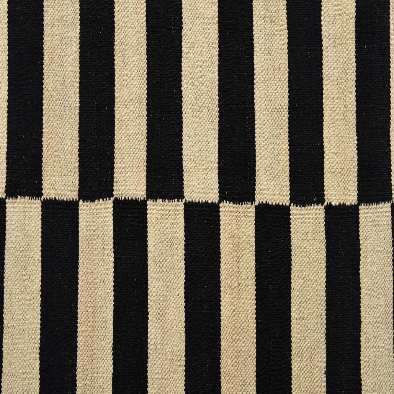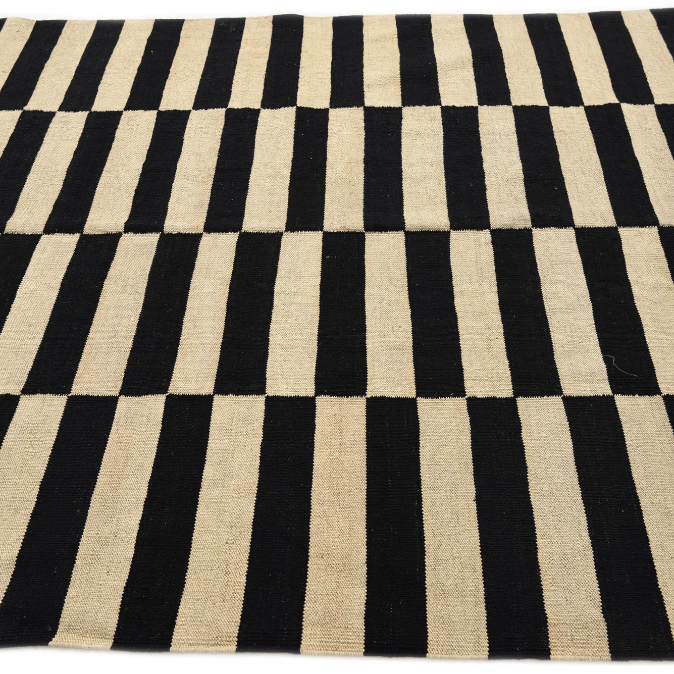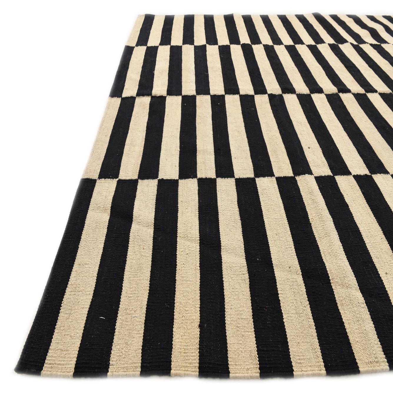 A 6x9 rectangular Kilim Modern rug with a bold black and ivory striped pattern, suitable for a living room.