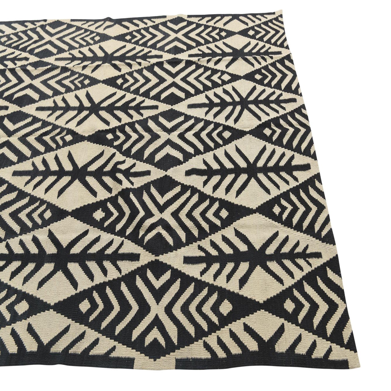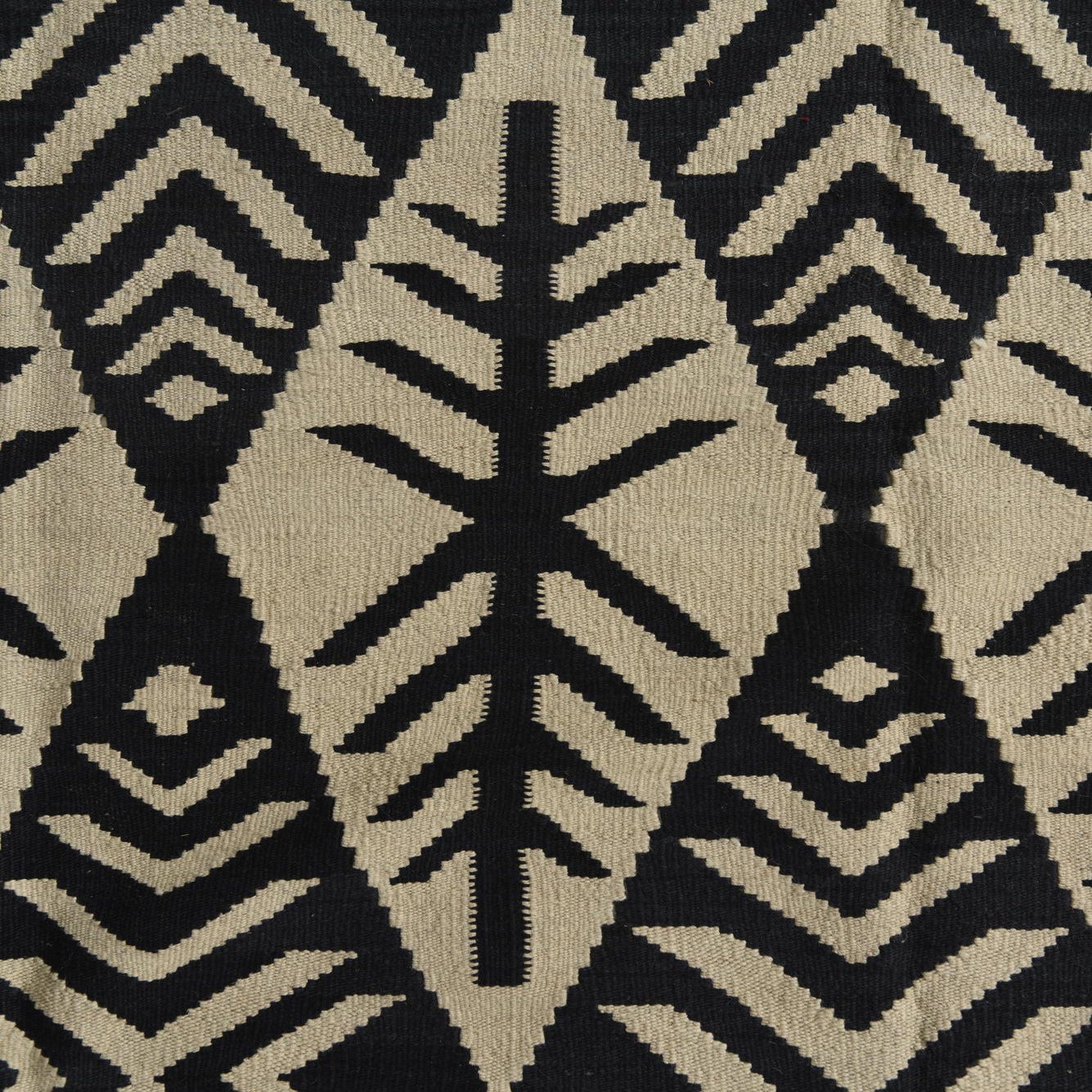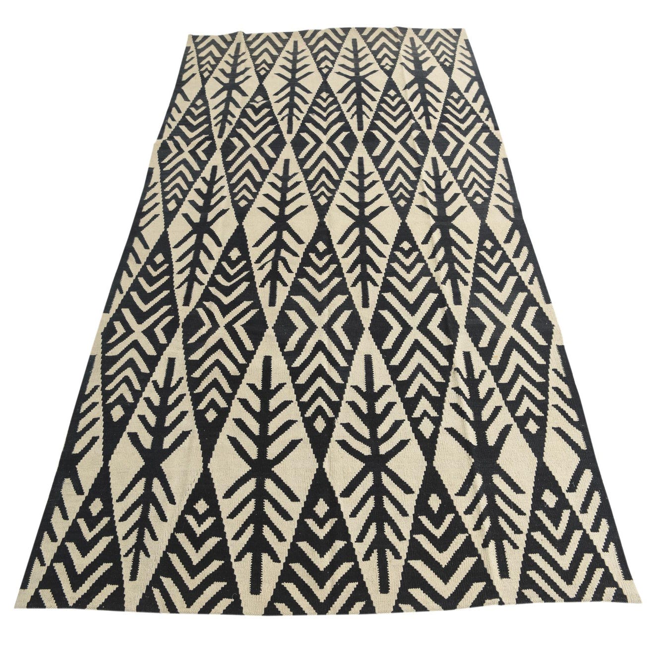 A 6x9 rectangular flatweave rug featuring a bold tribal pattern of black geometric trees and diamonds on an ivory background.