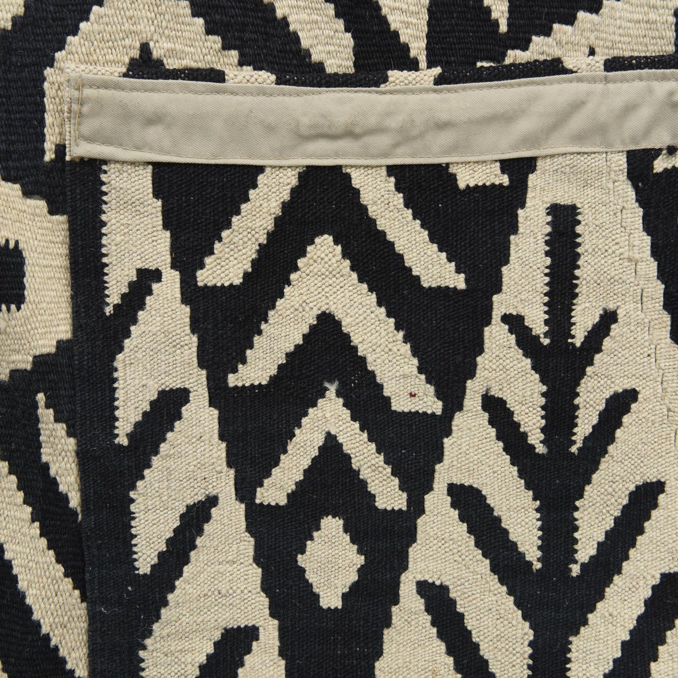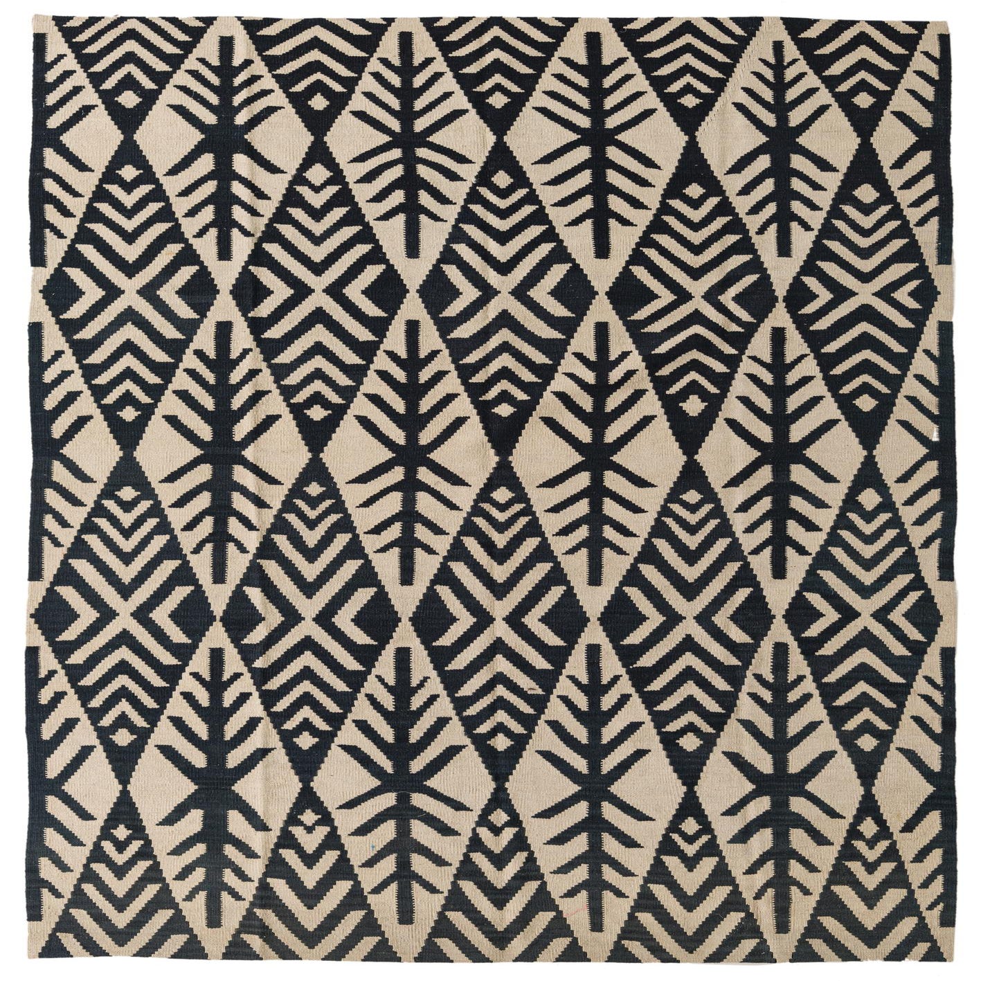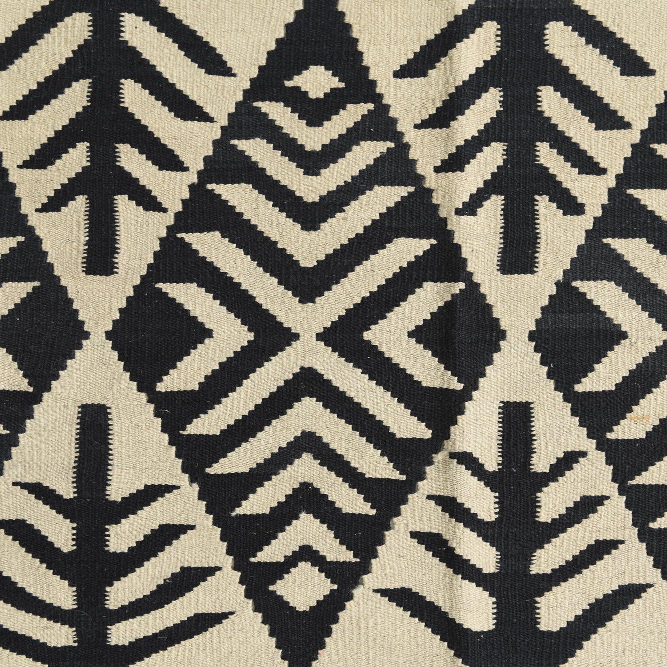 A 6x9 rectangular flatweave rug featuring a bold tribal pattern of black geometric trees and diamonds on an ivory background.