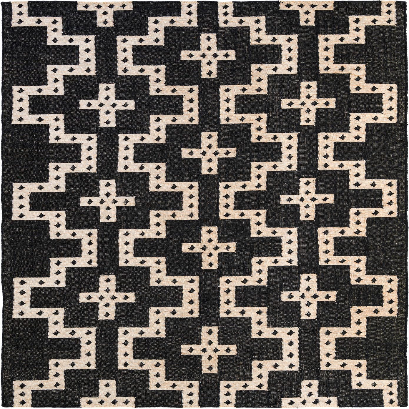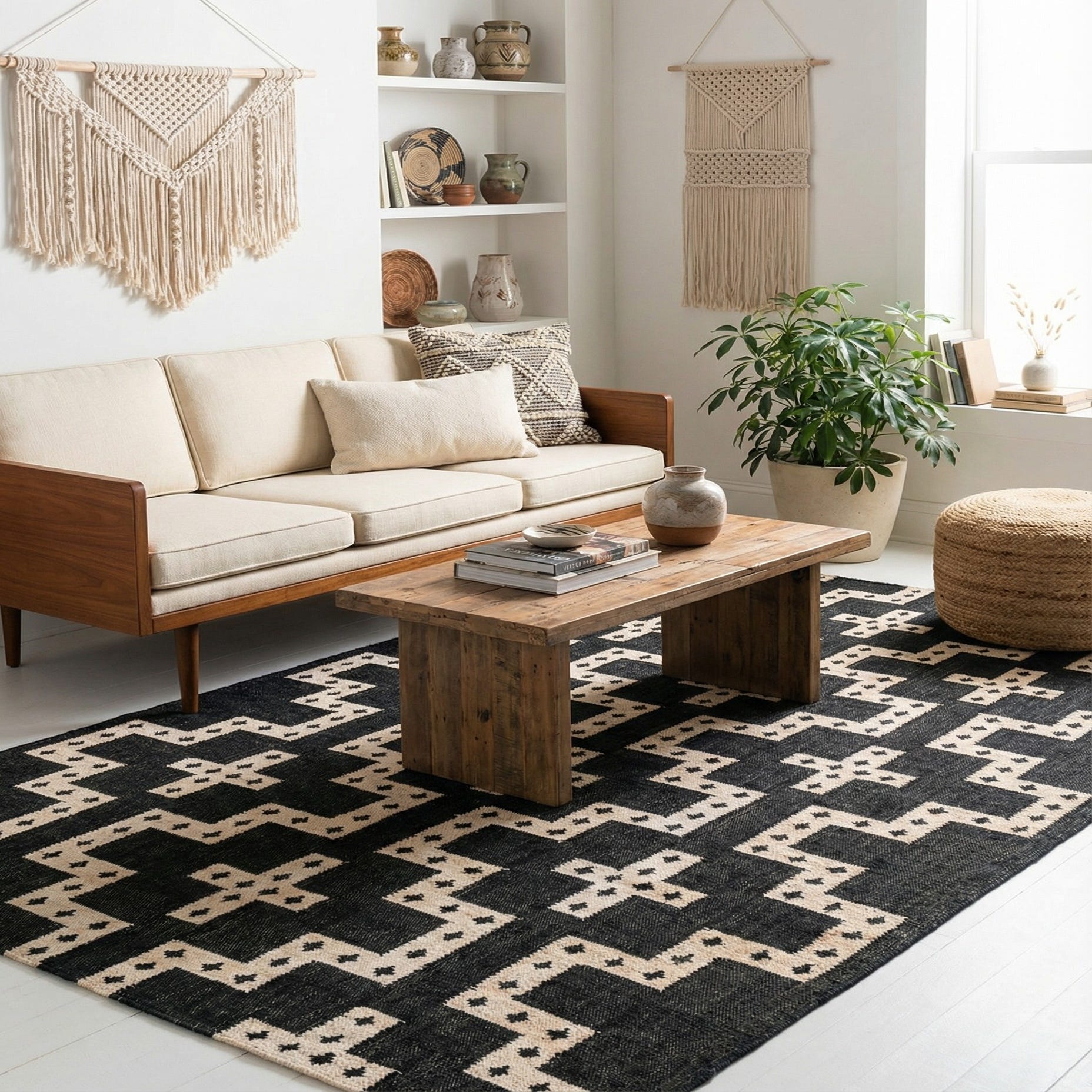 A 6x9 rectangular Kilim Wool rug featuring a bold black and ivory tribal geometric pattern, perfect for a modern living room.