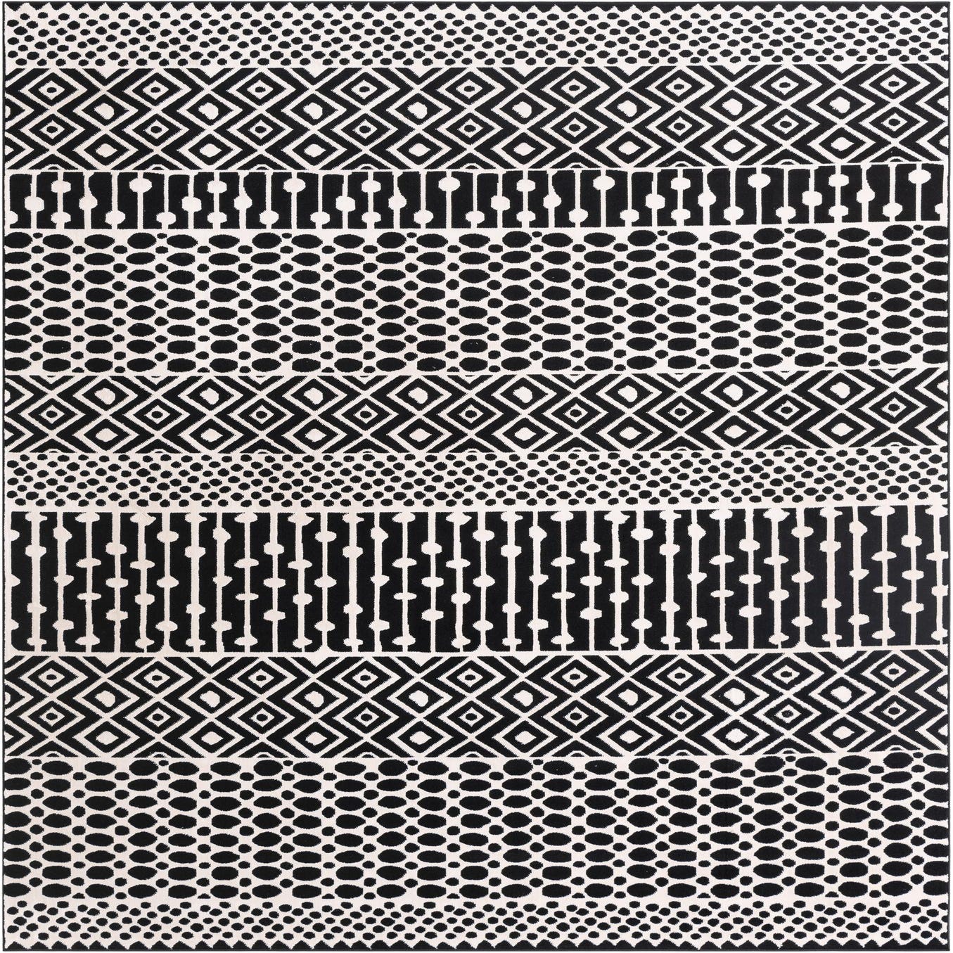 Bold bands of contrasting geometry create a strong graphic rhythm in this machine-made rug crafted from 100% polyester. Horizontal stripes alternate between tight dot fields, small diamond lattices, pebble-like ovals, and a vertical, keyhole-style motif, all rendered in a Black and White palette. The pile is low-profile and soft to the touch, with a smooth, slightly cushioned feel that highlights the crisp edges of each pattern while staying easy underfoot.