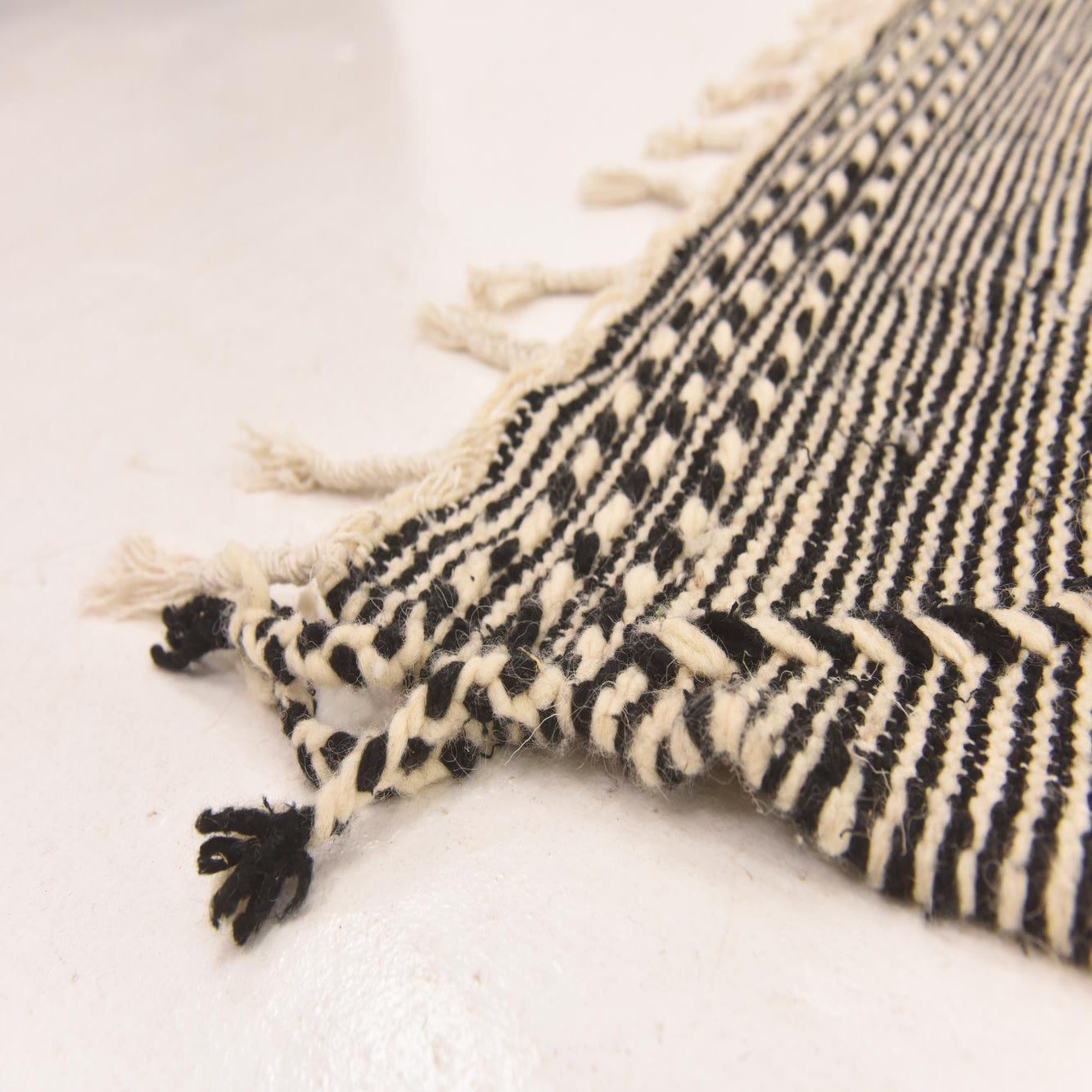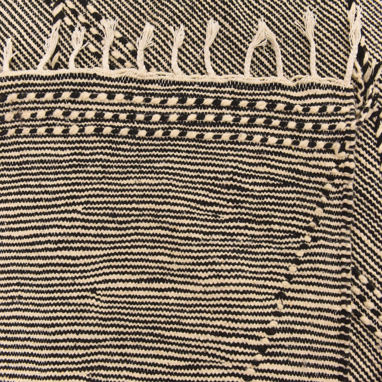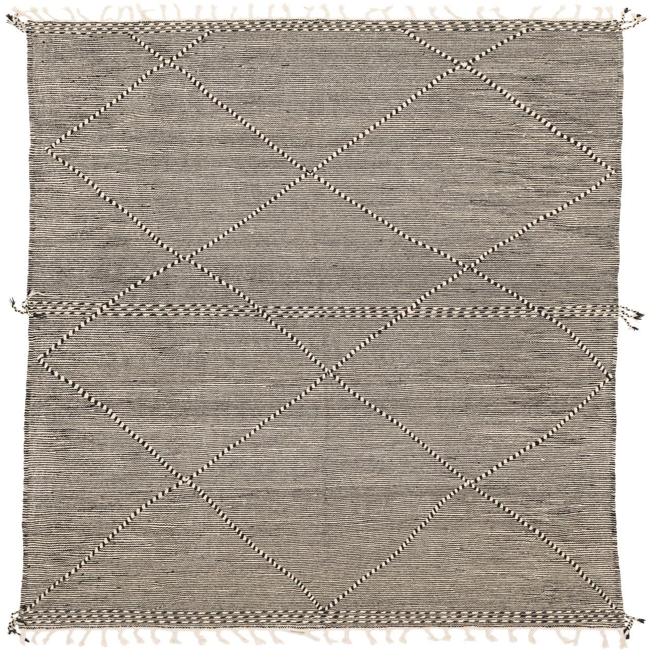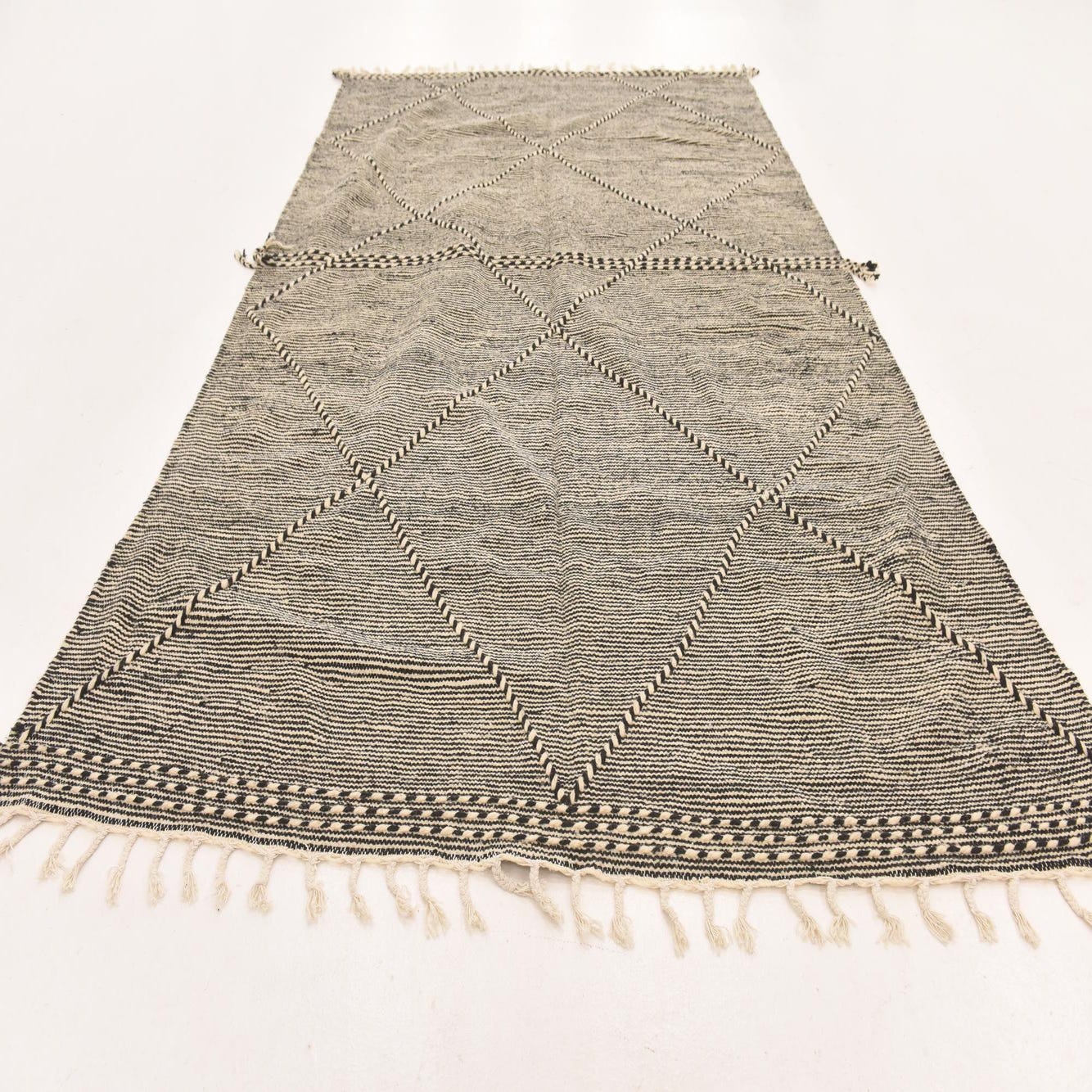A 6x9 rectangular Moroccan shag rug in black and ivory, featuring a tribal diamond pattern and fringe.