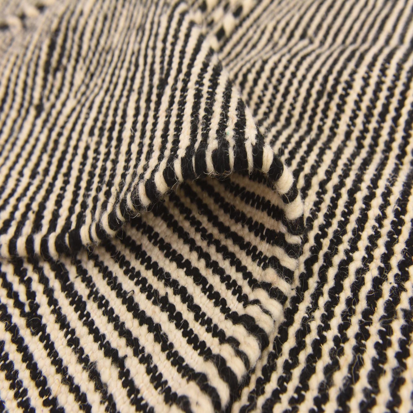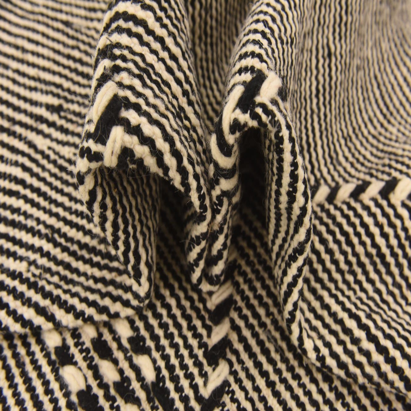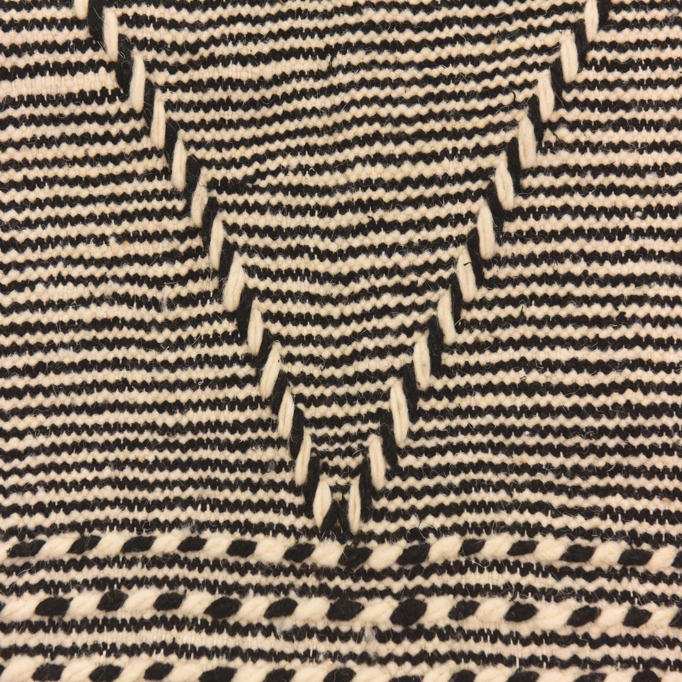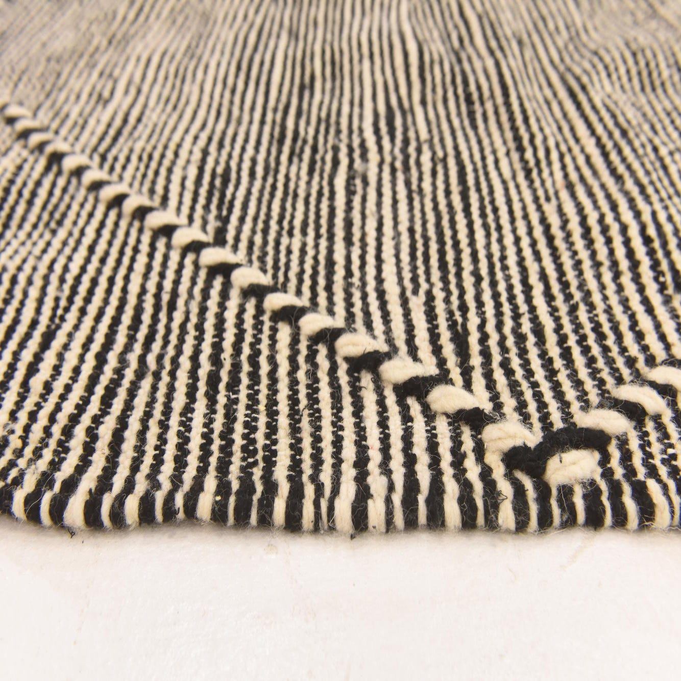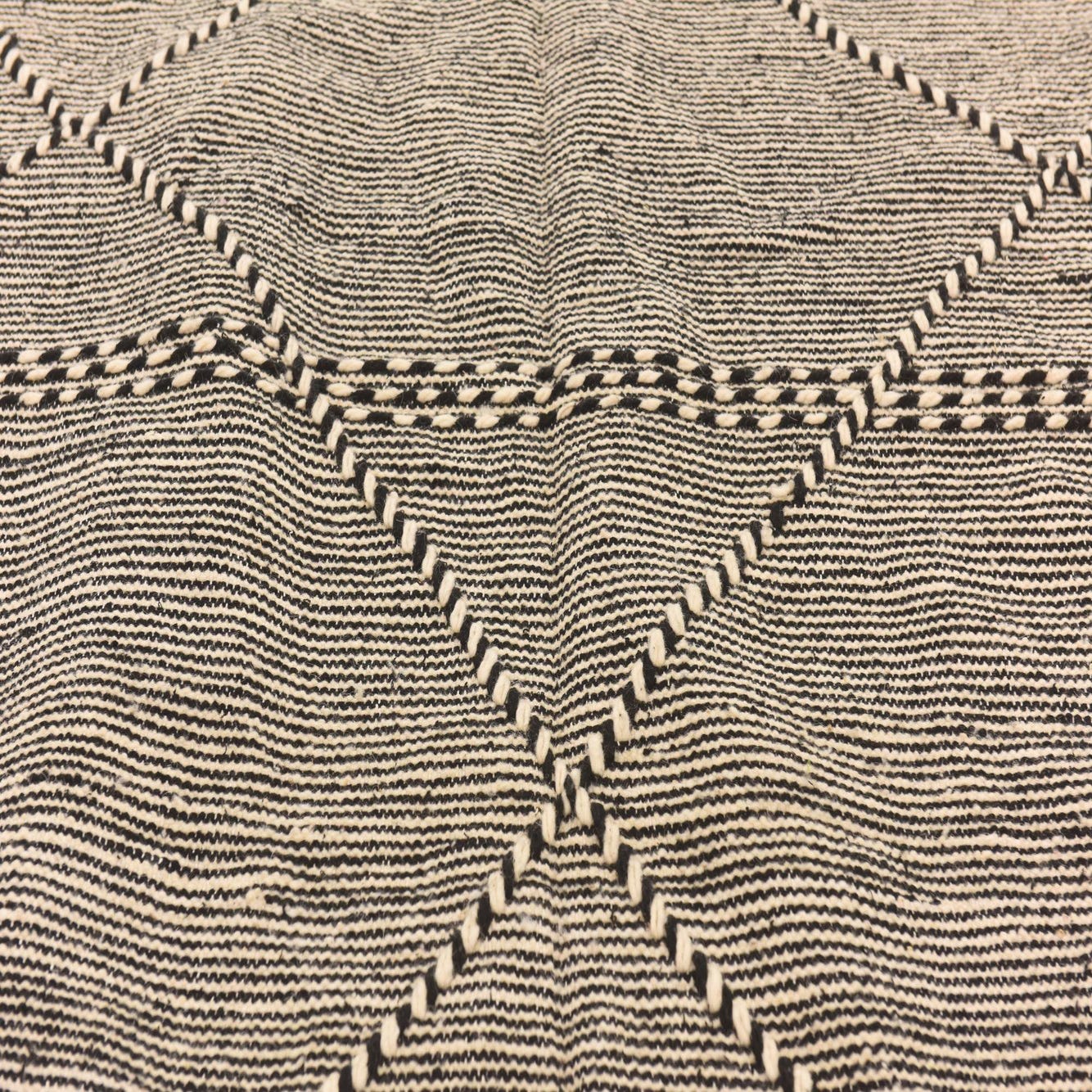 A 6x9 rectangular Moroccan shag rug in black and ivory, featuring a tribal diamond pattern and fringe.