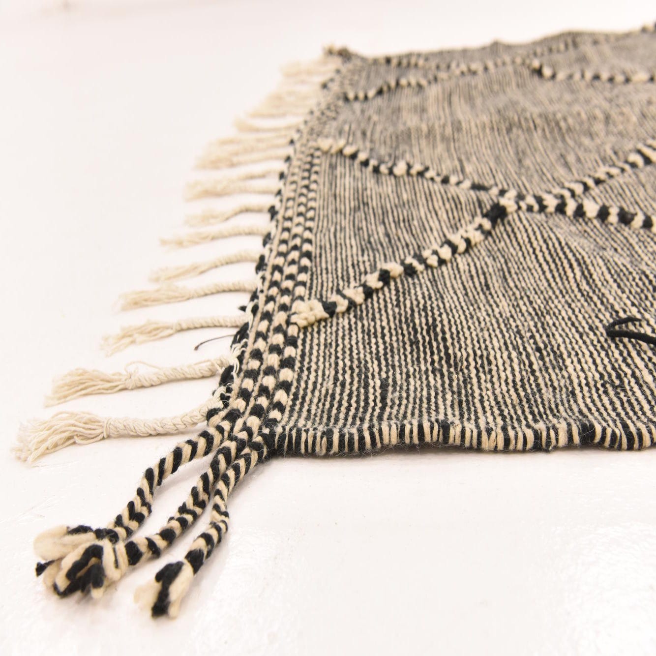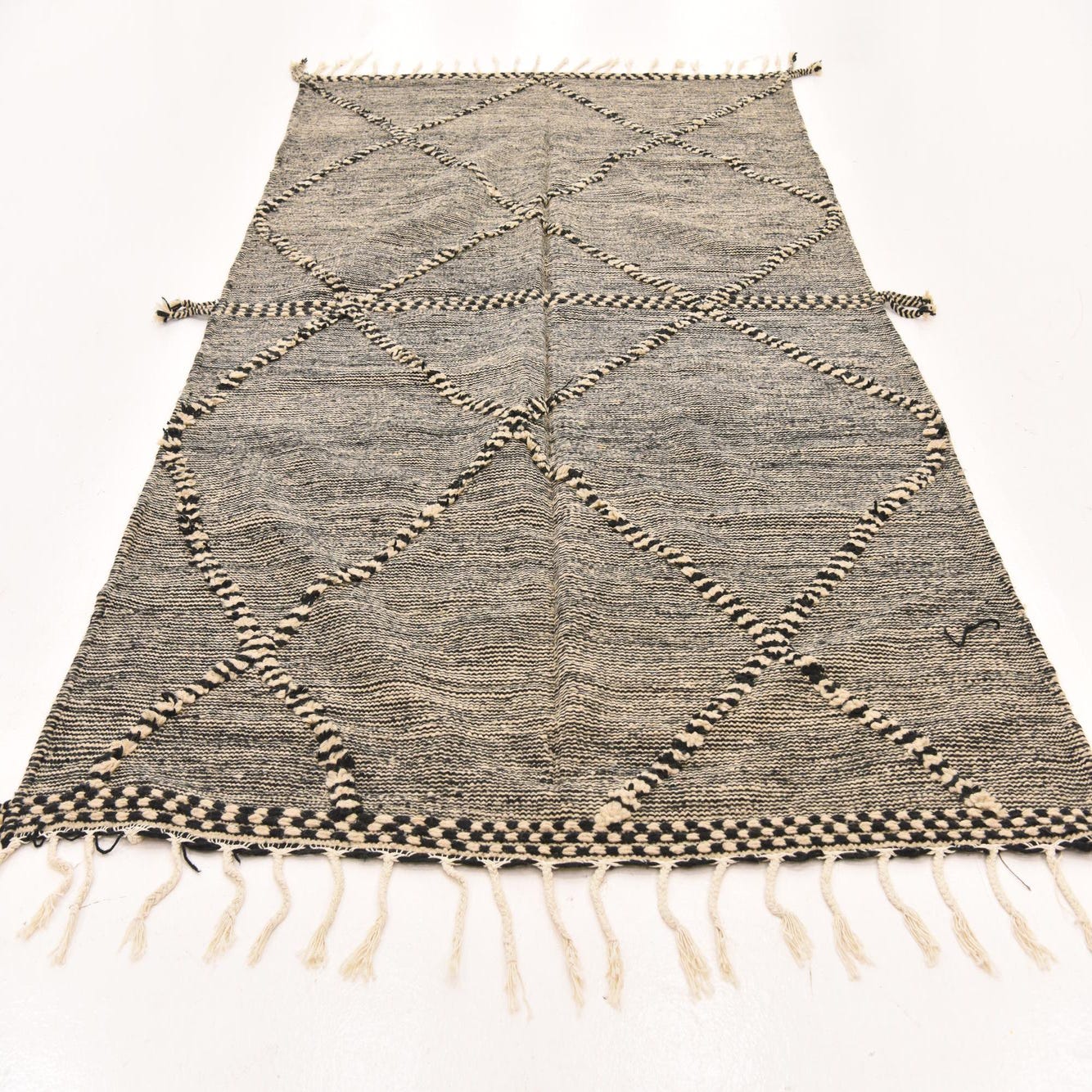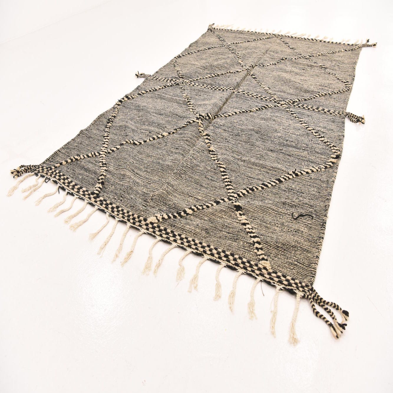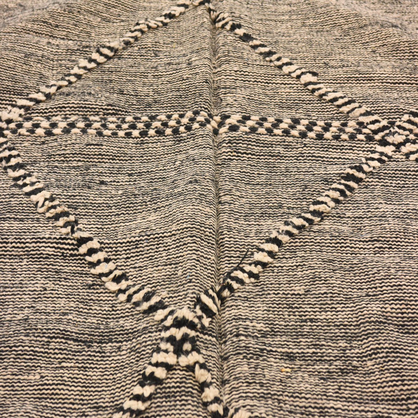 A 6x9 rectangular Moroccan shag rug in black and ivory, featuring a bold tribal diamond pattern and fringe.