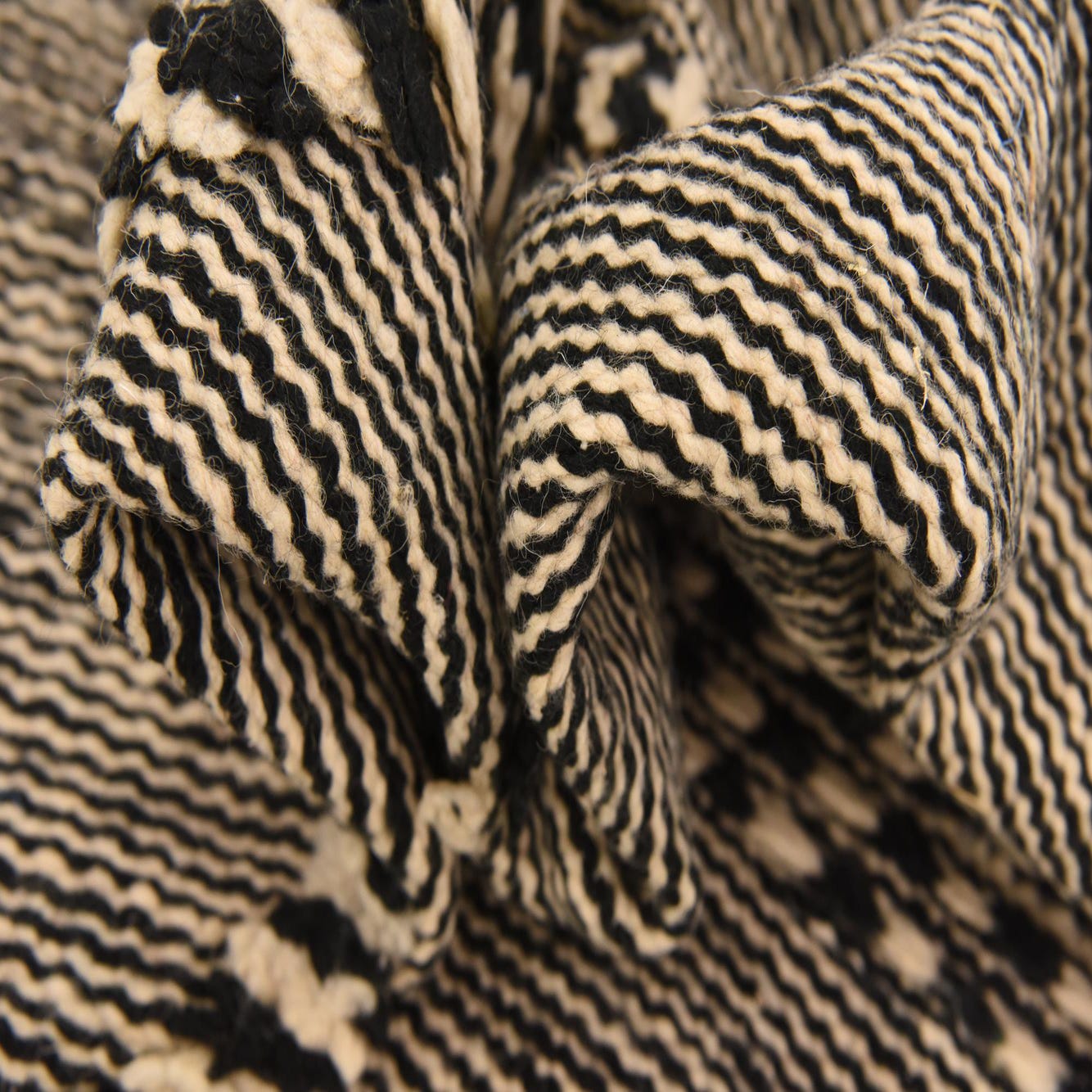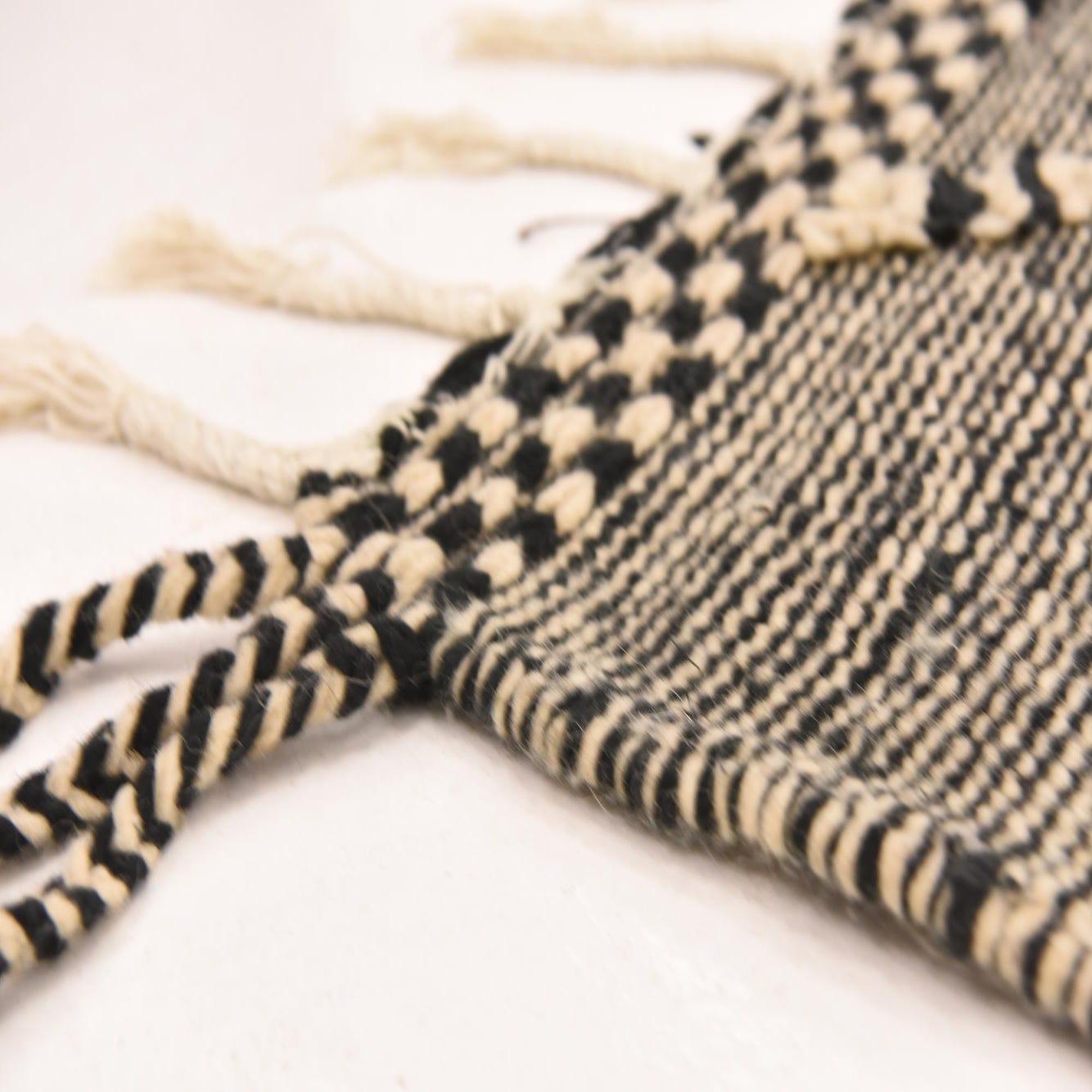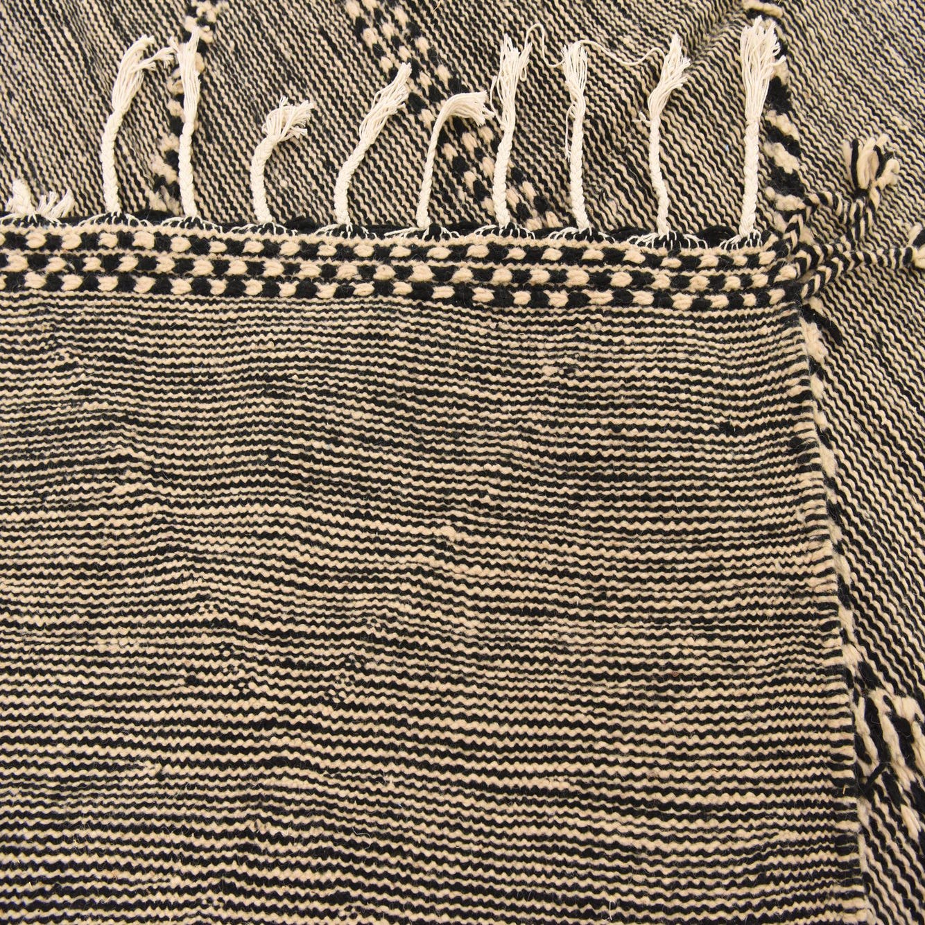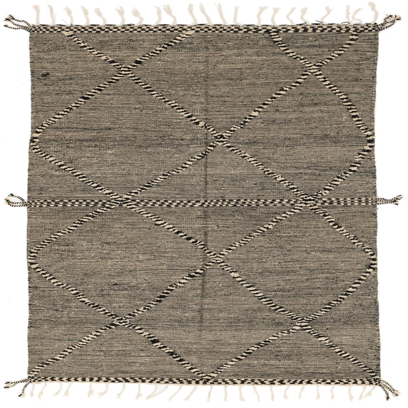 A 6x9 rectangular Moroccan shag rug in black and ivory, featuring a bold tribal diamond pattern and fringe.
