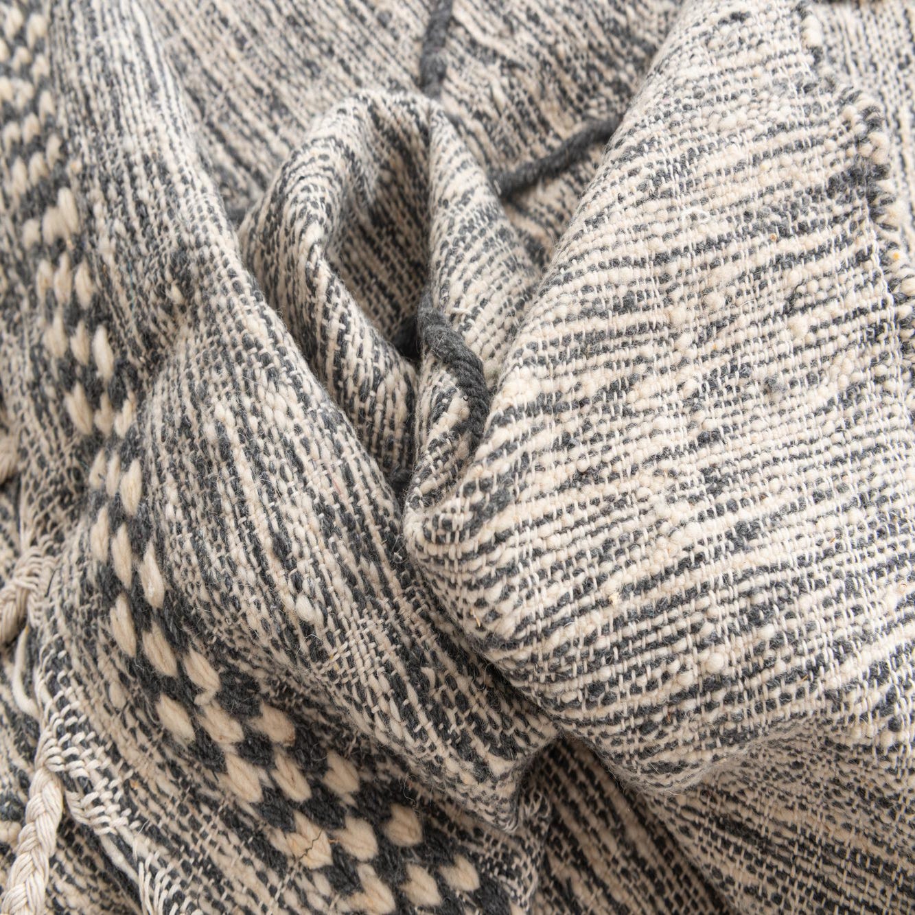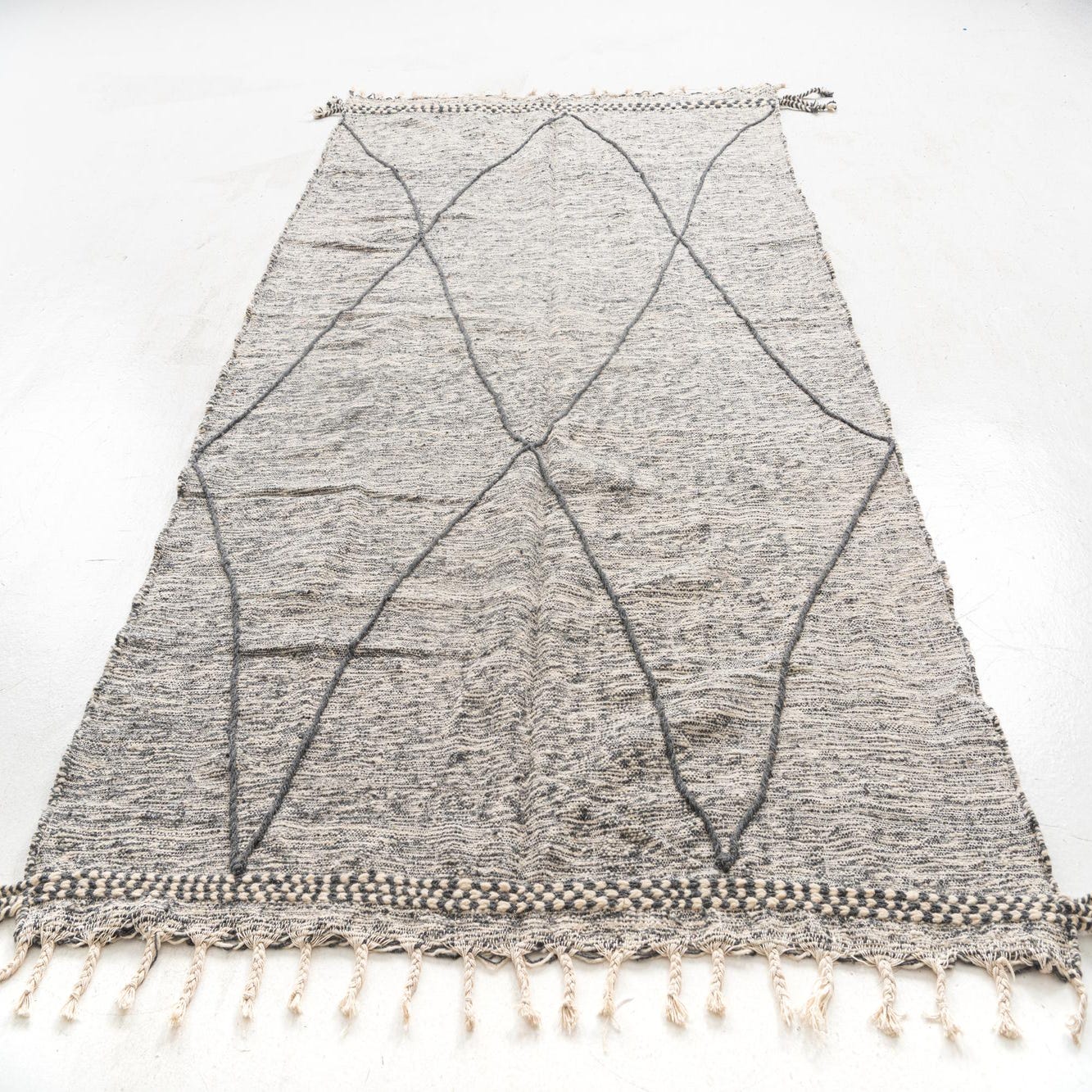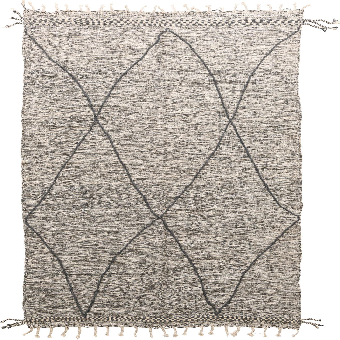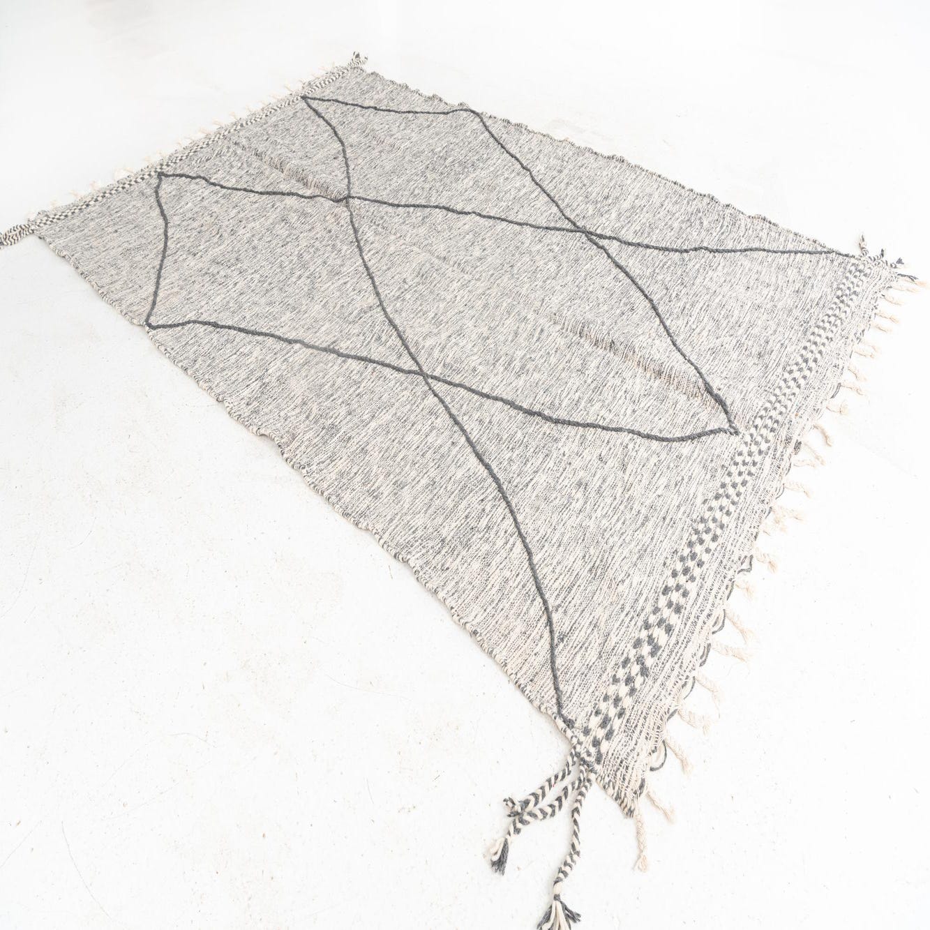 A 6x9 rectangular Moroccan tribal rug in black and white, featuring a bold diamond pattern and fringe.