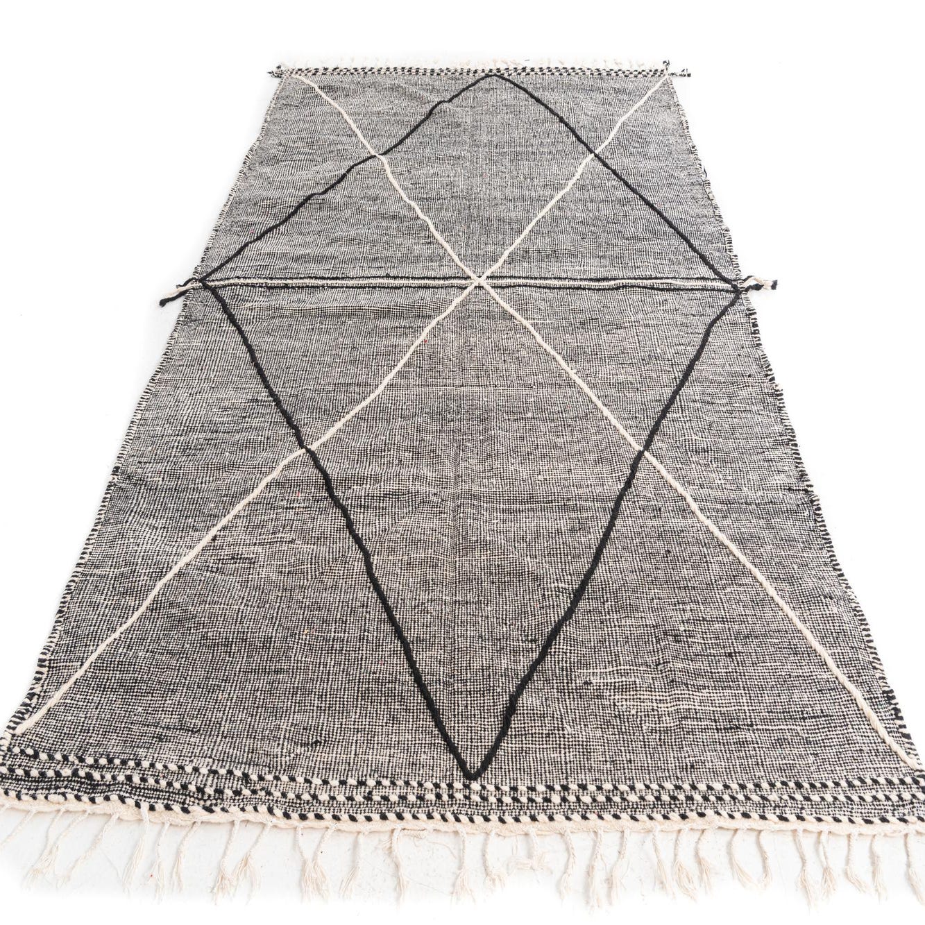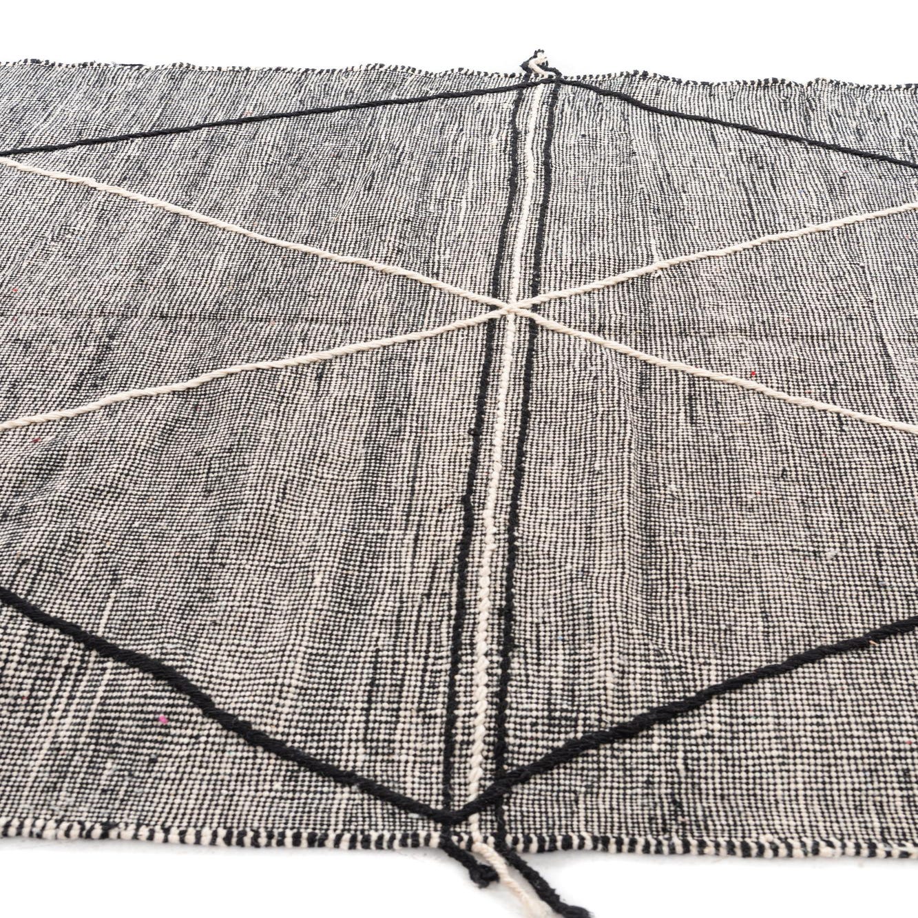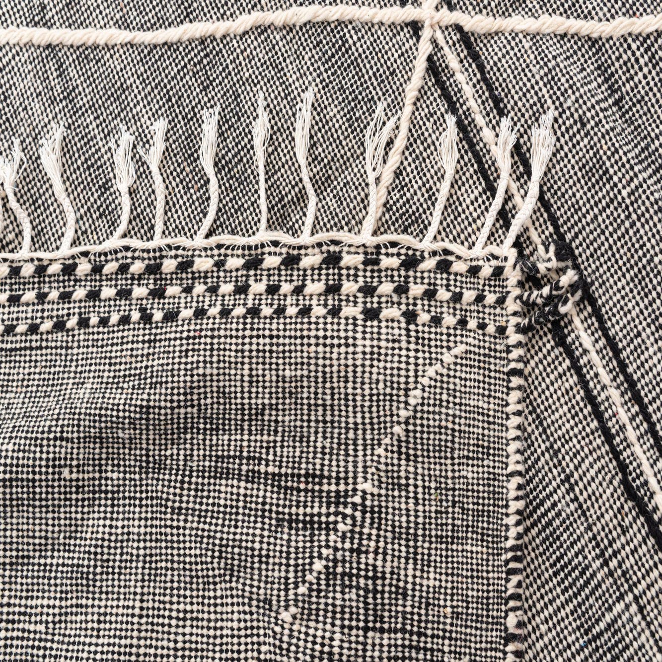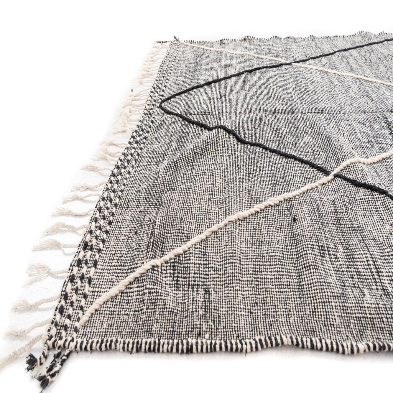 The simplicity of the design offers a broad range of styling possibilities, suitable for interiors from the minimalist and contemporary to the eclectic and bohemian. The pronounced black and white theme allows for effortless coordination with both neutral and vibrant color schemes. The fringe detailing contributes to its authentic handmade charm, framing the rug with a casual, yet refined finish.