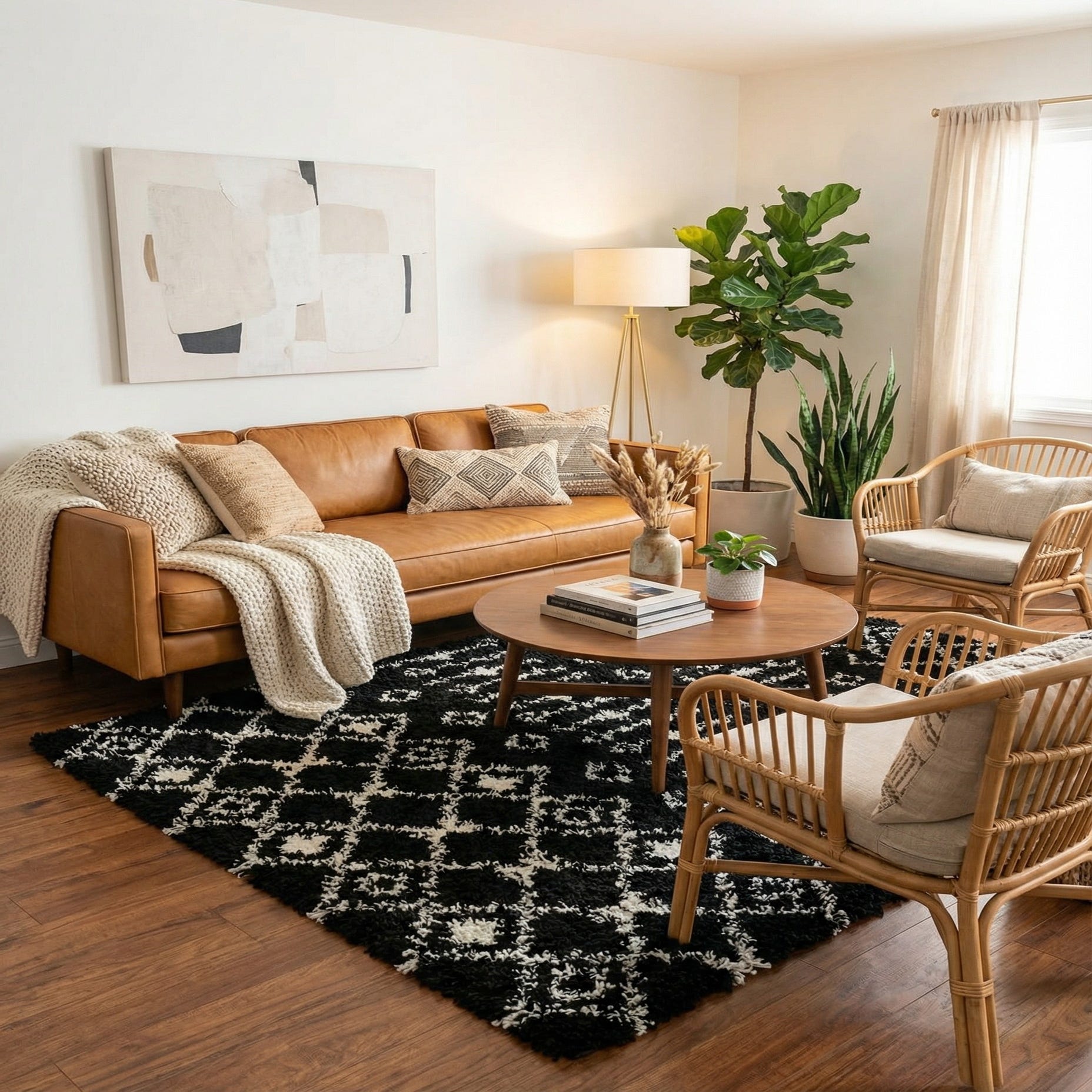 Use it to anchor a living room seating area or place it beneath a bed to add warmth and texture to the room. It pairs well with clean-lined, contemporary furnishings, mid-century pieces, or light wood accents for a striking monochrome contrast. Layer it over a larger neutral rug for a relaxed, bohemian look or let it stand alone in a home office or den to add visual interest and a comfortable underlayer.