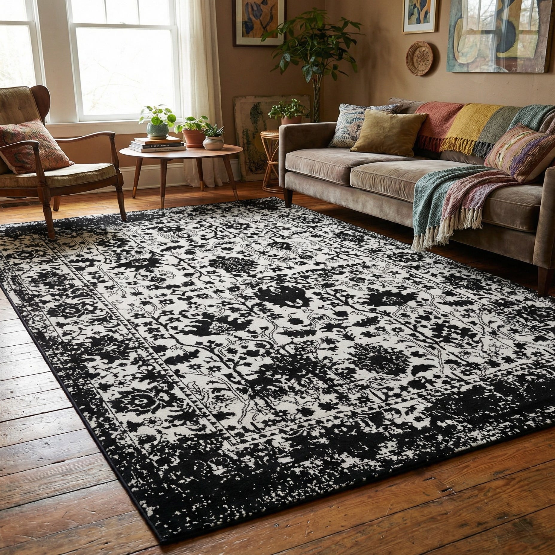 A classic, Persian-inspired floral pattern is rendered in high-contrast black and white, with an ornate border and a gently distressed finish that gives the design character without overpowering a room. The background color is Black and White, with black motifs layered over it to create clear, graphic blooms, vines and medallion shapes. The overall look blends traditional ornament with a modern monochrome palette, making the pattern both decorative and restrained.