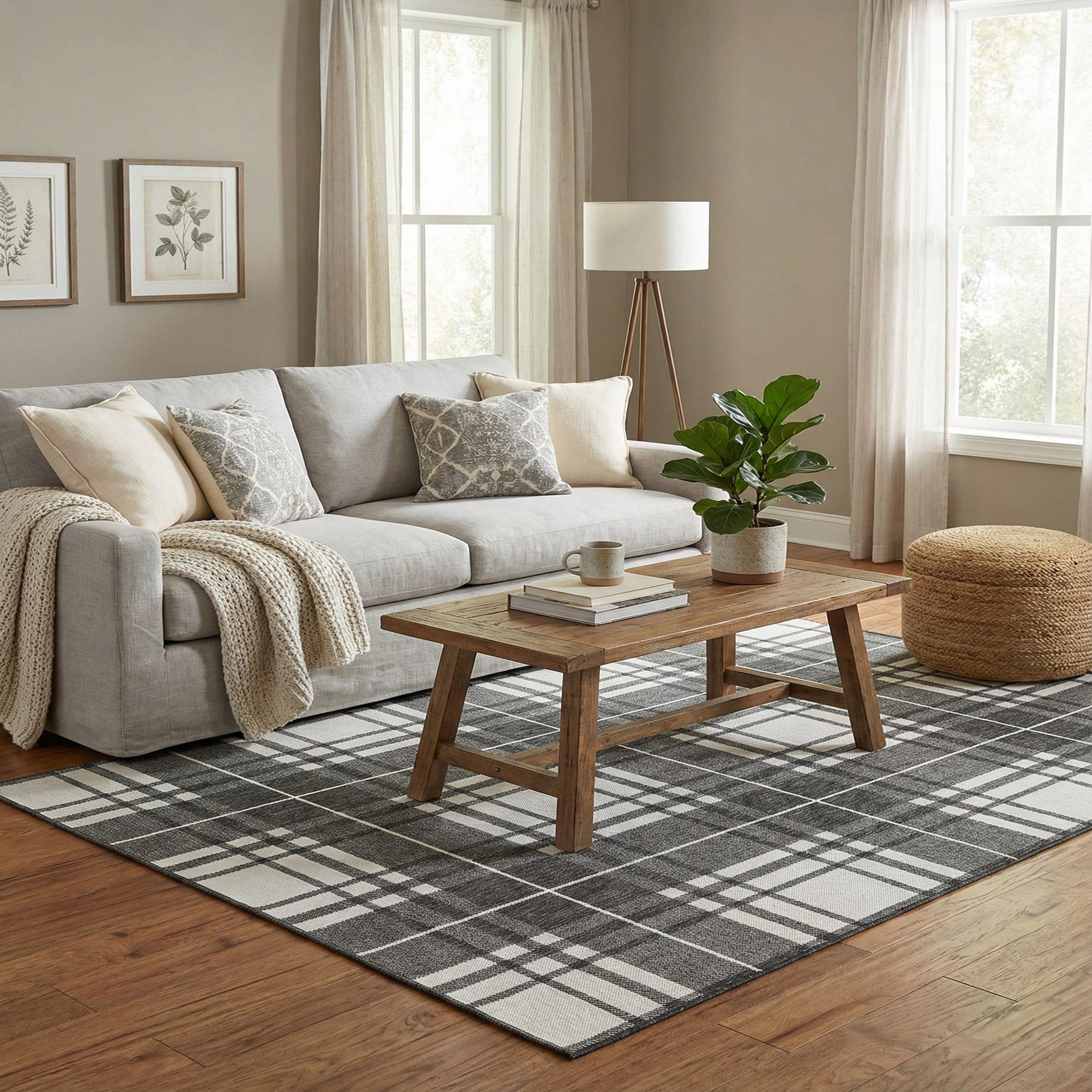 A 6x9 rectangular Rugs.com Outdoor Checkered rug featuring a modern black and white plaid pattern, ideal for indoor or outdoor use.