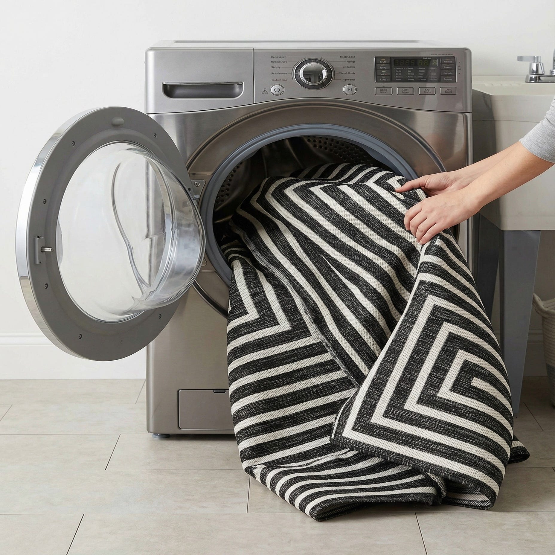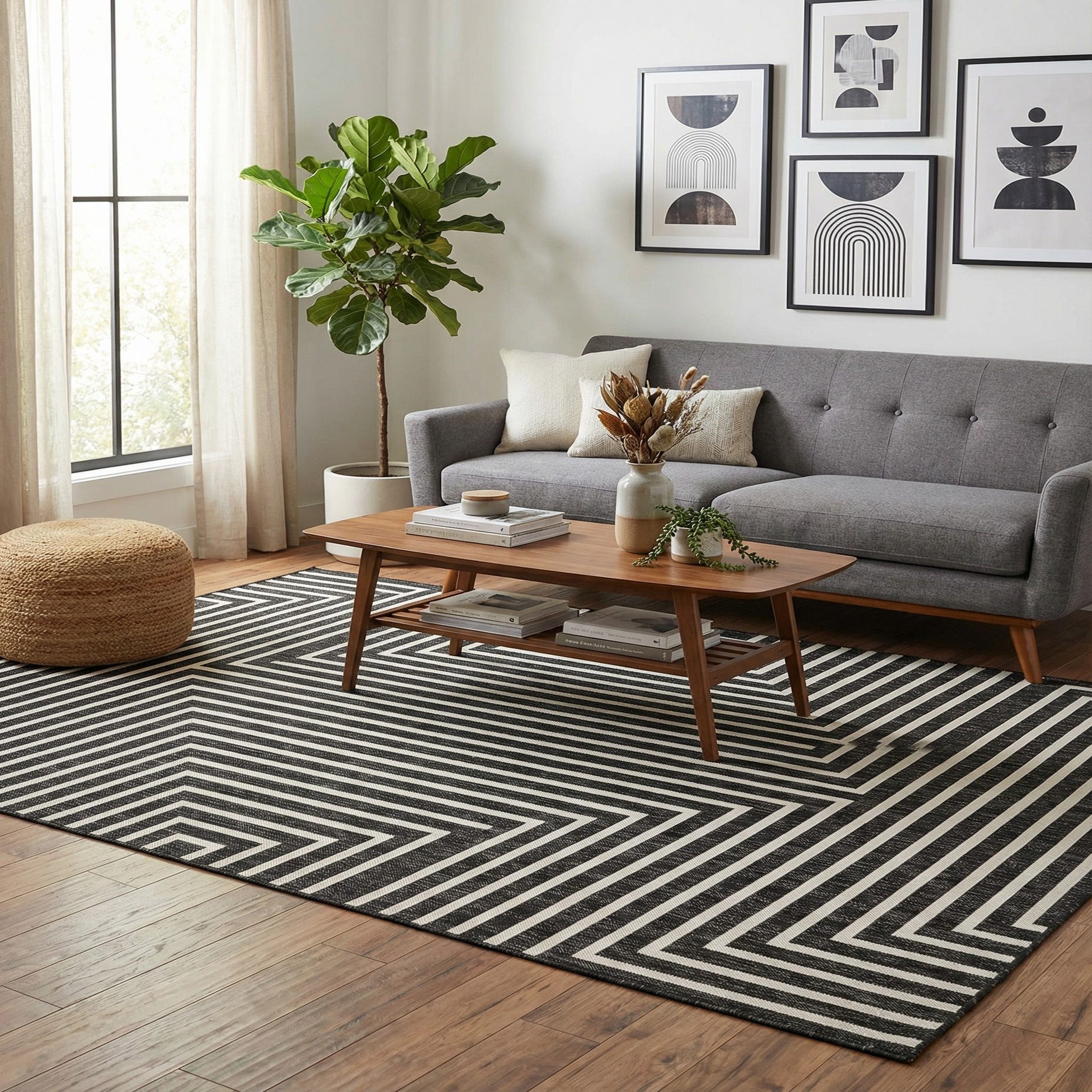 The black and white color scheme of the rug makes it highly versatile, capable of complementing a range of decor styles, from minimalist and contemporary to more eclectic and bold interiors. Equally suitable for patios, decks, and living spaces, it adds a modern touch that anchors your furnishings.