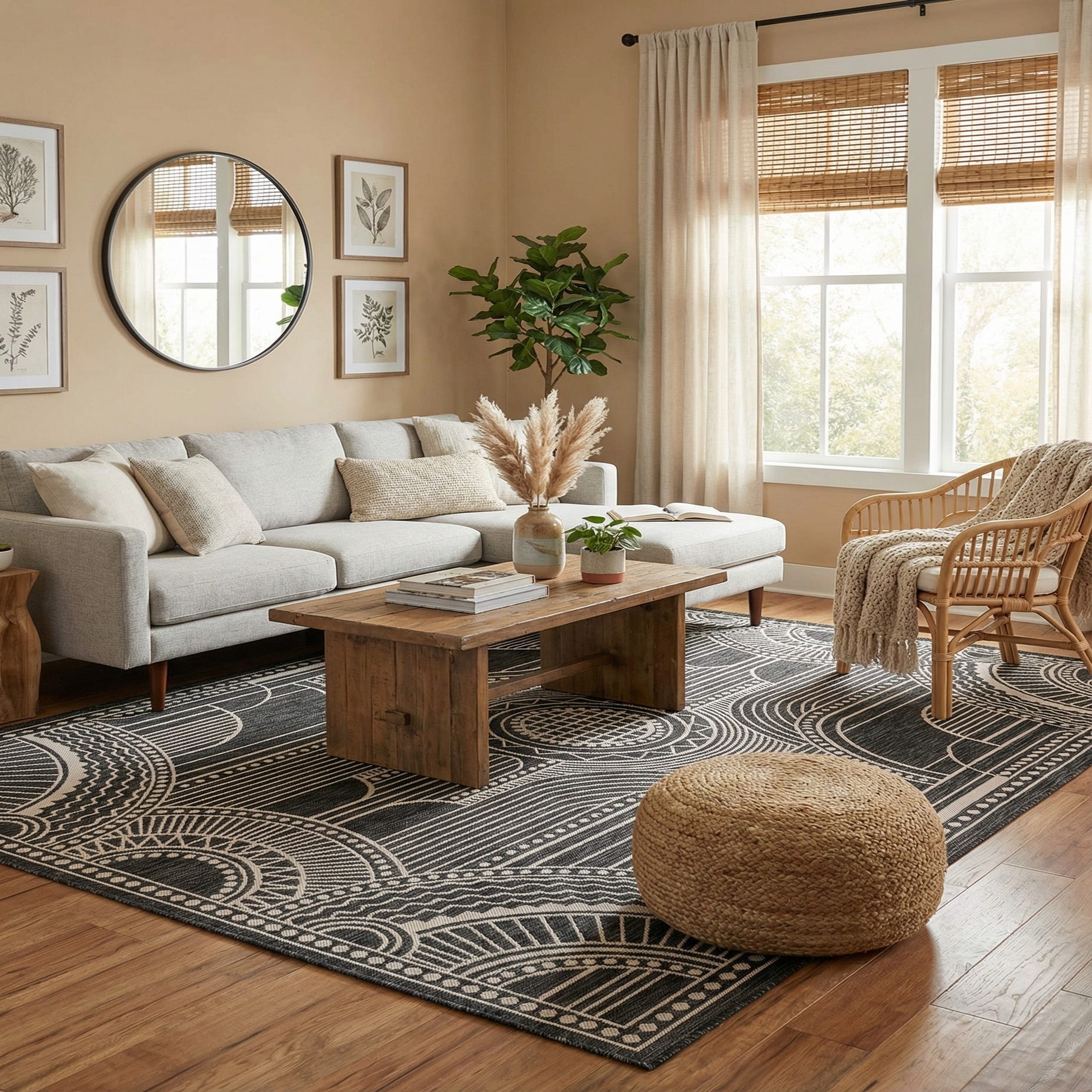 A 6x9 rectangular black and white contemporary rug with an intricate medallion and geometric pattern, ideal for indoor or outdoor use.