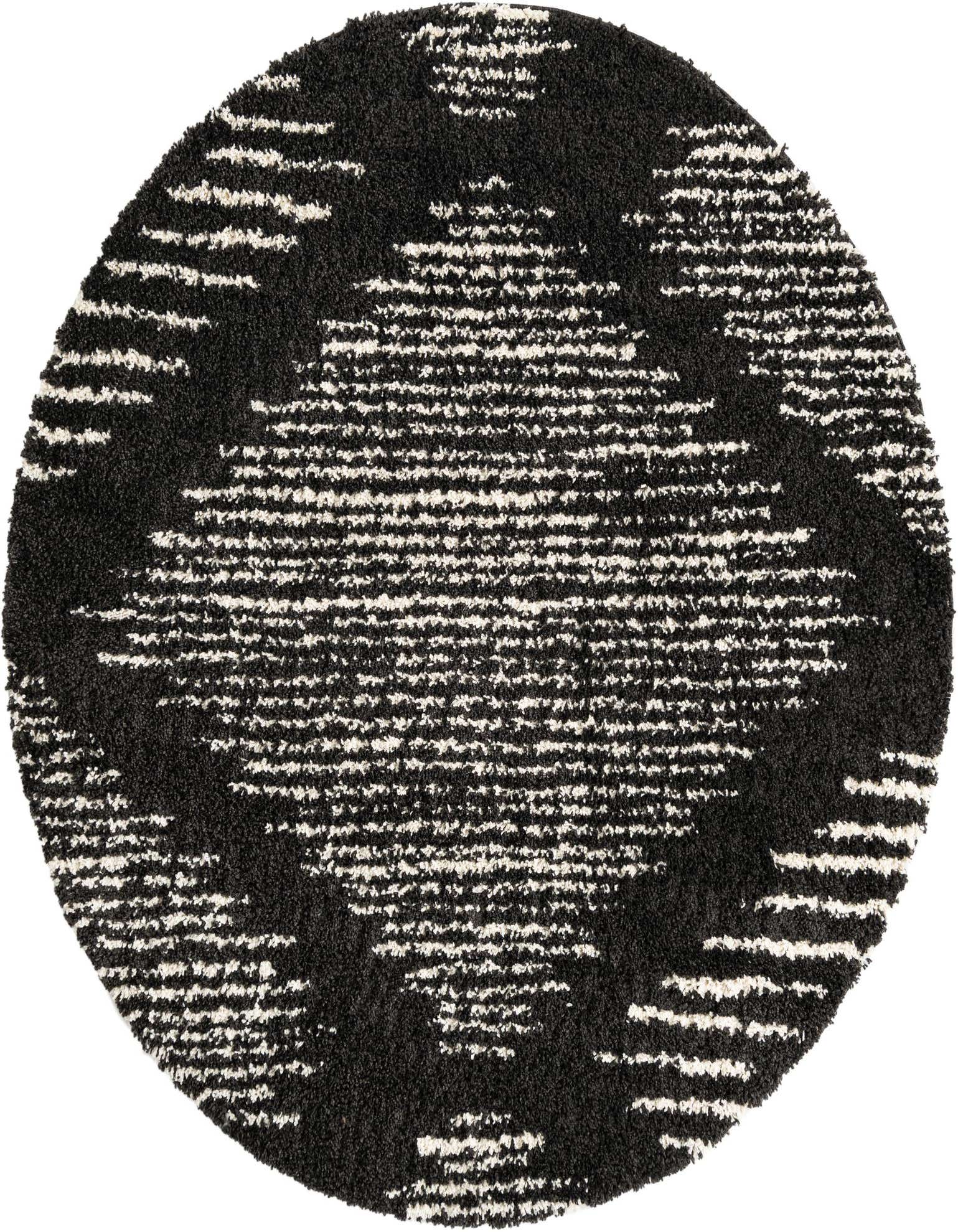 A 7' round black and white shag rug with a modern trellis pattern, featuring a textured pile.