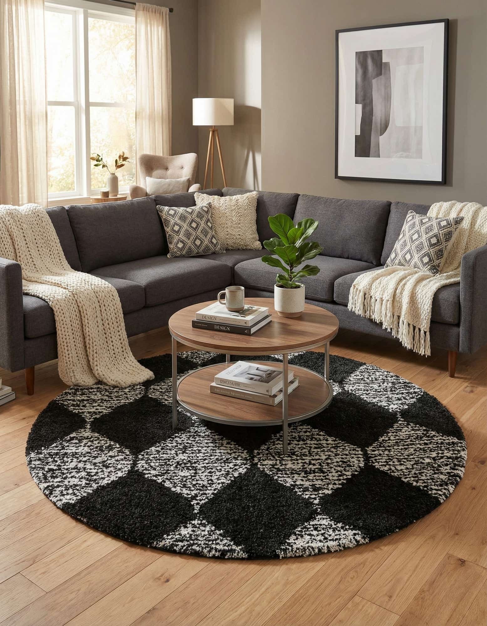 A round black and white shag rug featuring a modern trellis pattern, ideal for adding texture to any indoor space.