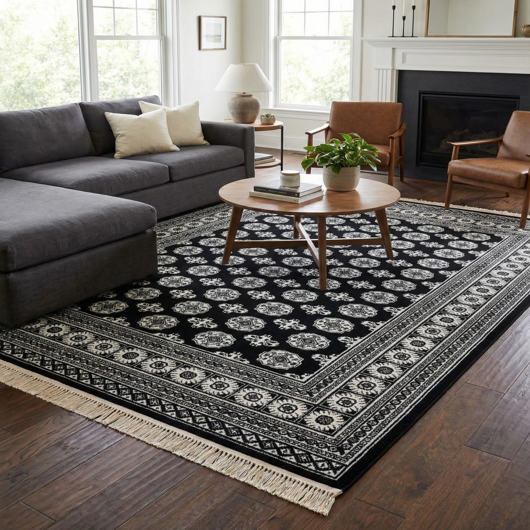 A 7x10 rectangular black and white Bokhara rug with intricate traditional patterns and a decorative border.