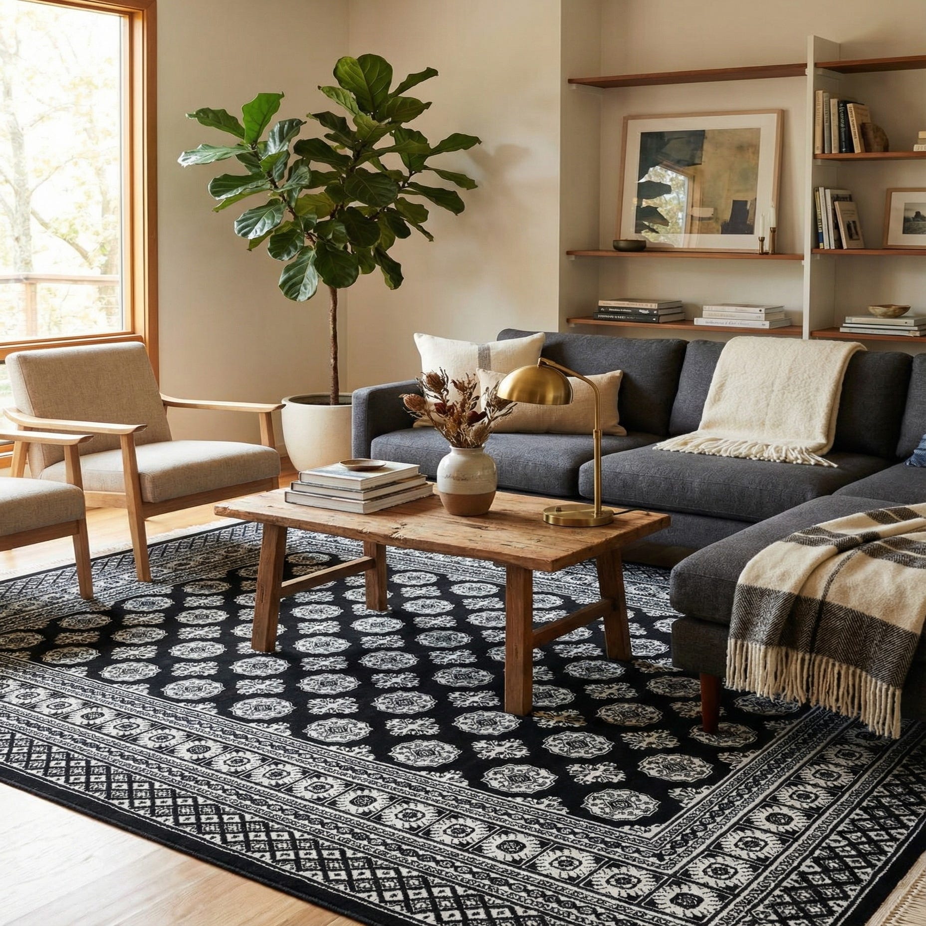 This rug works well in contemporary and transitional interiors alike—use it to anchor a monochrome living room, define a seating grouping in an open-plan loft, or place it under a dining table for high-contrast impact. It also suits a home office or entryway where a structured pattern and easy-to-maintain synthetic construction are desirable. The black, white and ivory palette makes it simple to pair with metal or wood furnishings, textured throws, and graphic pillows for a layered, balanced look.