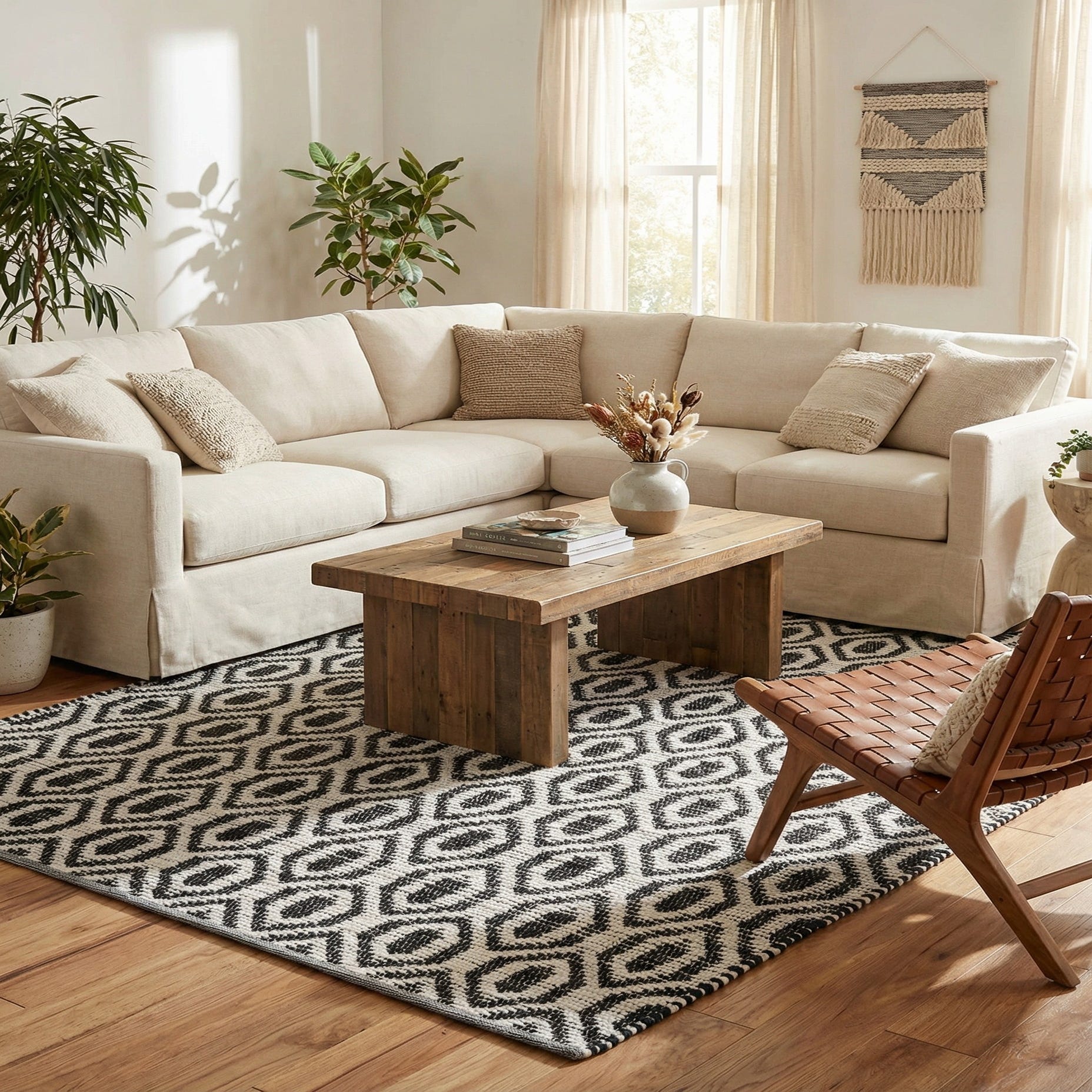 Hand woven from 60% cotton and 40% jute, the construction yields a low-profile rug that layers well and holds its shape in everyday spaces. Place it under a living room seating group to anchor furniture with high-contrast interest, use it beneath a dining table to introduce pattern without bulk, or roll it out in an entry or hallway for a graphic statement. It pairs well with natural wood tones, leather, and simple metal accents, and complements minimalist, Scandinavian, or modern farmhouse interiors that benefit from a crisp, monochrome foundation.