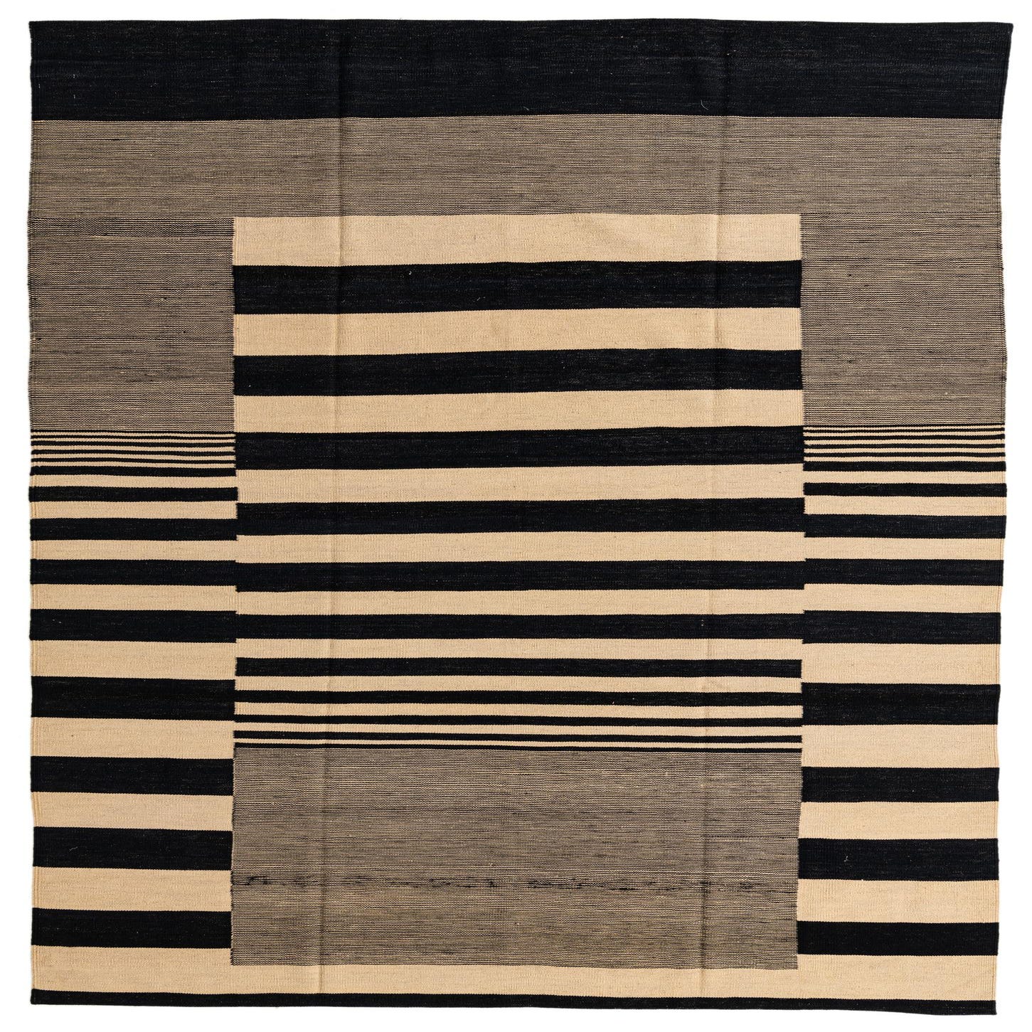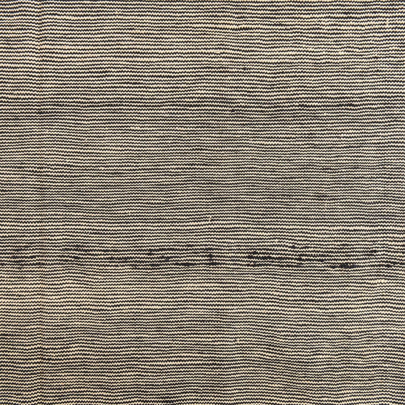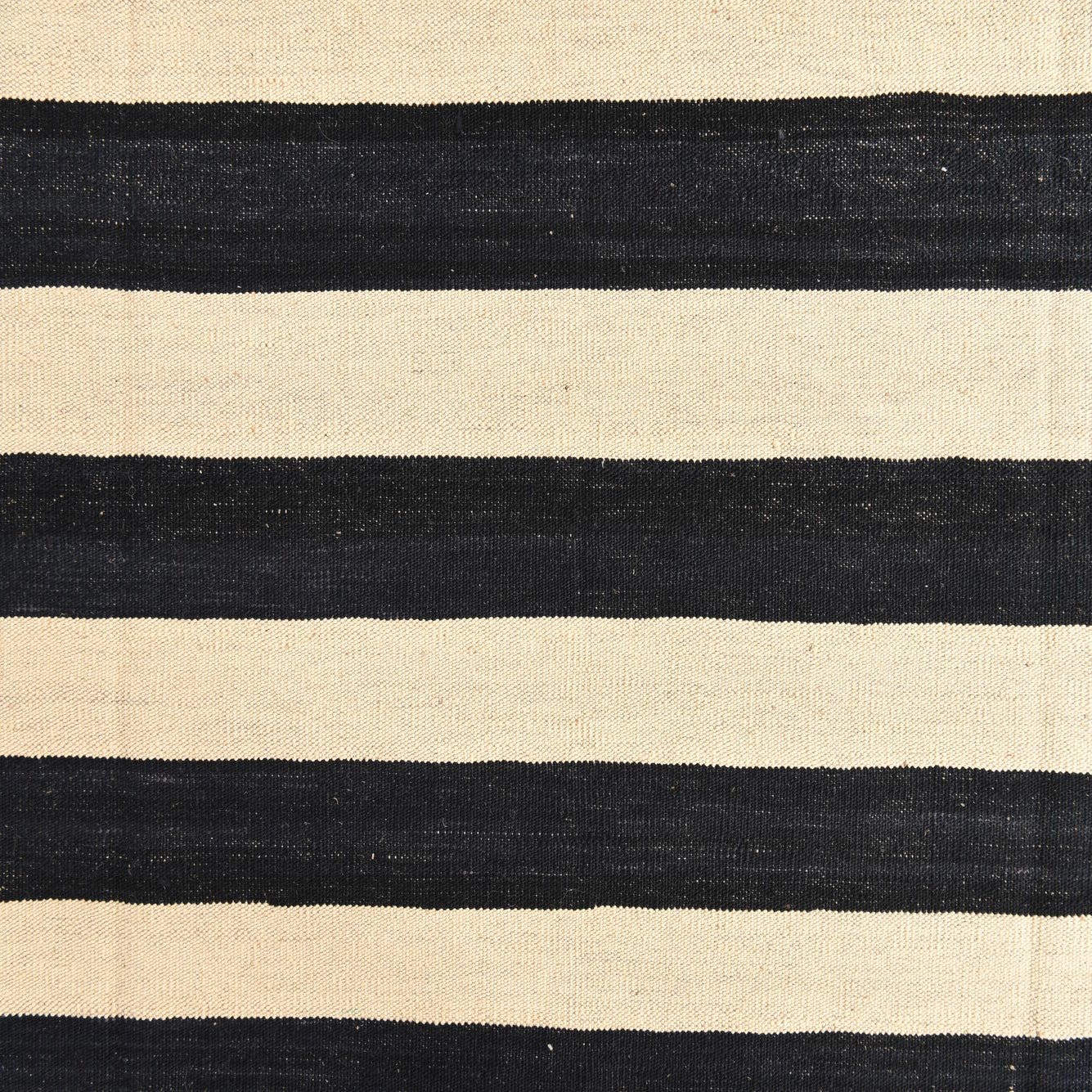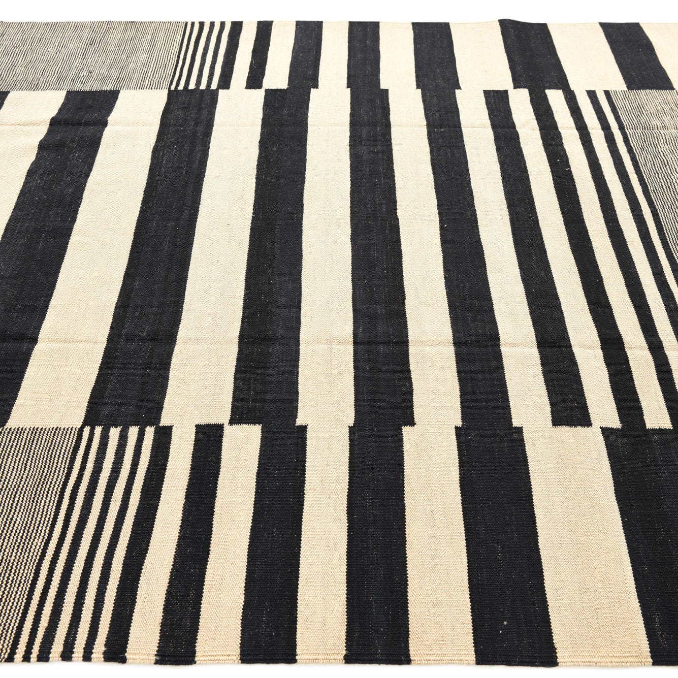 A 7x10 rectangular flatweave rug in black and ivory, featuring bold horizontal stripes and solid blocks in a modern tribal pattern.
