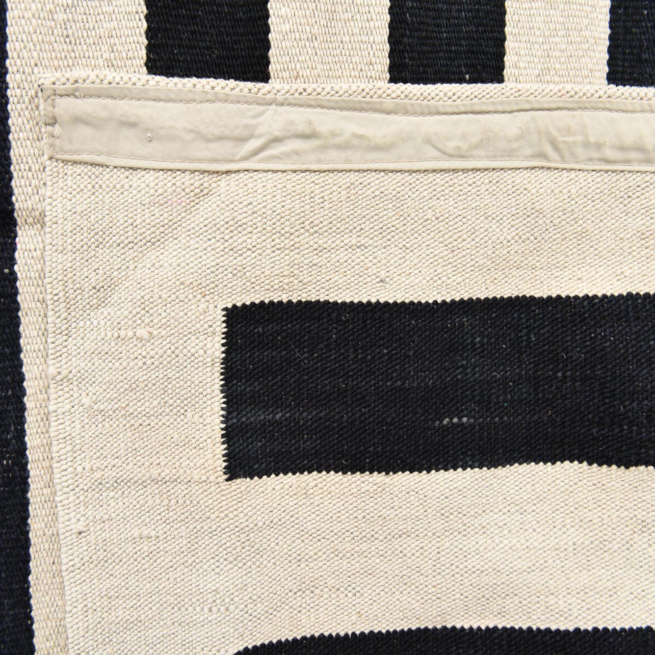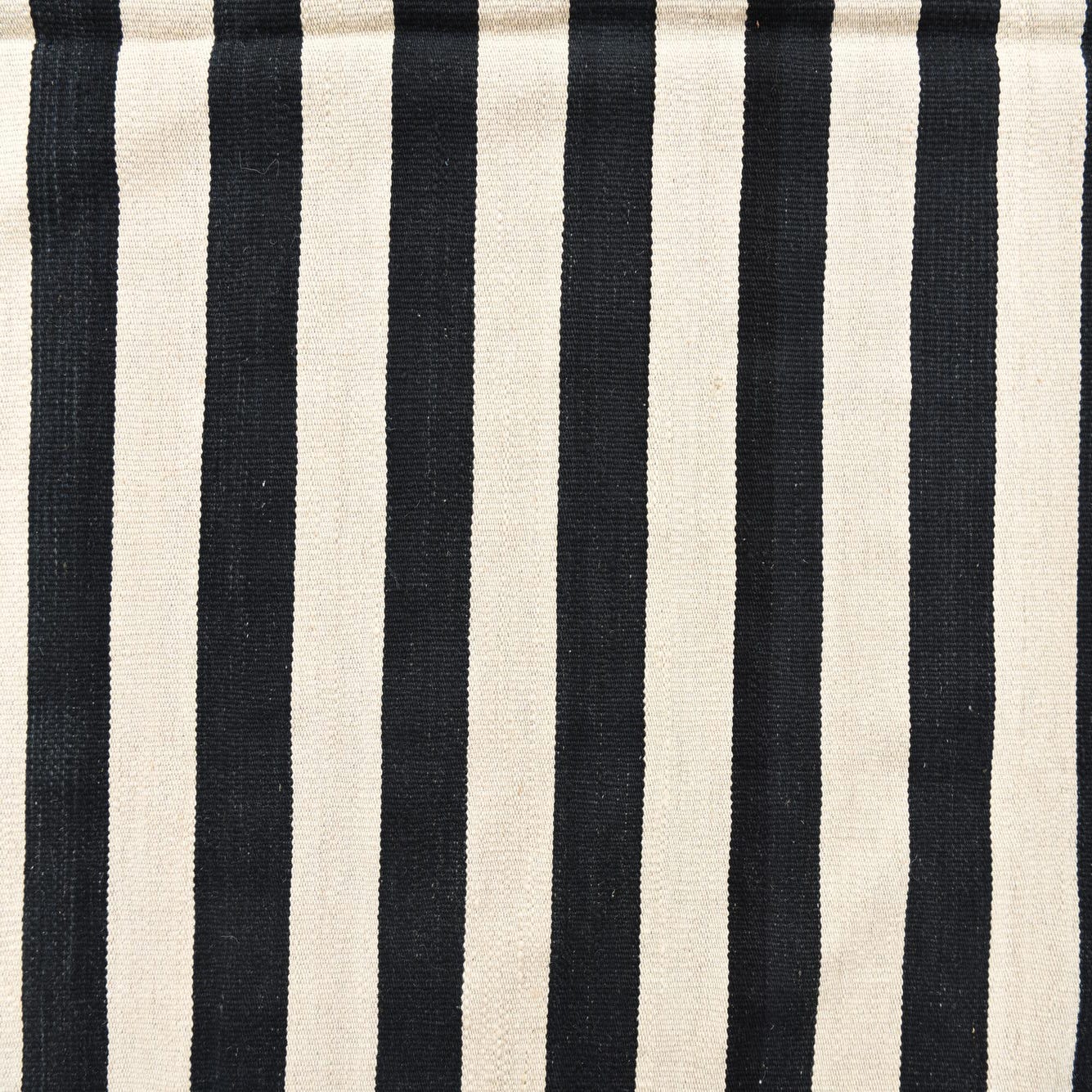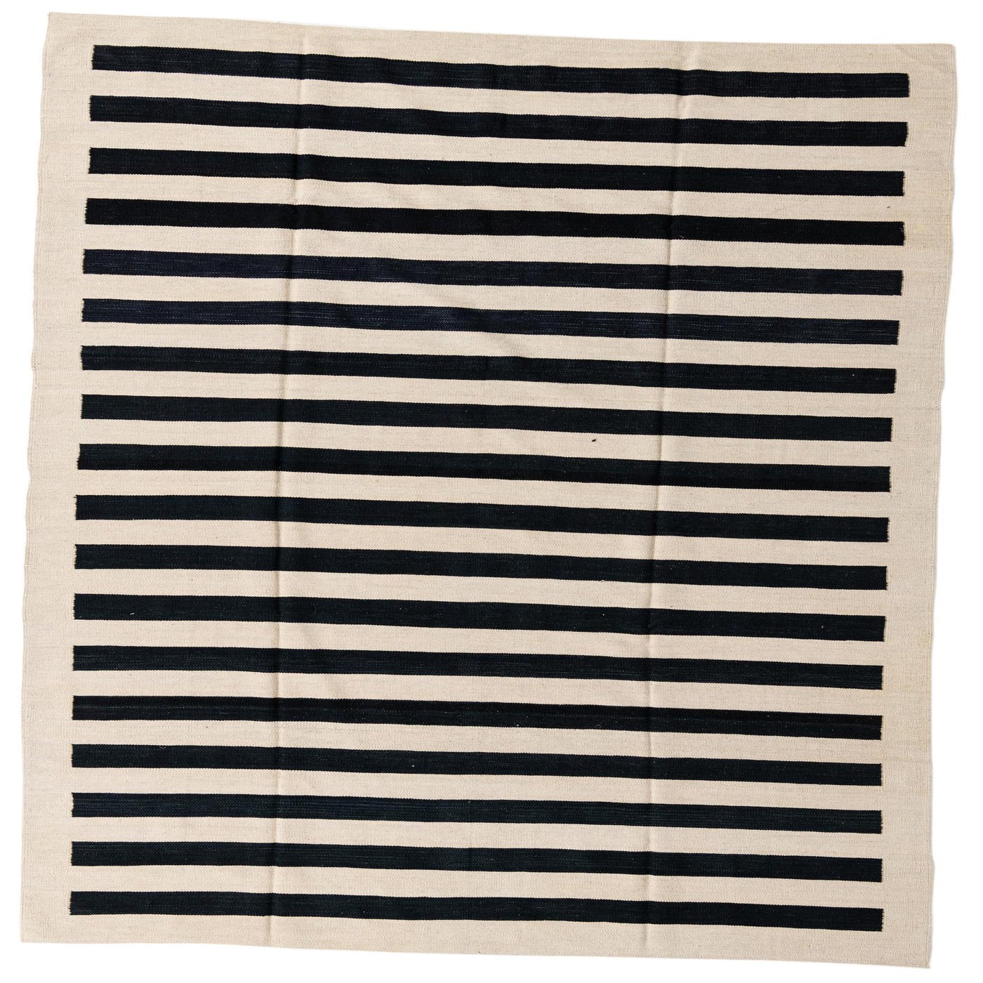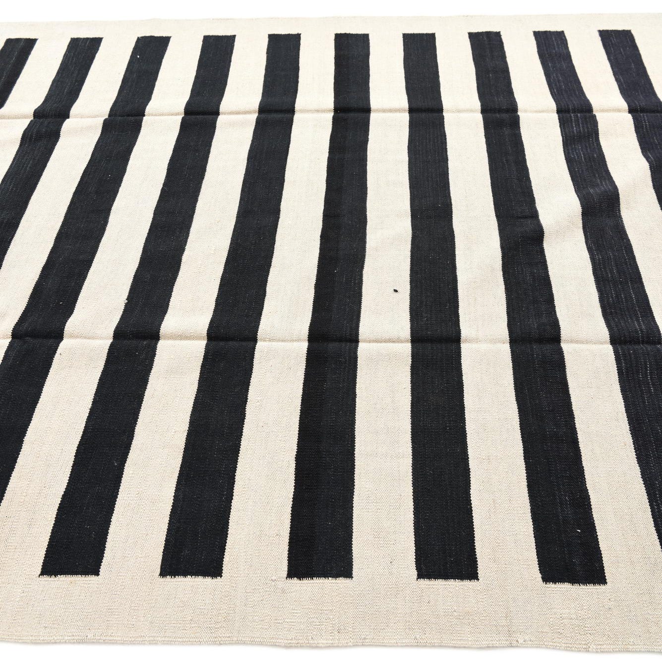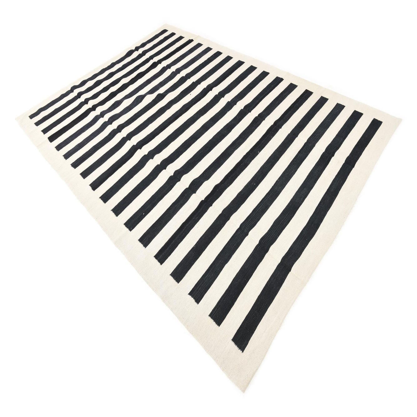 A 7x10 rectangular flatweave rug with bold black and cream horizontal stripes, suitable for a modern living room.