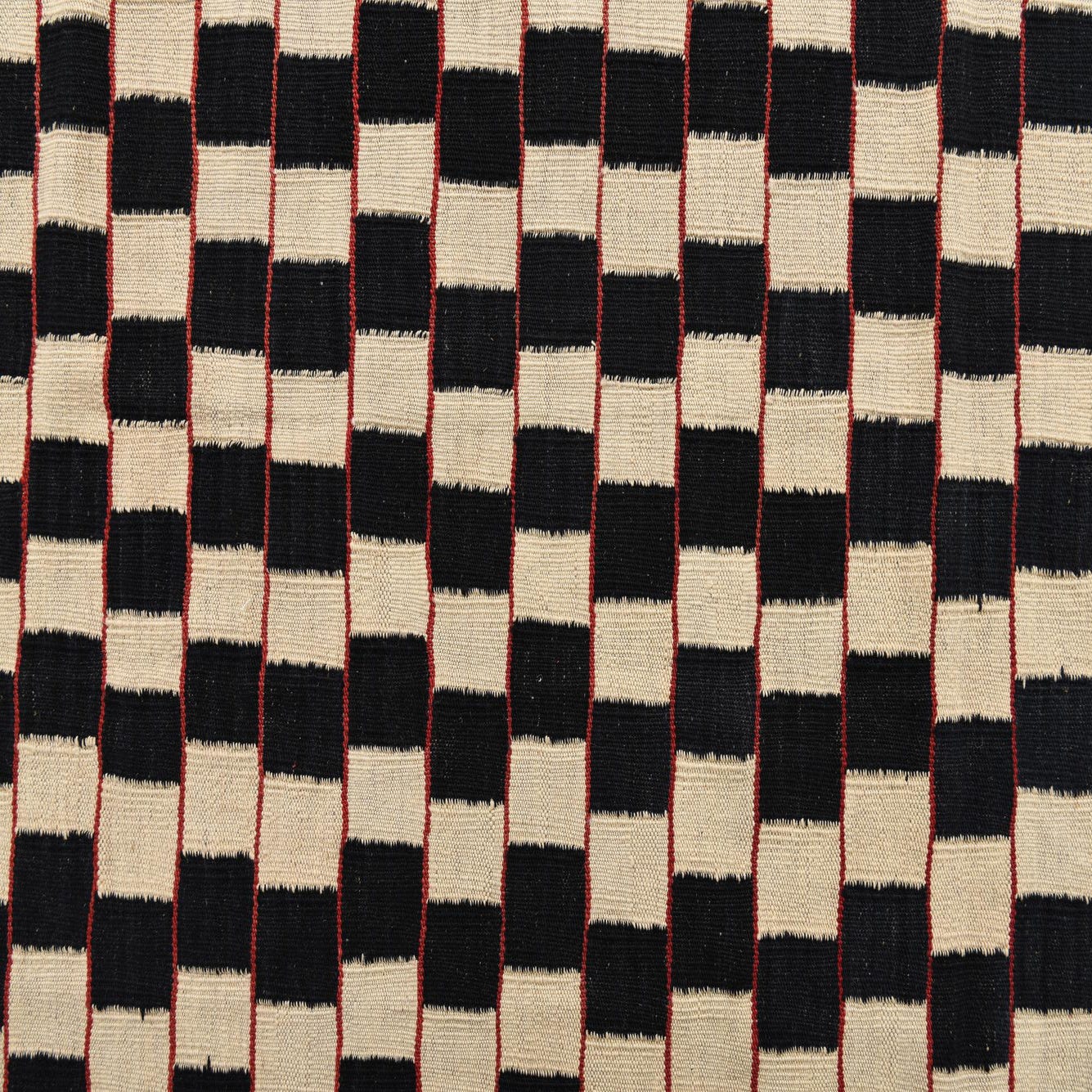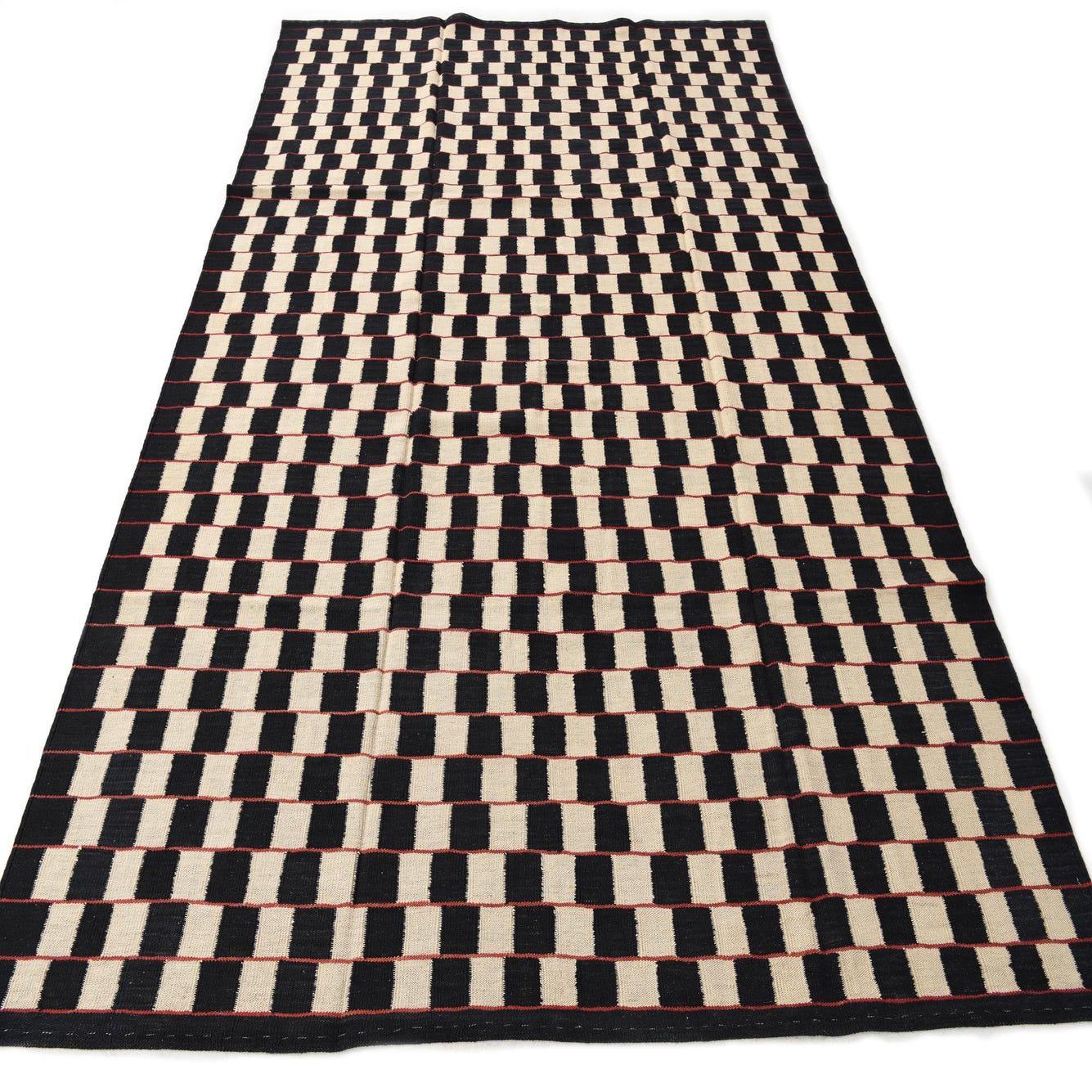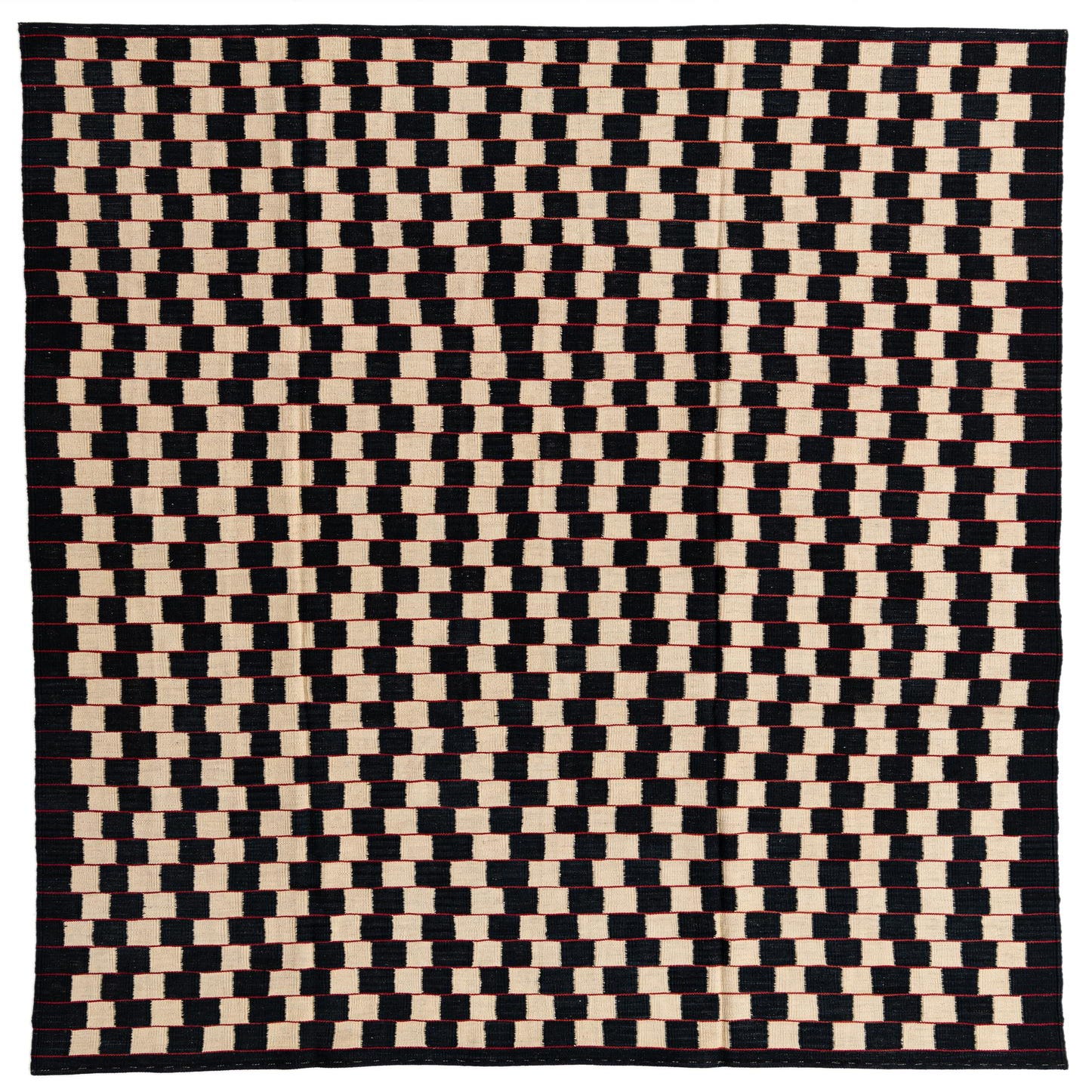 Hand-woven of 100% wool, this flatweave rug presents a disciplined checkerboard of alternating black and white blocks, with thin red lines running horizontally across the field to introduce a sharp, rhythmic accent. The low-profile surface feels taut and textured underfoot—the wool has a natural warmth and resilience while the flatweave keeps the overall hand crisp and structured.