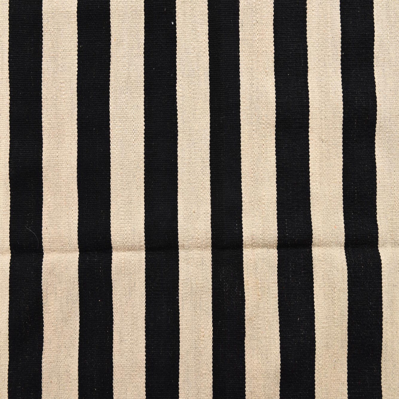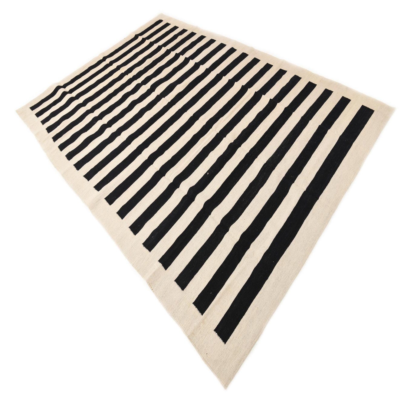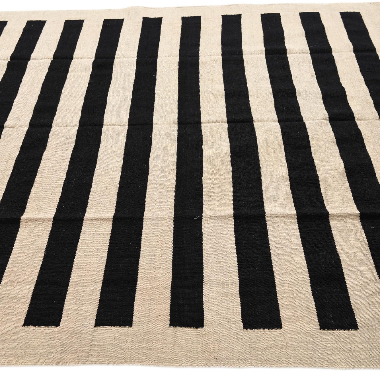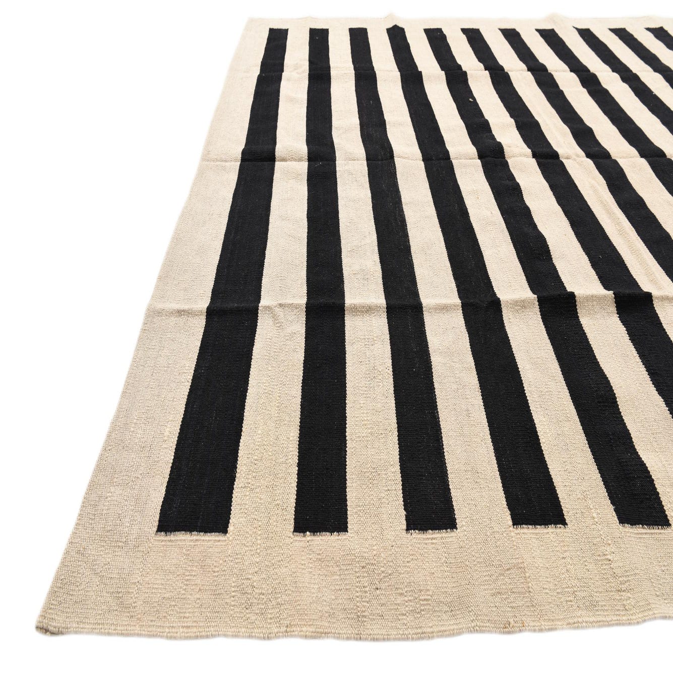 A 7x10 rectangular flatweave rug with bold black and ivory horizontal stripes, perfect for a modern living room.