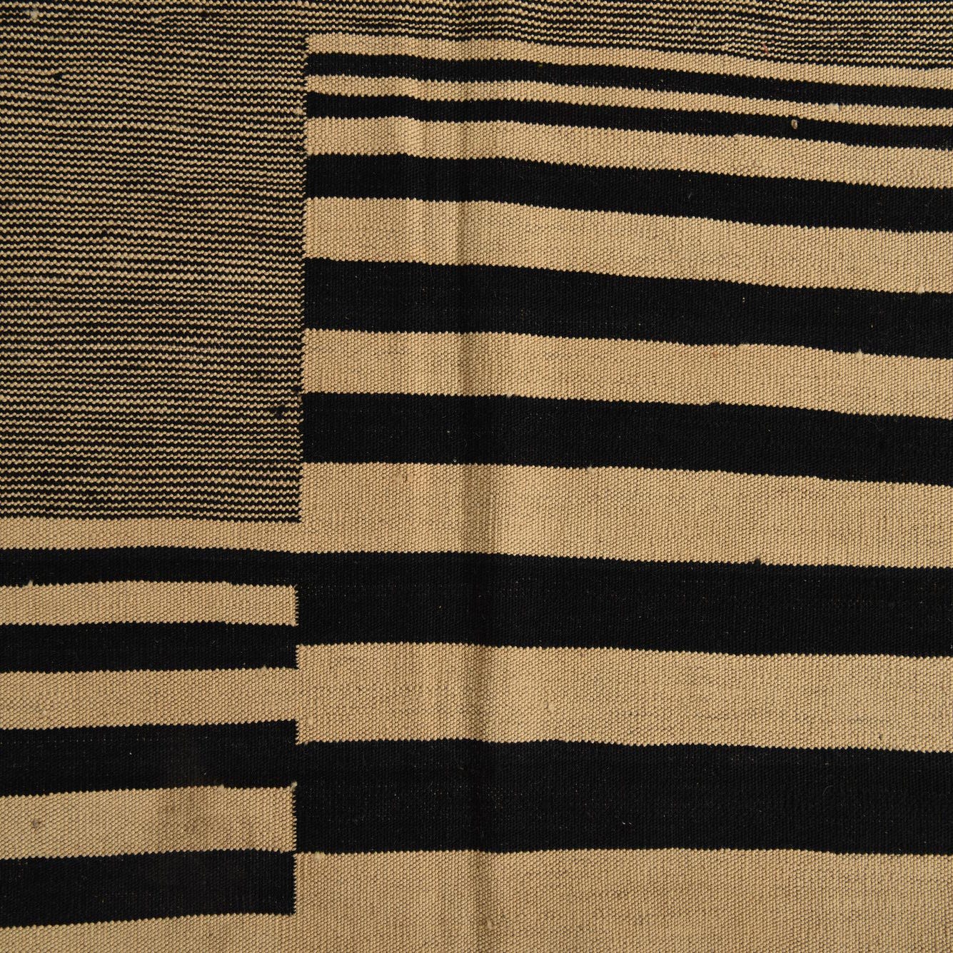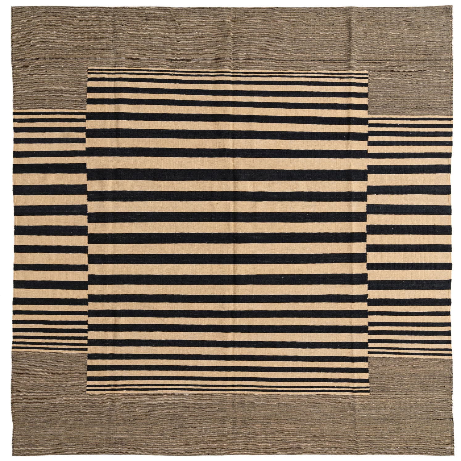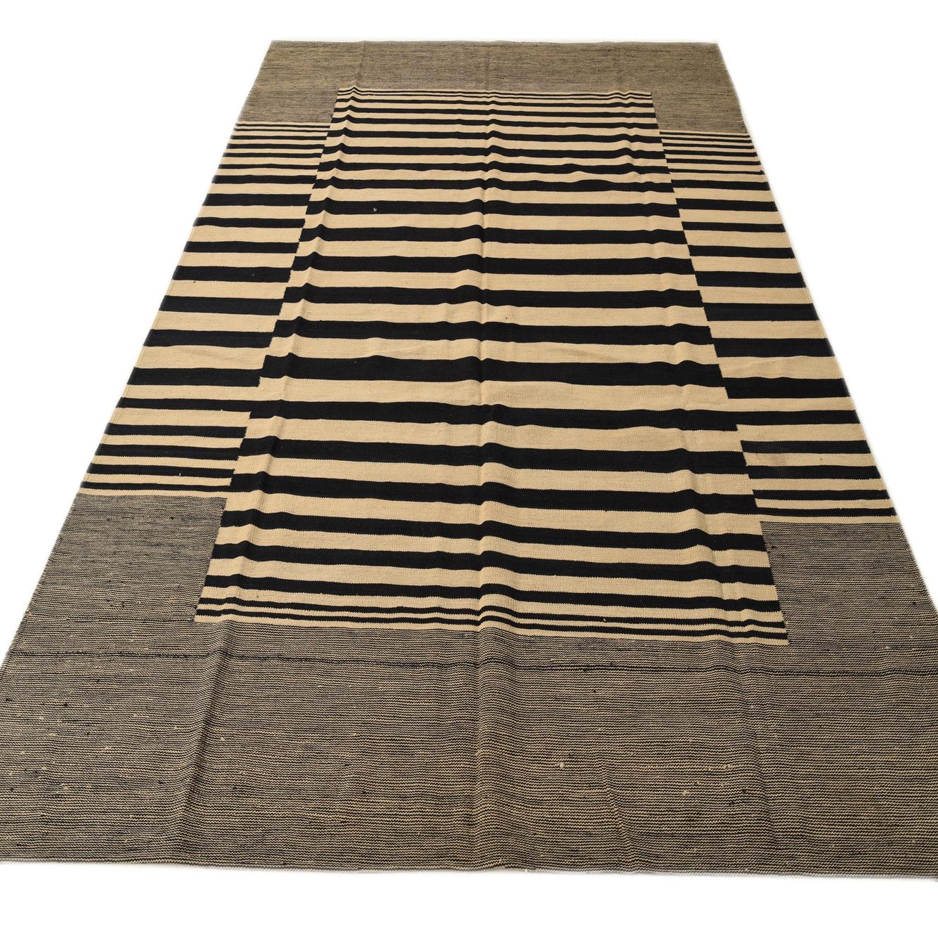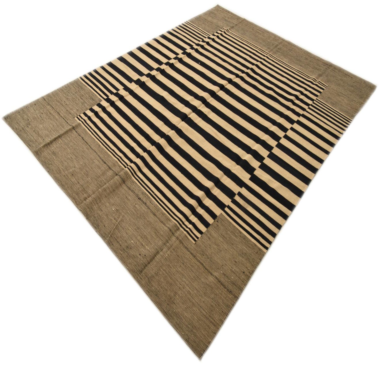 A 7x10 rectangular flatweave Kilim Modern rug featuring bold black and cream stripes with a solid black border.