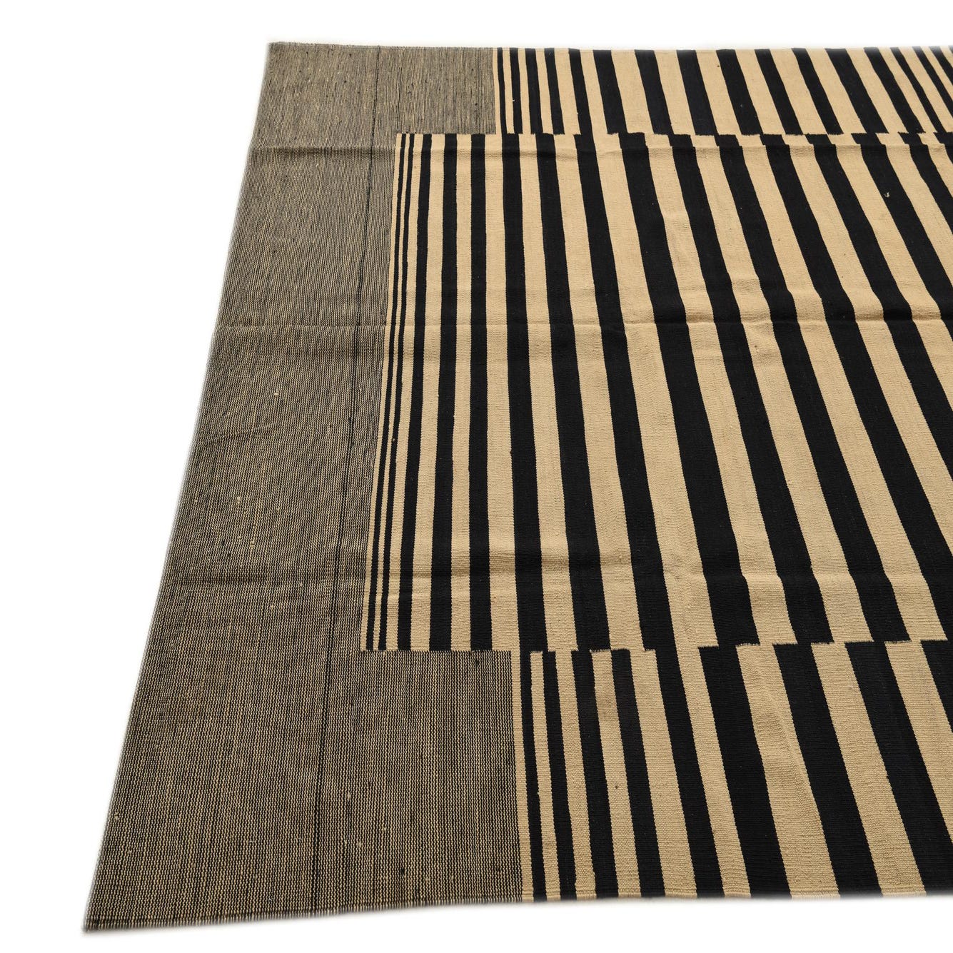 The Kilim Modern Collection offers this hand-woven rug featuring a bold black and white striped pattern that provides a distinctive, yet versatile design. Constructed from 100% wool, this rug offers a flatweave texture that ensures durability and a subtle tactile experience underfoot. The strong visual contrast of the black and white stripes makes it a focal point in any room.