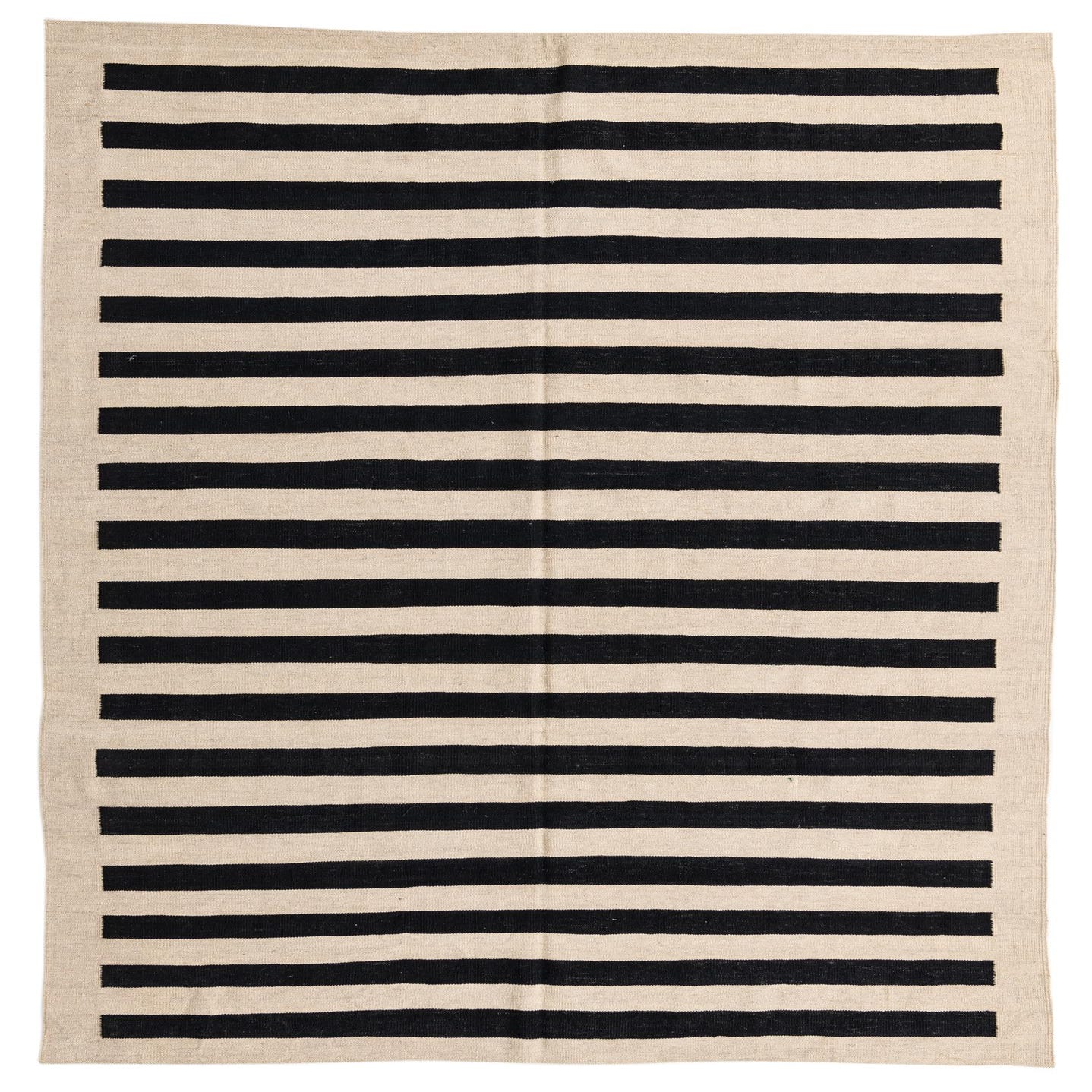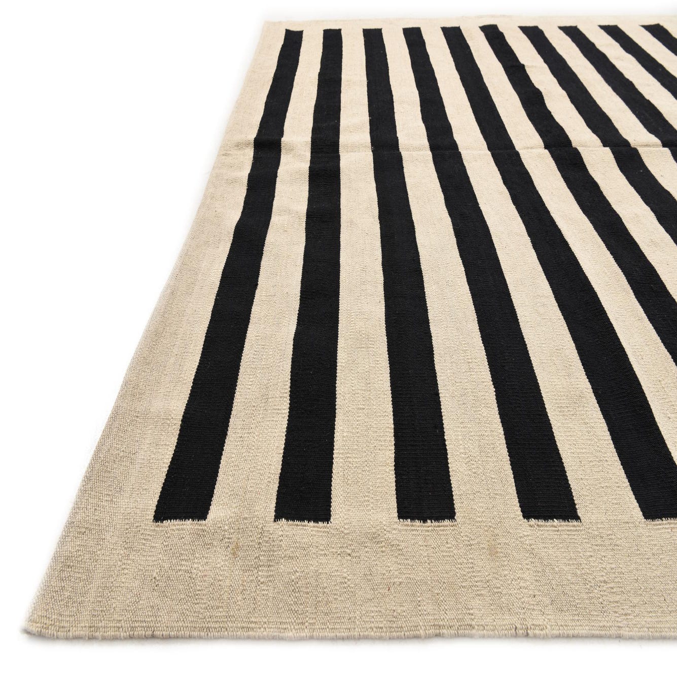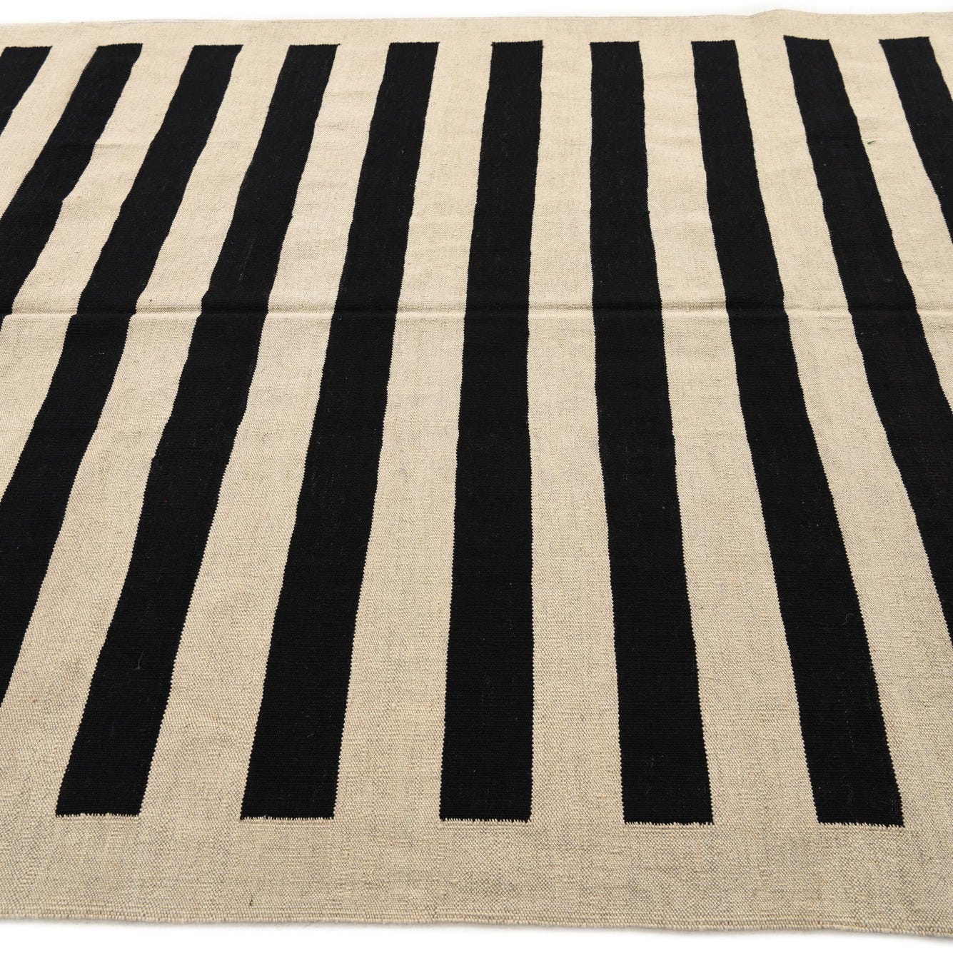 A 7x10 rectangular flatweave wool rug with bold black and cream horizontal stripes, suitable for a modern living room.