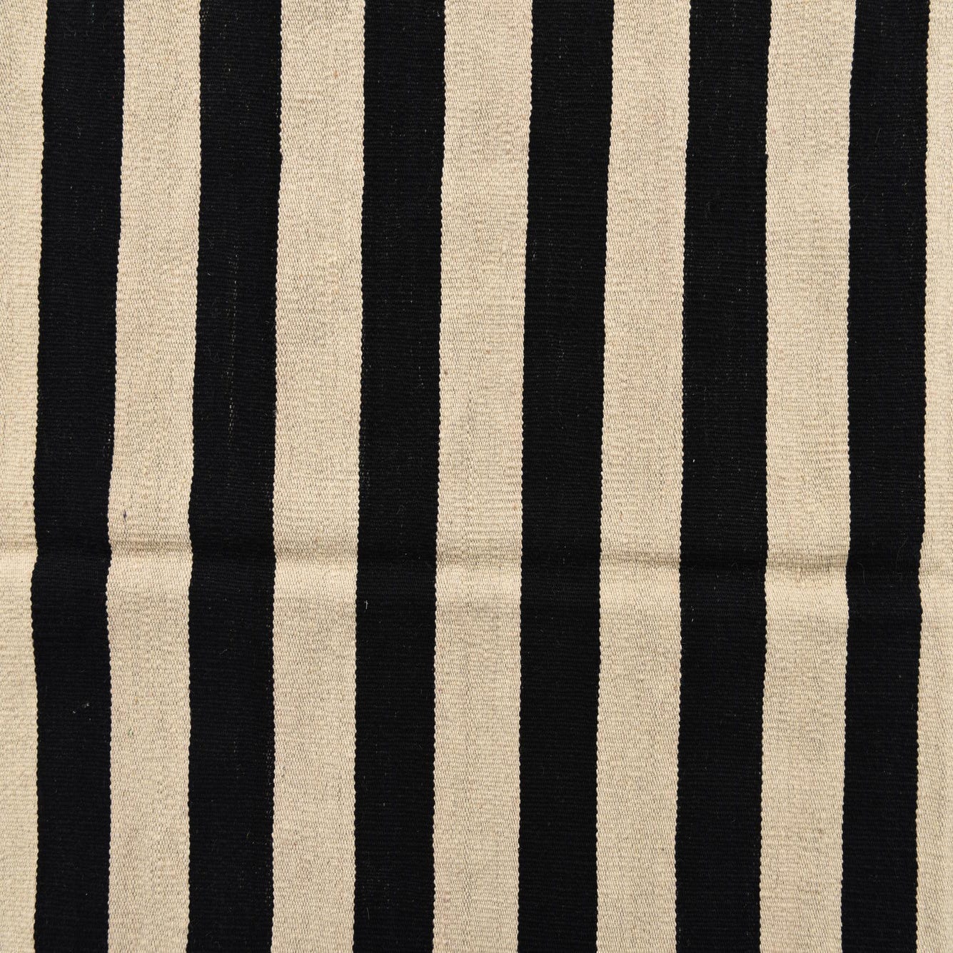A graphic banded pattern of deep black stripes runs across a clean white ground to create a modern, minimalist statement. The horizontal lines are evenly spaced and hand woven into a flatweave structure, giving the design crisp definition with a touch of artisanal irregularity at the edges. The overall look is simple and deliberate, suitable for contemporary and transitional interiors that favor strong, linear geometry.