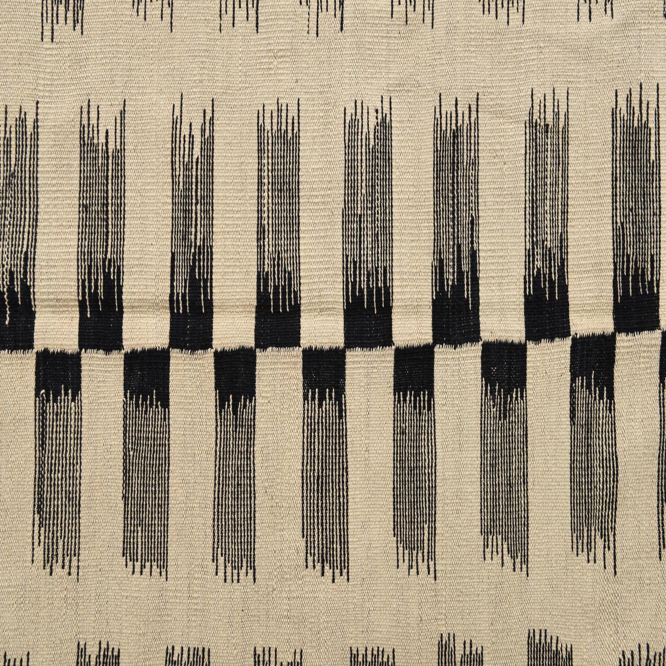 A 7x10 rectangular flatweave Kilim Modern rug featuring a tribal stripe pattern in black and ivory.