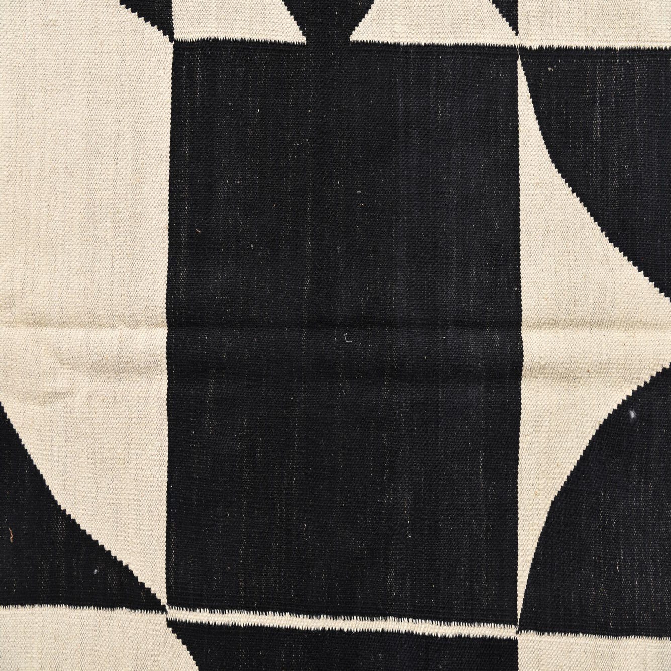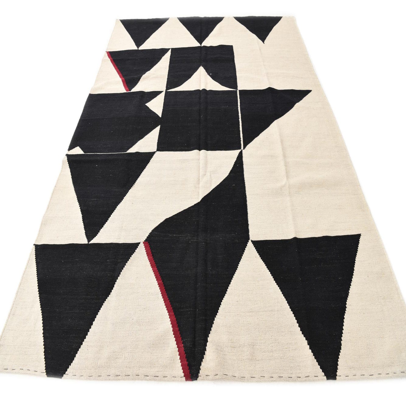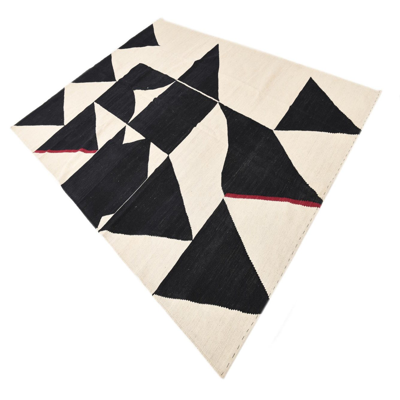A 7x10 rectangular flatweave rug with a bold black and cream geometric tribal pattern, featuring triangles and abstract shapes, with subtle red accents.