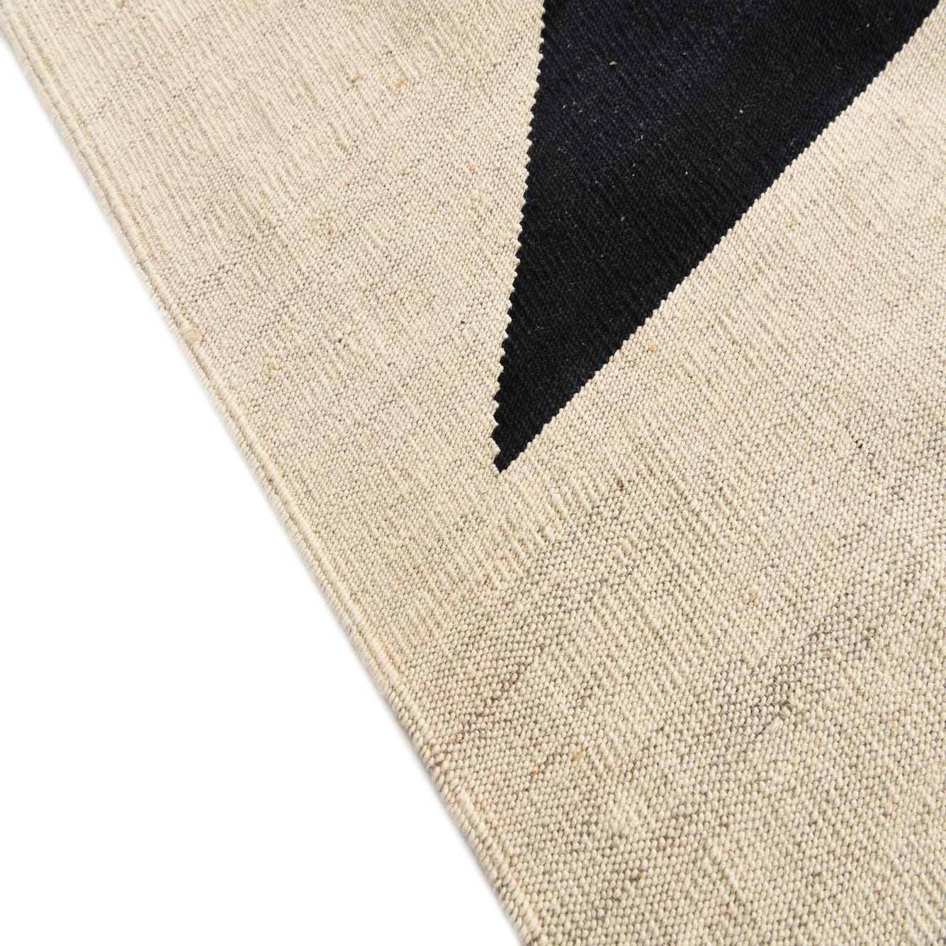 The flatweave texture of this rug is indicative of the Kilim style, providing a durable and smooth surface that is well-suited for high-traffic areas. The minimalist color palette makes it versatile for integrating into existing decor themes, from monochromatic to modernist spaces. This rug could anchor a living room with sleek, modern furniture, enhance a minimalist bedroom with its graphic appeal, or complement a home office where sharp, clean lines are appreciated. The use of natural wool adds a tactile warmth to the rug, soft to the touch while its visual impact remains decidedly modern.