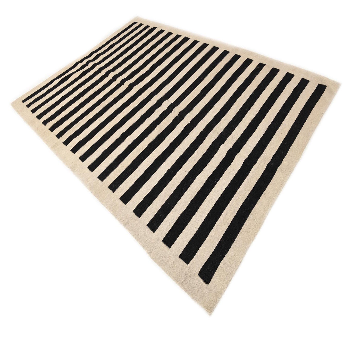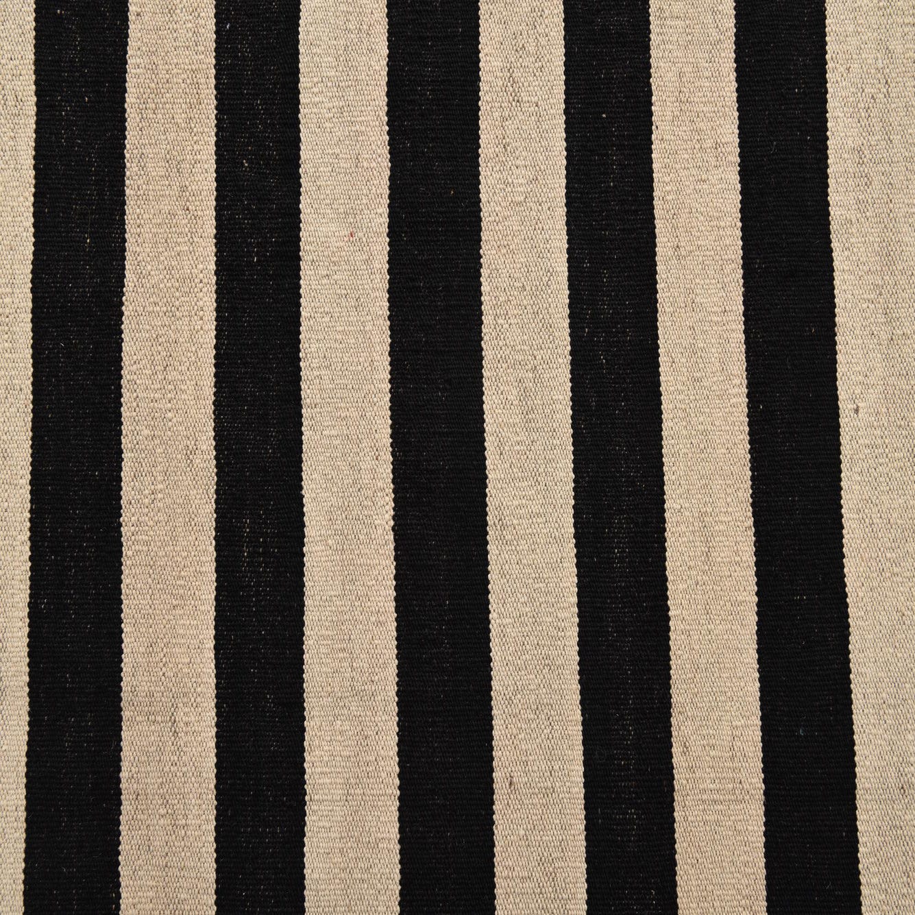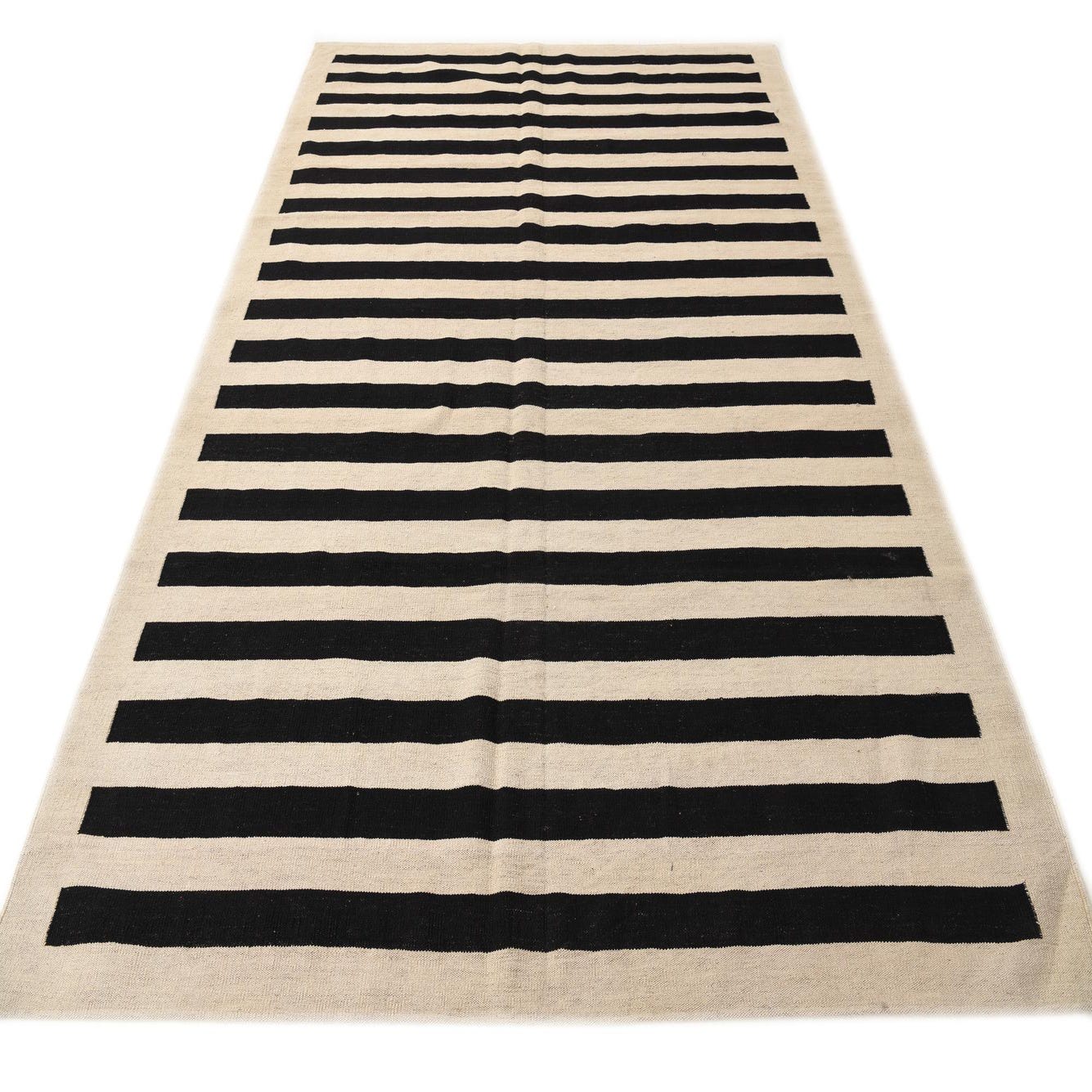 A 7x10 rectangular flatweave rug with bold black and ivory horizontal stripes, perfect for a modern living room.