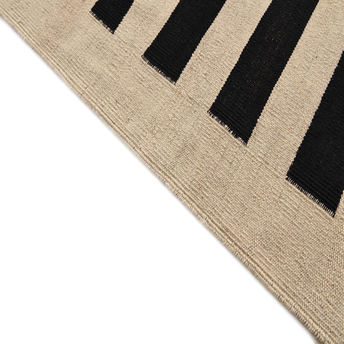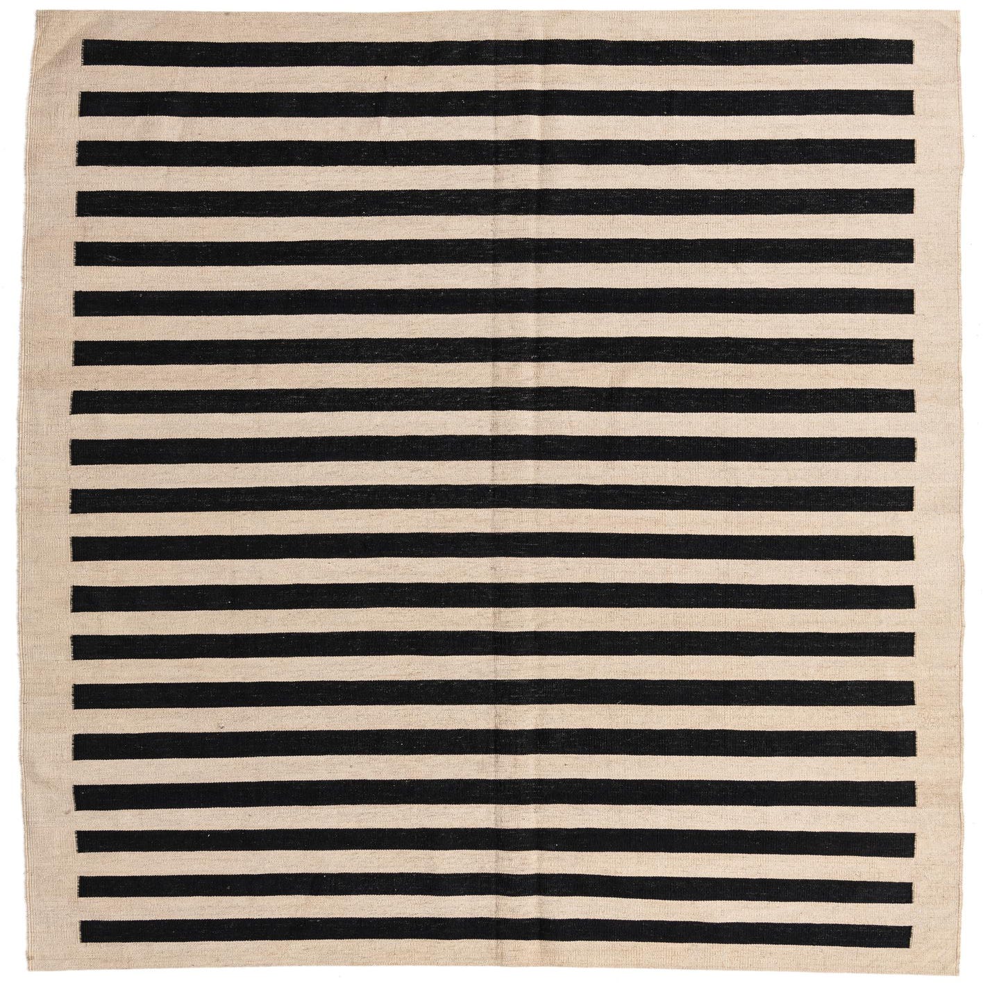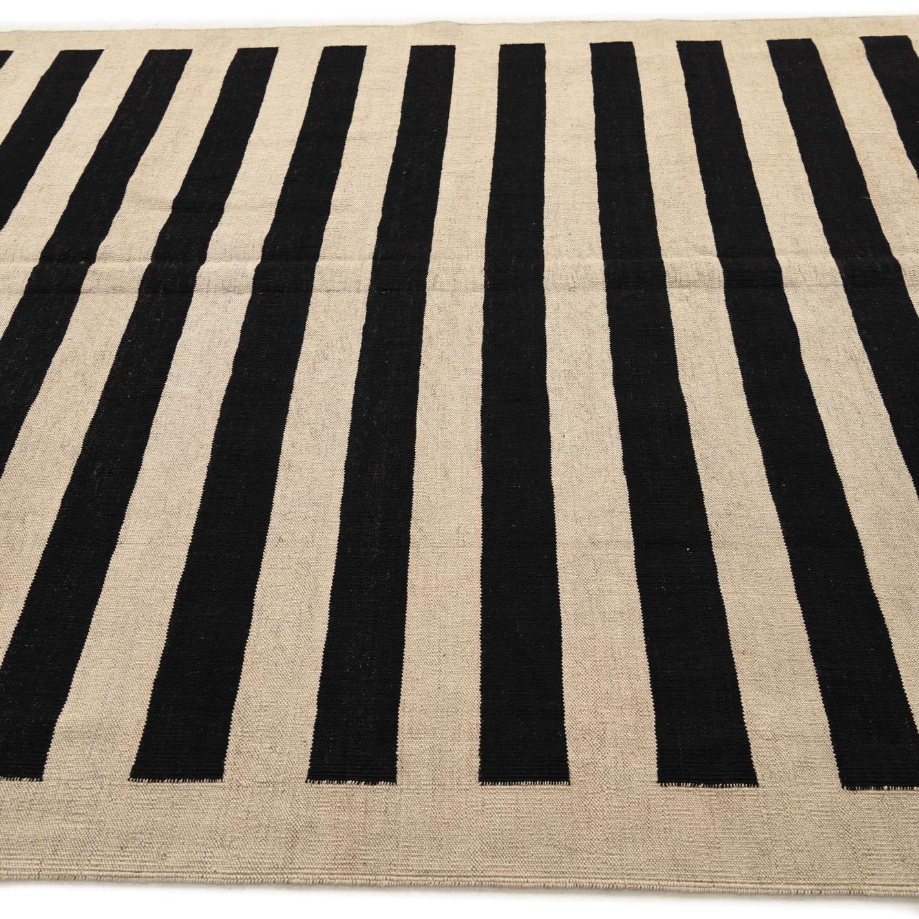 A 7x10 rectangular flatweave rug with bold black and ivory horizontal stripes, perfect for a modern living room.